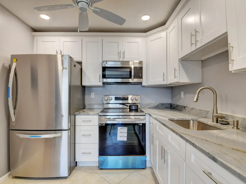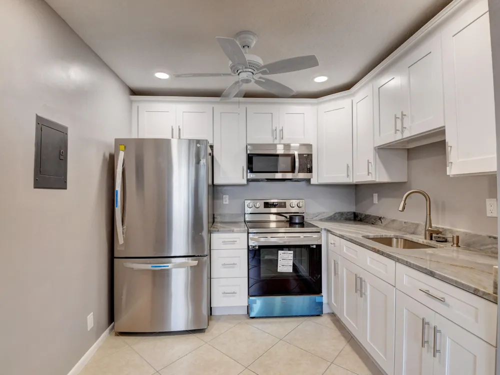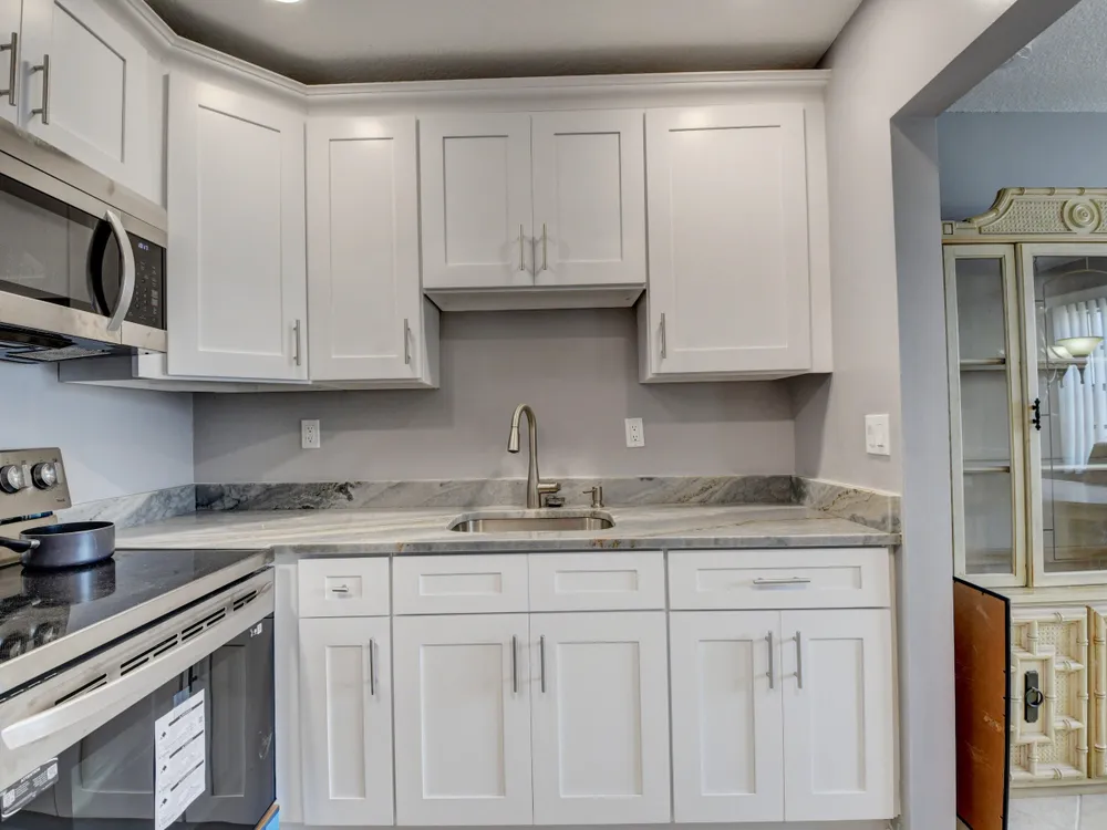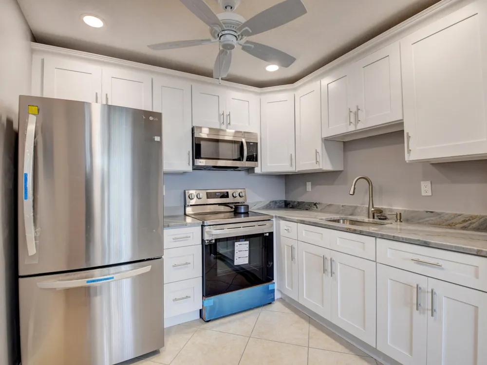 Walking distance to House of Worship remodeled 2nd floor condo. Spacious floor plan with attractive finishes & ample closet space. Gorgeous kitchen features Shaker-style cabinetry, stainless steel appliances. Relax in the spacious owner's suite with direct balcony access & en suite bath with cabinet-style vanity shower/tub combo. Enjoy your covered, screened balcony for a sheltered spot that's perfect for extra seating or dining. You'll love the amenities of Kings Point including two 18-hole golf courses designed by Robert Trent Jones, Sr.; swim & tennis, exercise studio. Enjoy state-of-the-art theatre with spectacular shows plus clubhouse dining in East End Cafe & The Bistro. Manned gate, security features & courtesy shuttle for comfort & convenience.