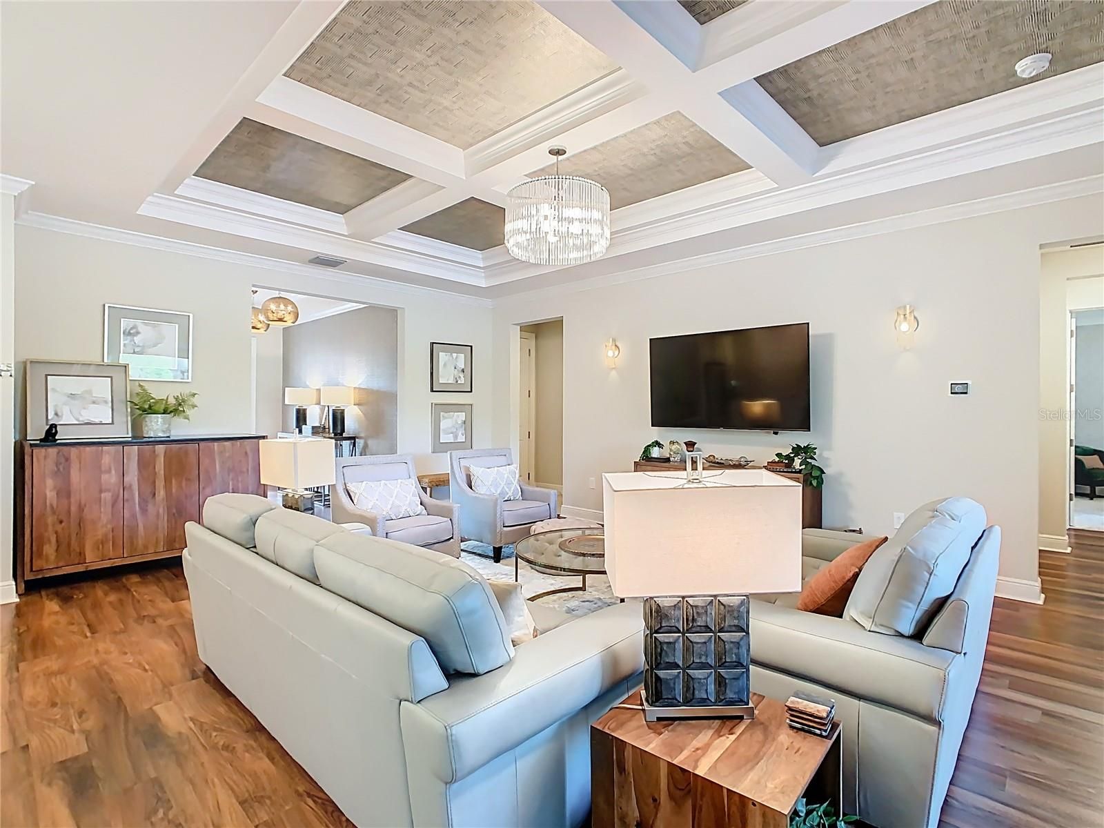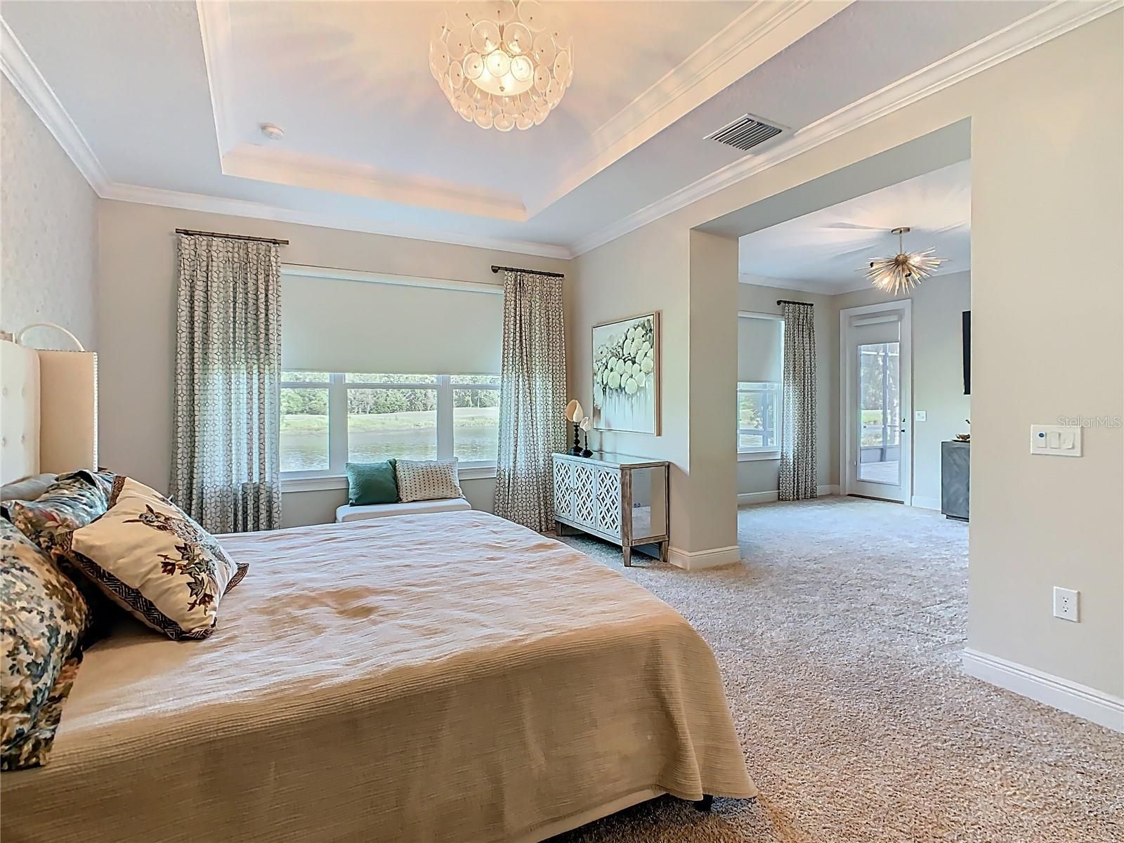 - Ceiling Fan(s), Coffered Ceiling(s), Crown Molding, High Ceilings, Open Floorplan, Main Level Primary, Split Bedrooms, Thermostat, Tray Ceiling(s), Walk-In Closet(s), Window Treatments