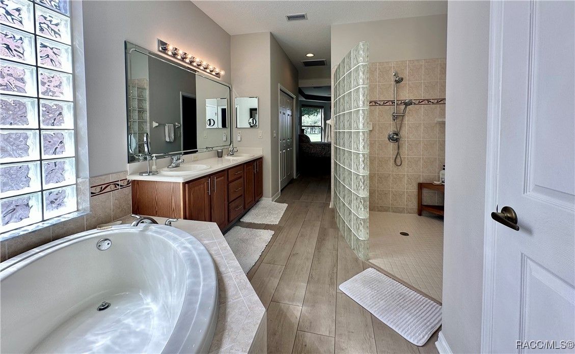 - Breakfast Bar, Bookcases, Bathtub, Tray Ceiling(s), Dual Sinks, Eat-in Kitchen, High Ceilings, Jetted Tub, Main Level Primary, Primary Suite, Open Floorplan, Pantry, Solid Surface Counters, Separate Shower, Tub Shower, Walk-In Closet(s), WoodCabinets, Window Treatments, Atrium, First Floor Entry, Programmable Thermostat