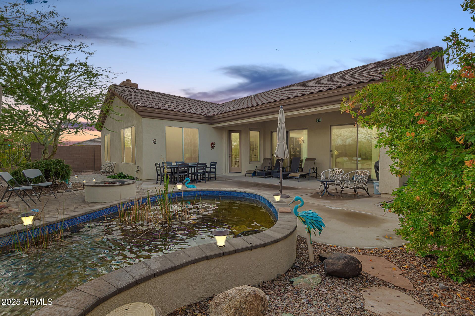Come see this gorgeous property located inside the guard gated Anthem Country Club Community. This home features 3 beds plus a den/office, 2 baths, a spacious 2 car garage and a gourmet kitchen with separate wet bar and wine rack. The backyard is the best part with a view fence of natural desert behind you and no homes, giving you a serene feeling of privacy, plus beautiful views and the enjoyment to watch for desert wildlife. The backyard features a large pavered covered patio, added concrete with built in firepit and a beautiful and peaceful flowing pond for birds to enjoy. As you step inside this home, you will notice the care and quality throughout. Discover a large family room with high ceilings, cozy fireplace, and plenty of room to entertain family and friends. The gourmet kitchen comes with granite counters, ample wood cabinetry with crown molding, designer tile backsplash, stainless steel appliances including a gas range, and a peninsula with a breakfast bar. Enjoy the additional a wet bar and wine cabinets, plus nice pantry with door. Enjoy an open concept den or office that can also be used as a lounge if desired. The primary bedroom showcases separate sliding door access to the backyard, an en-suite bath with dual sinks, a large garden soaking tub with tile decking, a full-size walk-in shower, and a large walk-in closet. There are 2 additional oversized bedrooms that provide plenty of space for guests or kids, plus both bedrooms are right near the 2nd full bath for easy access. Additional features include a new Platinum Quality Water Softener System in 2025, Added attic insulation in 2022, exterior stucco maintenance, All brand-new exterior designer paint in 2023, and a new 50-gallon water heater installed in 2023. Bedrooms 2 and 3 have the added energy benefits of Anderson Renewal Windows installed in 2025. The Sprinkler system underground waterlines were also recently replaced as well. Enjoy the benefits too of Anthem Country Club with all the amenities you could desire with tennis, pickleball, workout room, restaurant, golf, walking paths by lake, and so much more! All of this in an exclusive guard gated community that is highly desired and professionally maintained. Come see this beautiful home and backyard before it is gone.
