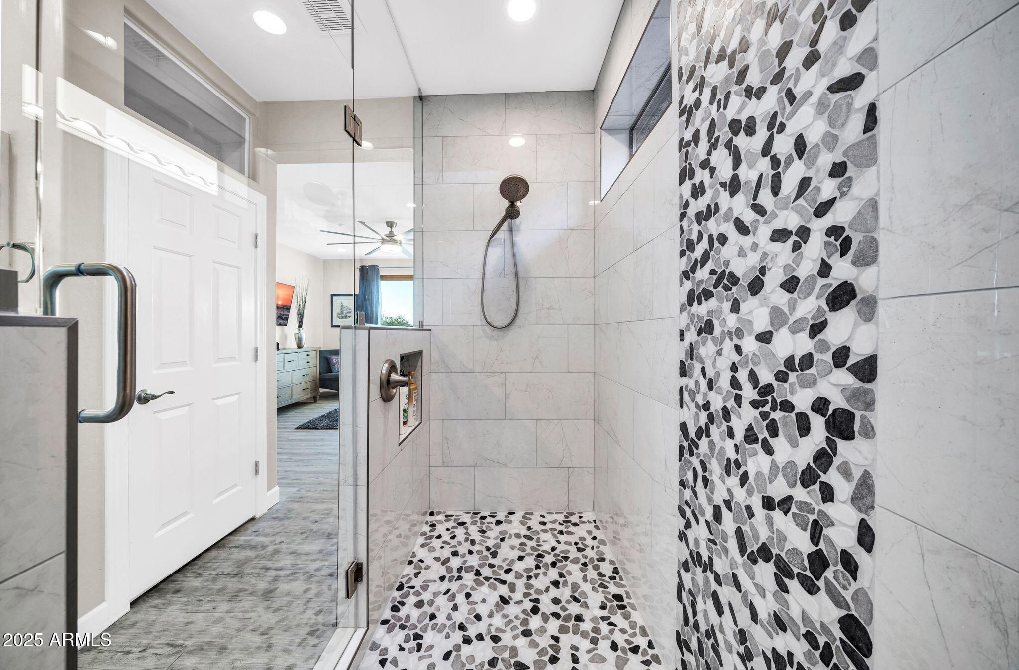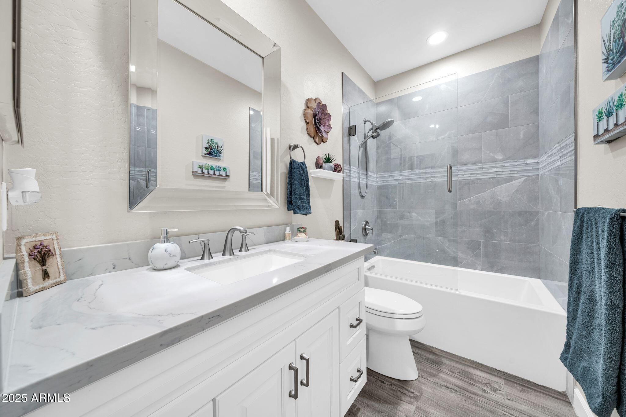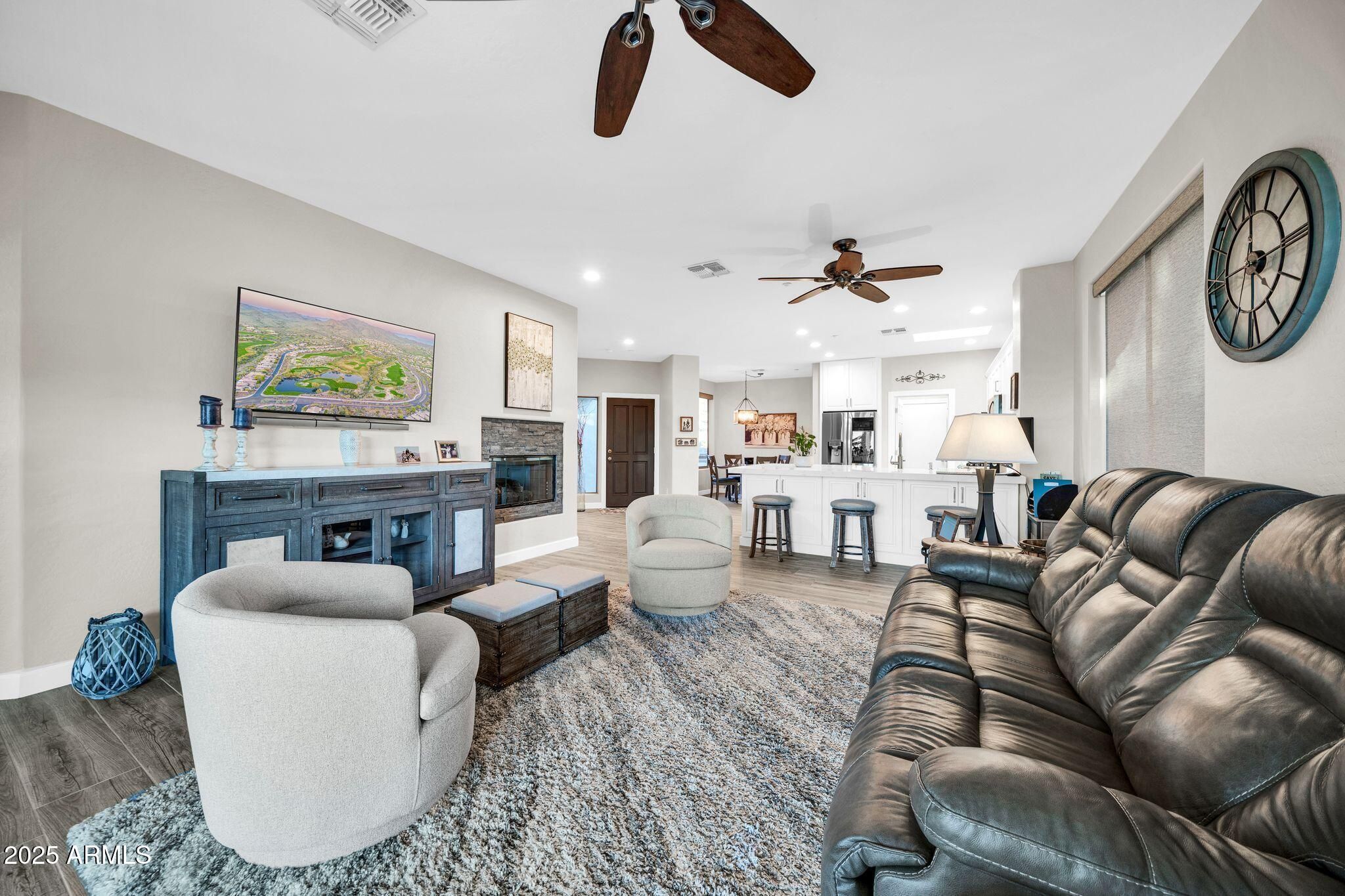 From the moment you step inside, this beautifully remodeled 2-bedroom home—complete with a private office—feels warm, inviting, and thoughtfully updated. Sunlight highlights the new tile floors, fresh paint, crisp baseboards, and soft-close cabinetry, while modern LED lighting adds a gentle glow throughout. The custom kitchen stands out as the heart of the home with its quartz countertops, brand-new appliances, and elegant chandelier. The living room offers a comfortable gathering space enhanced by an updated fireplace, and the private office—framed by French doors—provides an ideal place for work or creativity. Both bathrooms have been redesigned into serene retreats. The primary suite features a luxurious custom super shower, lighted mirror, and a new sliding door that leads directly to the hot tub and opens to peaceful backyard and golf course views. The secondary bathroom offers a relaxing soaking tub. Step outside to your private oasis: a stunning new pool with a soothing waterfall, customizable LED lighting, Baja shelf, and integrated hot tuball fully Wi-Fi controlled. The backyard also includes a travertine patio, motorized sunscreen, and lush landscaping set against mountain and fairway backdrops. Behind the scenes, major upgrades ensure long-term comfort and efficiency, including a new roof, skylights, HVAC system with smart thermostat, water heater, water softener, hot water re-circulator, and fresh exterior paint. Located within the gated Anthem Country Club community, residents enjoy access to two clubhouses, two championship golf courses, fitness centers, fine dining, tennis, pickleball, and resort-style pools all within a highly sought-after, guard-gated environment.