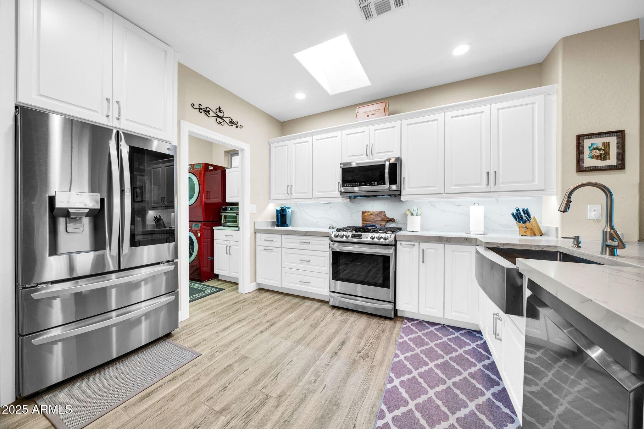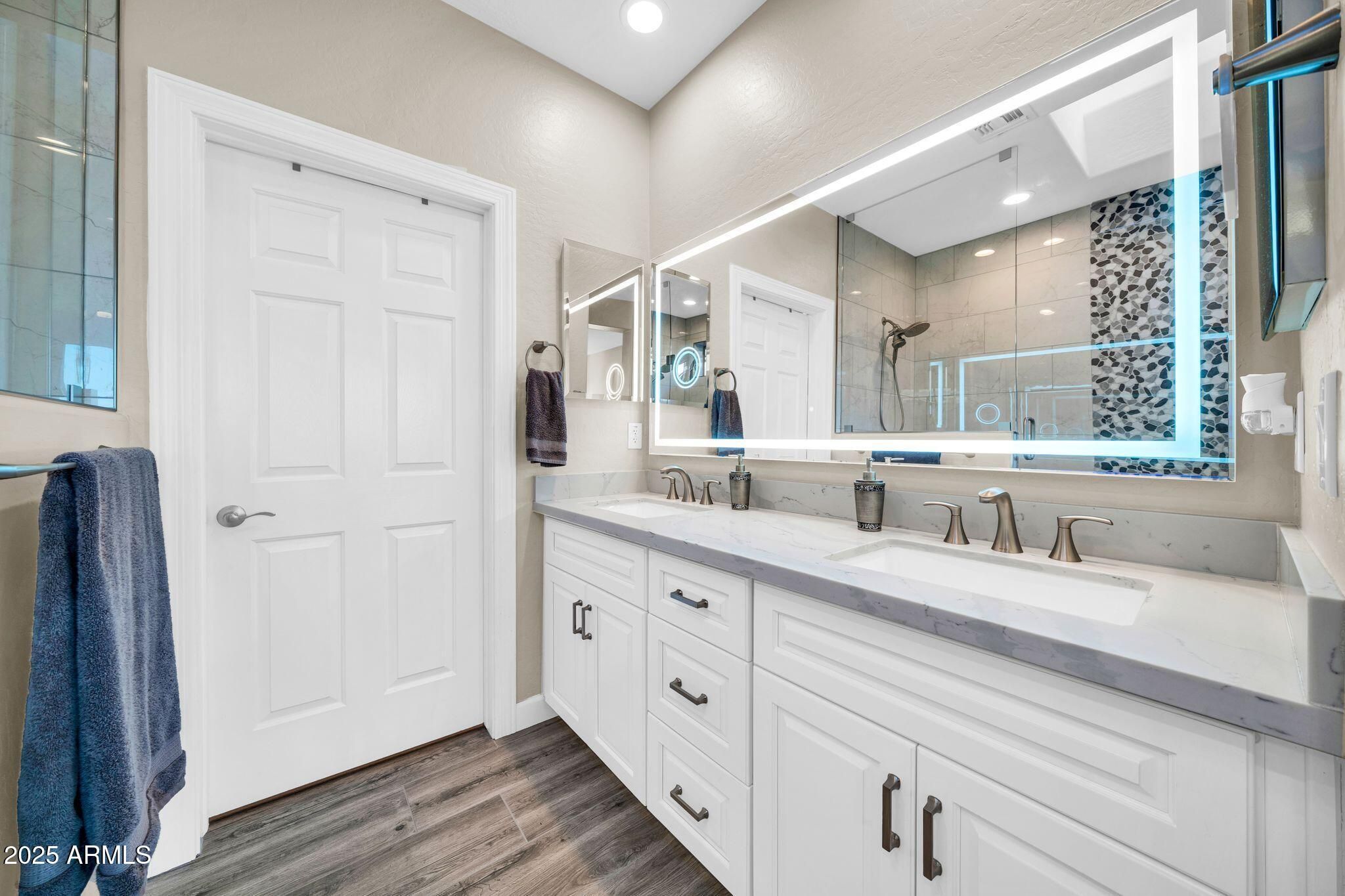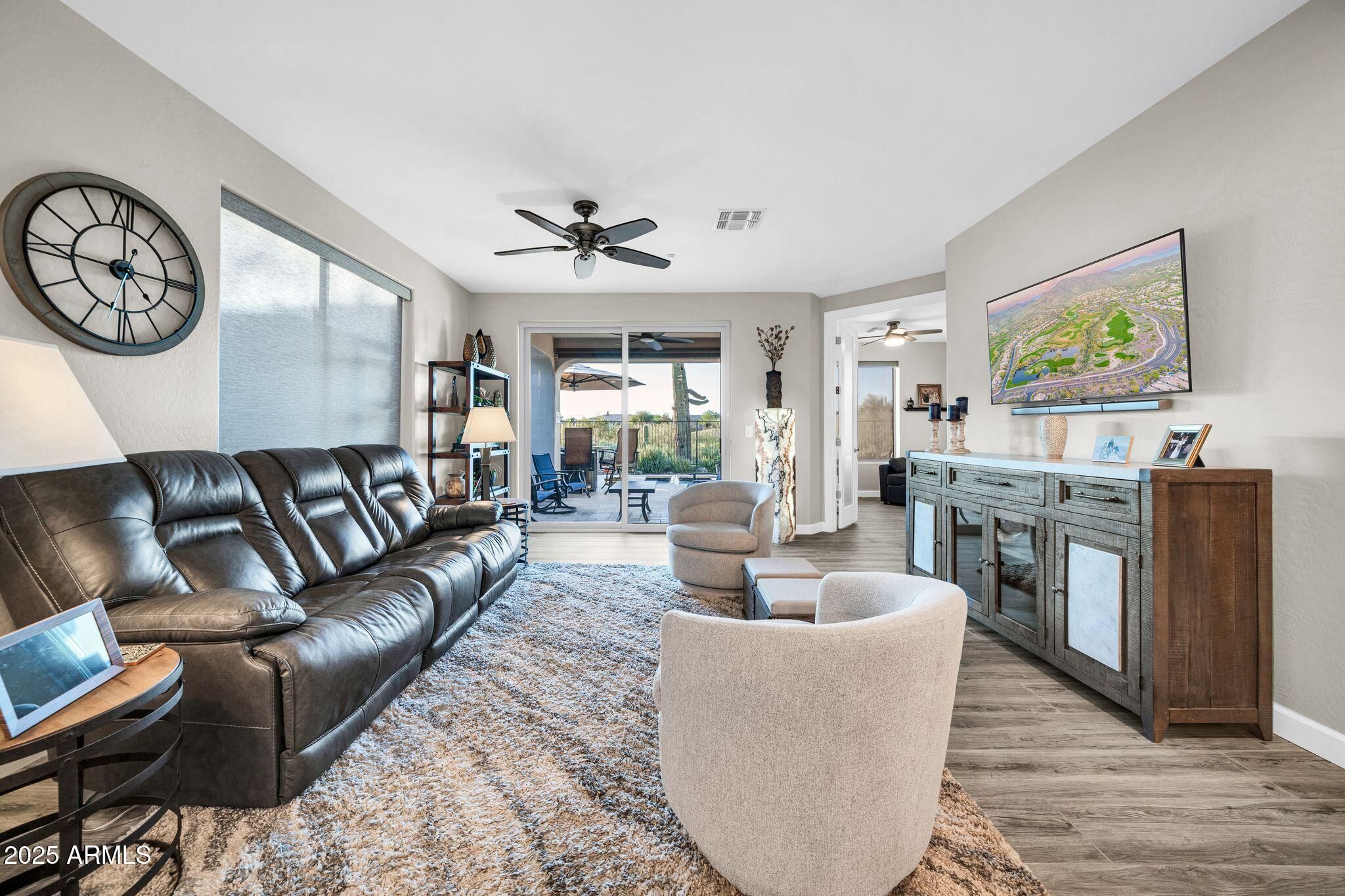 From the moment you step inside, this beautifully remodeled 2-bedroom home—complete with a private office—feels warm, inviting, and thoughtfully updated. Sunlight highlights the new tile floors, fresh paint, crisp baseboards, and soft-close cabinetry, while modern LED lighting adds a gentle glow throughout. The custom kitchen stands out as the heart of the home with its quartz countertops, brand-new appliances, and elegant chandelier. The living room offers a comfortable gathering space enhanced by an updated fireplace, and the private office—framed by French doors—provides an ideal place for work or creativity. Both bathrooms have been redesigned into serene retreats. The primary suite features a luxurious custom super shower, lighted mirror, and a new sliding door that leads directly to the hot tub and opens to peaceful backyard and golf course views. The secondary bathroom offers a relaxing soaking tub. Step outside to your private oasis: a stunning new pool with a soothing waterfall, customizable LED lighting, Baja shelf, and integrated hot tuball fully Wi-Fi controlled. The backyard also includes a travertine patio, motorized sunscreen, and lush landscaping set against mountain and fairway backdrops. Behind the scenes, major upgrades ensure long-term comfort and efficiency, including a new roof, skylights, HVAC system with smart thermostat, water heater, water softener, hot water re-circulator, and fresh exterior paint. Located within the gated Anthem Country Club community, residents enjoy access to two clubhouses, two championship golf courses, fitness centers, fine dining, tennis, pickleball, and resort-style pools all within a highly sought-after, guard-gated environment.