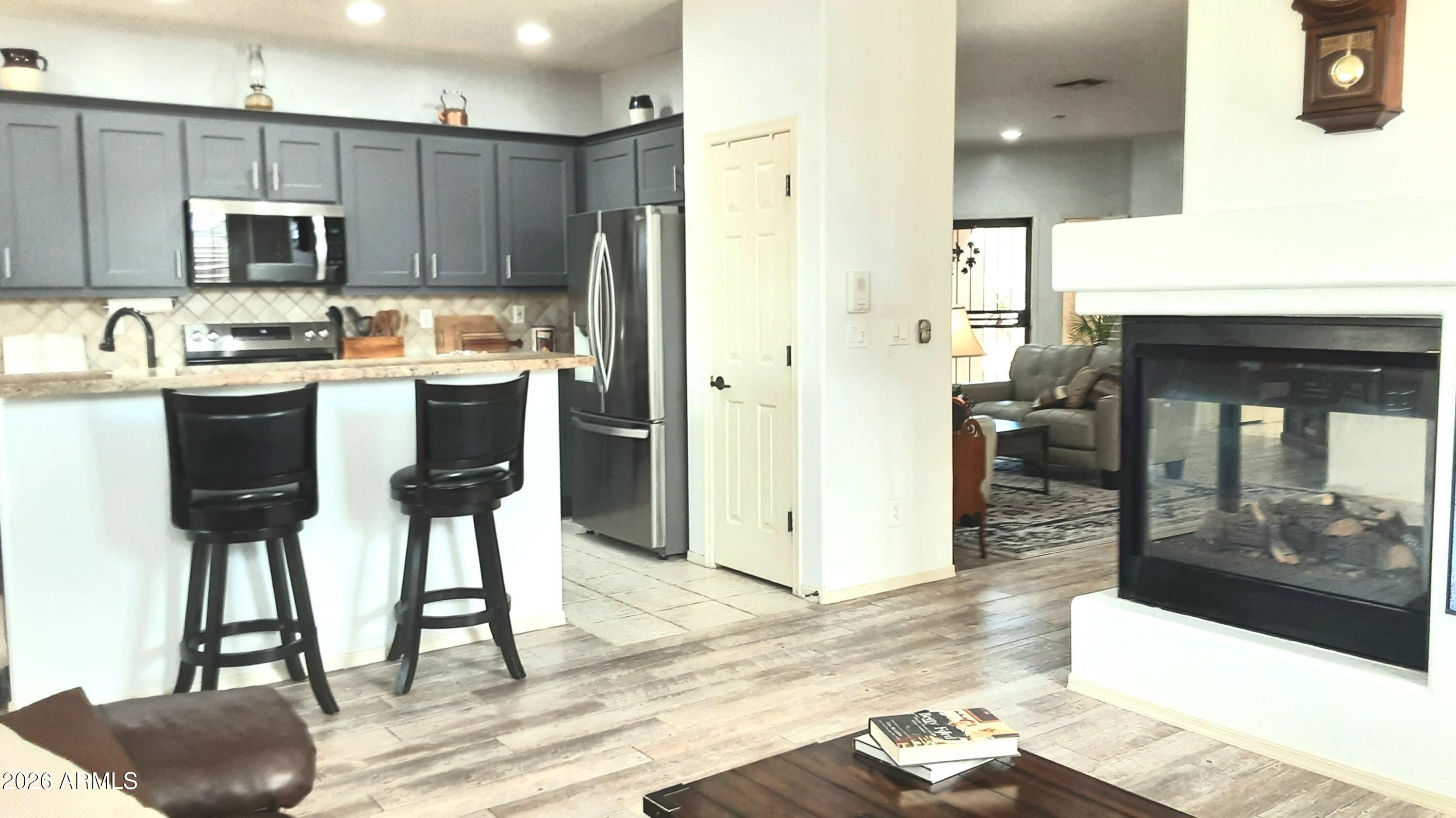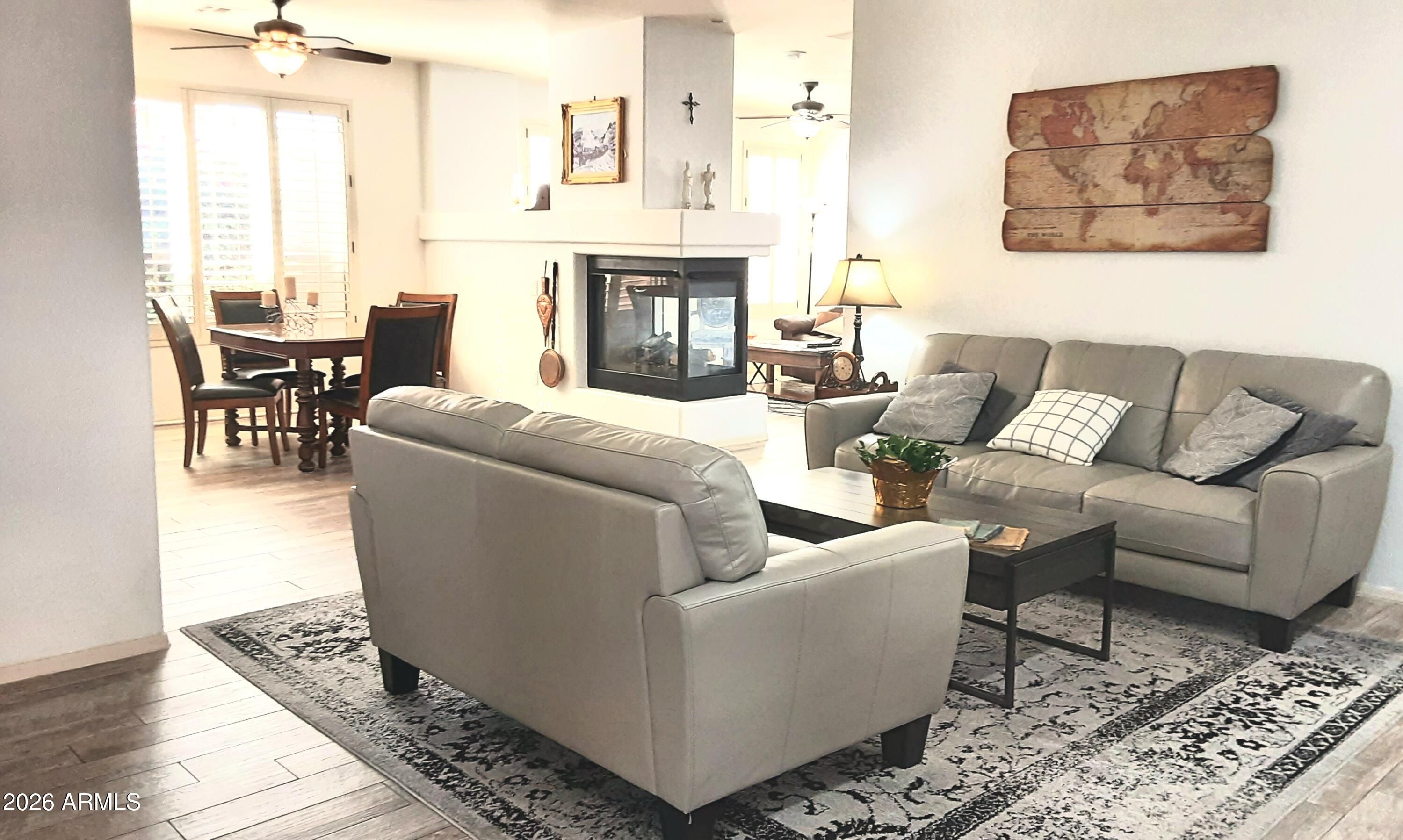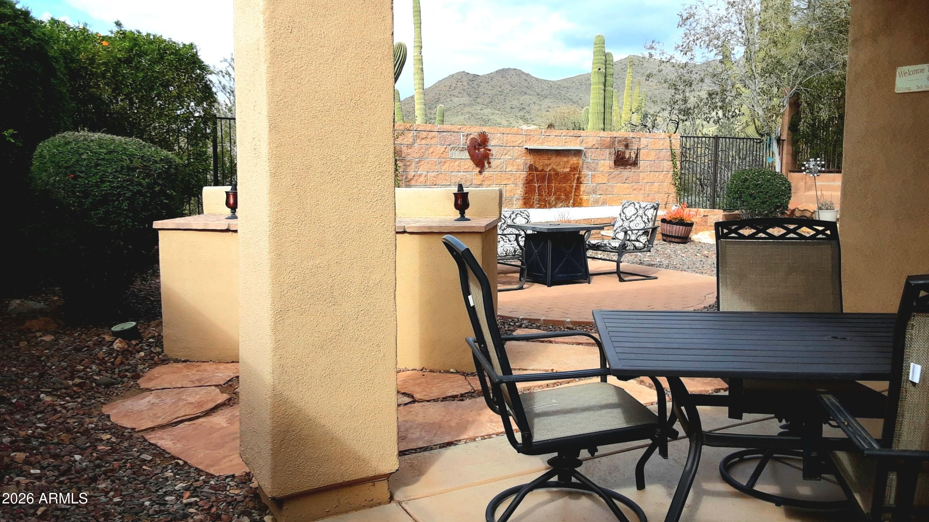 Welcome to the kind of home people move to Anthem Country Club for. Backing a natural desert wash with open mountain views, this single‑level retreat blends privacy, beauty, and effortless living. Owner is currently replacing roof underlyment this week. Inside, warm faux wood flooring and plantation shutters frame a bright, open layout anchored by a see‑through fireplace. The fully remodeled 2023 kitchen feels fresh and modern with new cabinetry, granite counters, stainless appliances, and thoughtful pull‑out storage. Step outside and the home truly shines: an extended paver patio, a 15‑foot water feature, and view fencing create a tranquil outdoor living space perfect for sunset dinners, morning coffee, or hosting friends after a round of golf. The split primary s generous walk-in closet. With a 2018 HVAC, epoxy garage, and low maintenance landscaping, this is a true lock and leave home designed for ease. All within Anthem Country Club a gated, resort style community with golf privileges, fitness centers, pools, dining, and a full social calendar. This is where lifestyle meets comfort.