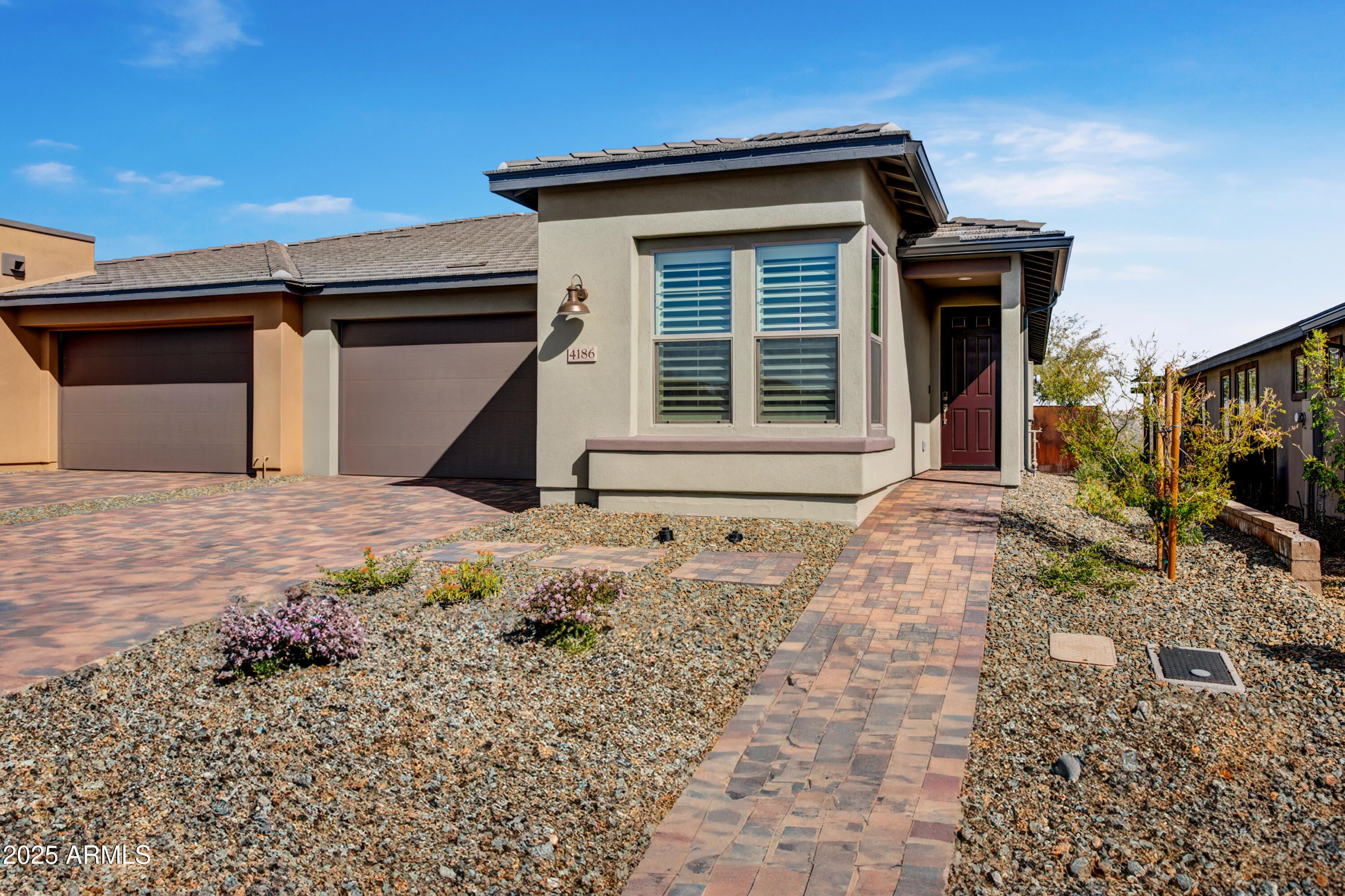 Gorgeous Duet Series Evia floorplan in the Palomino neighborhood offering panoramic desert & mountain views! This 1,552 sq ft home features 2 beds, 2 baths & stylish upgrades throughout. The gourmet kitchen includes Fantasy Silver Satin granite, Sage-stained maple cabinetry, GE Profile appliances, Monogram wine chiller & LED under-cabinet lighting. Great room opens to a 12-ft multi-slide door & covered patio for seamless indoor-outdoor living. Enjoy quartz bath counters, heavy glass shower, brushed nickel fixtures, upgraded tile flooring, ceiling fans, smart wiring & platinum landscaping. Located in Trilogy Wickenburg Ranch—where luxury, comfort & views meet desert perfection.