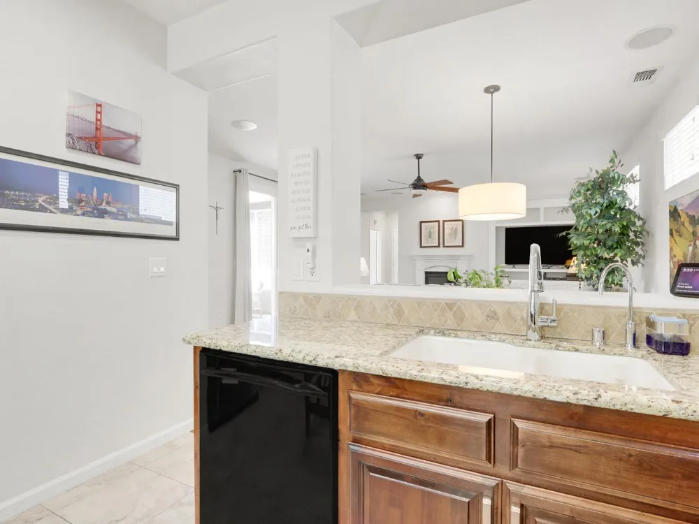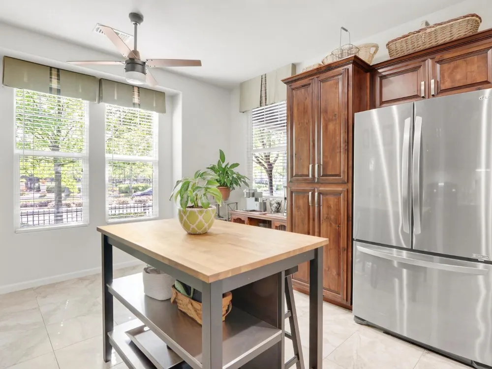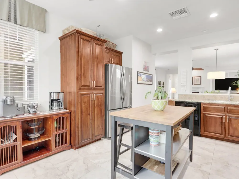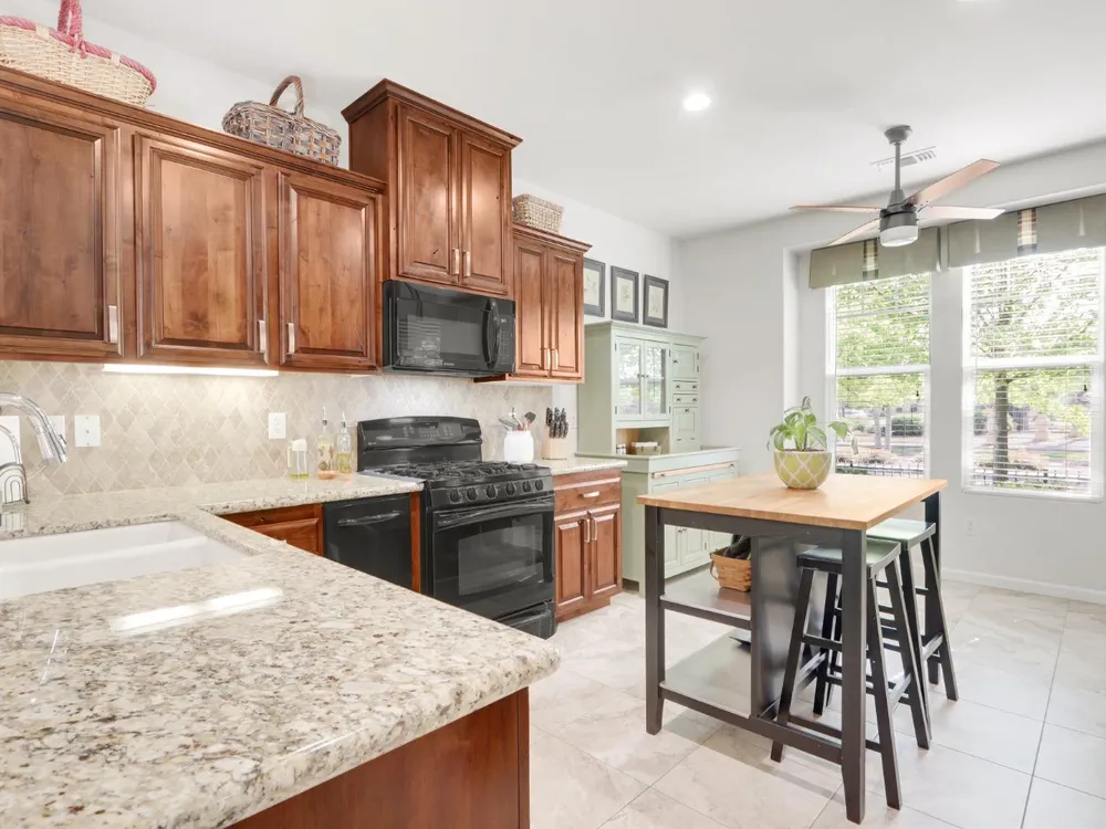 Welcome to this charming and thoughtfully designed bungalow, ideally situated in the highly desirable 55+ active adult community. Located directly across from the resort-style clubhouse, this home offers easy access to a vibrant lifestyle filled with amenities, social opportunities, and leisure activities. Inside, you'll find a bright and spacious open floor plan featuring soaring ceilings, abundant natural light, and a cozy gas fireplace that creates a warm and inviting ambiance. The chef's kitchen is the heart of the home, beautifully appointed with rich wood cabinetry, elegant granite slab countertops, premium appliances, and a versatile portable islandperfect for cooking and entertaining alike. The kitchen flows seamlessly into the dining area and expansive great room, making everyday living and hosting a breeze. The primary suite is a peaceful retreat, complete with courtyard views, a spa-like en-suite bathroom with dual vanities, and a generous walk-in closet. A second bedroom with double doors offers flexibility ideal as a guest room, den, or home office with an adjacent full bathroom for added comfort and convenience. Step outside to a secluded courtyard a serene space perfect for gatherings, complete with its own cozy fireplace. This is a wonderful opportunity.