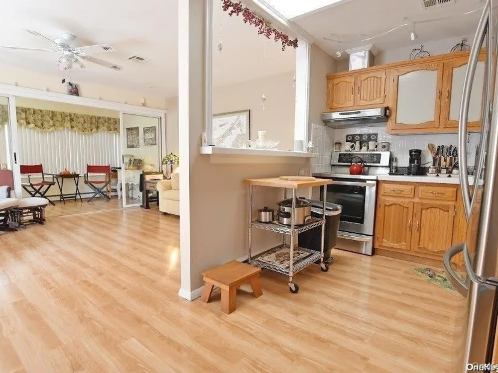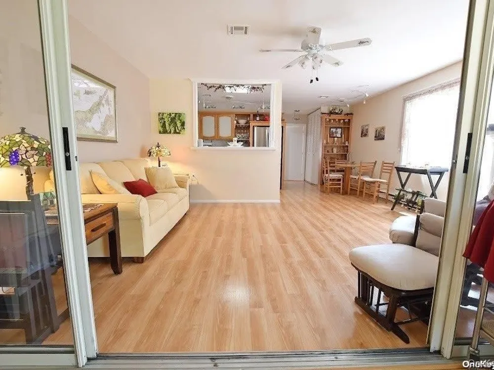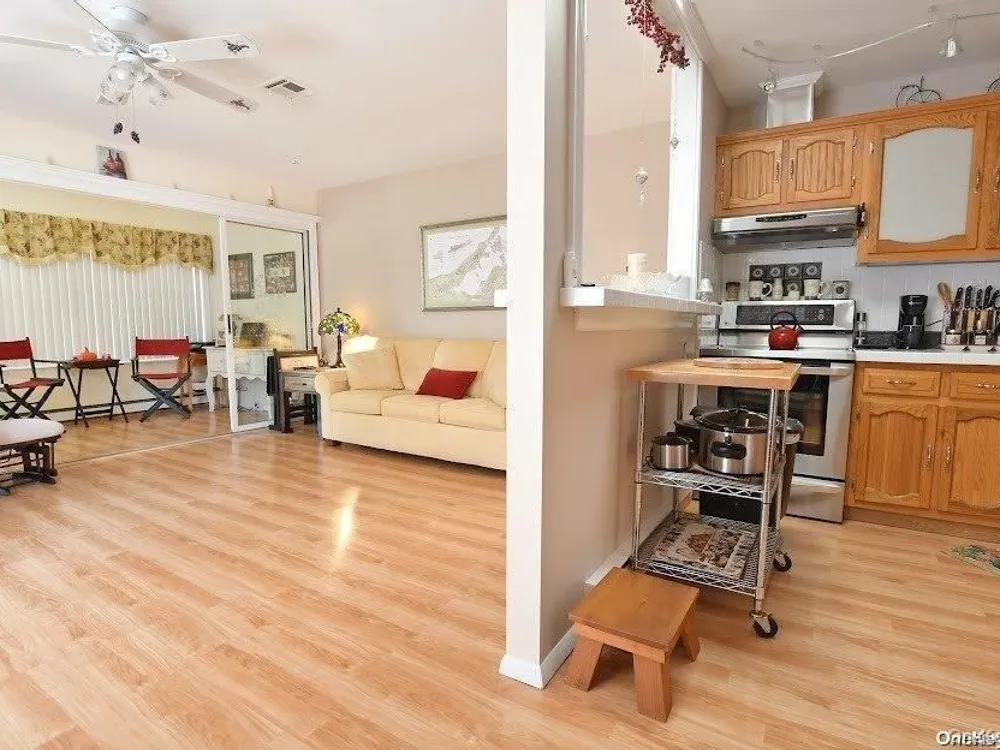 Step into this bright & spacious corner unit featuring an open floor plan that makes this small manageable home feel much larger. The enclosed porch has been transformed w/wall-to-wall glass sliders & the kitchen boasts a large opening that provides a clear view to the back of the home enhancing the space for entertaining & everyday enjoyment. Features included:A brand-new electrical panel, Stylish laminate flooring, Solid wood kitchen cabinetry w/ss appl, A skylight solar tube for added natural light, An electric fireplace, A king-sized bedroom w/double closets for ample storage. Community offers an active lifestyle w/amenities such as an executive 9-hole golf course, a heated pool & a clubhouse that hosts dinner dances, concerts, seminars & more. Enjoy the fitness room, cards & billiards, sewing & crafts, a workshop, a library, & over 40 clubs to join. Located near beaches, vineyards, shopping, & 5-star restaurants, this gated community has everything you need to live your best life!
