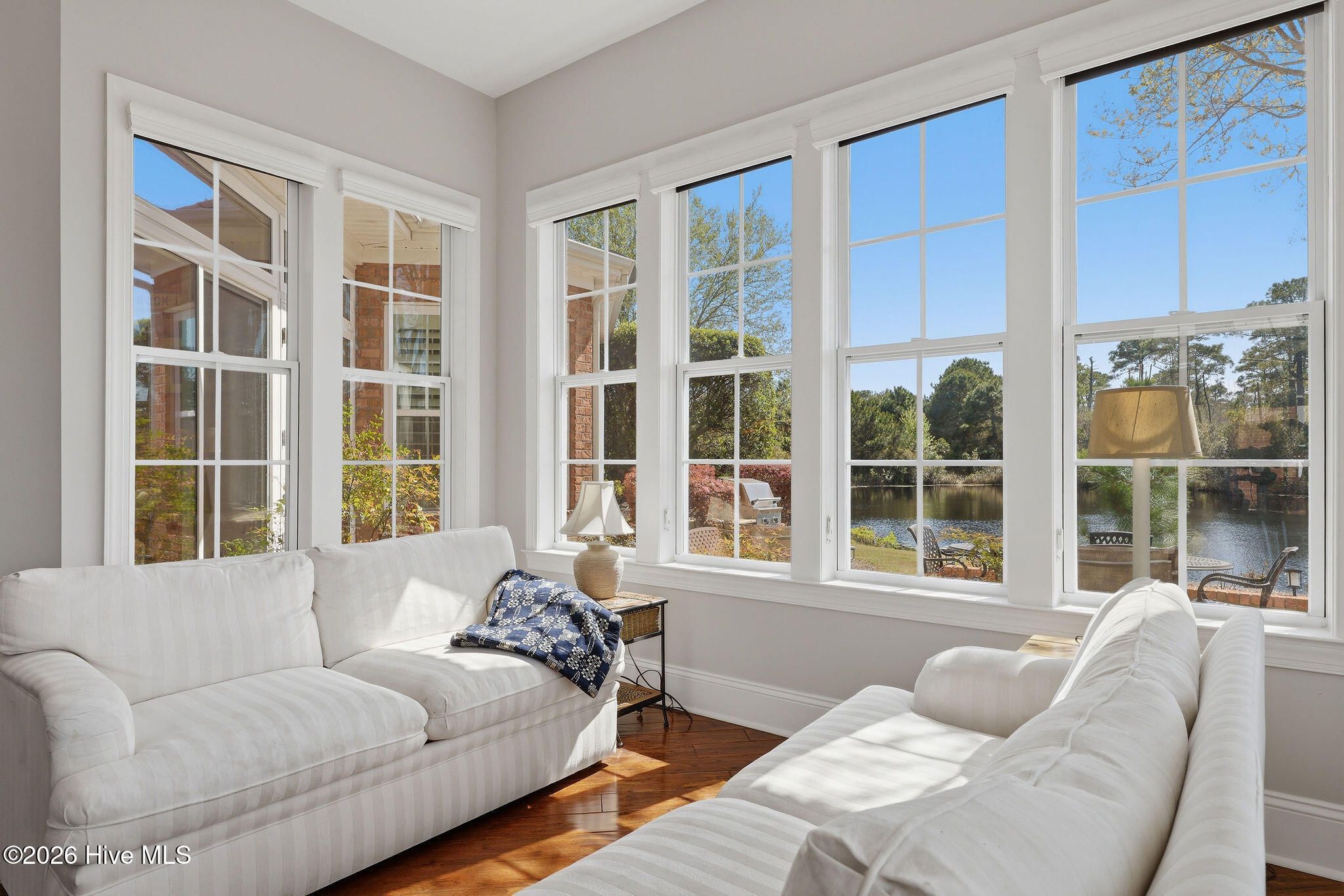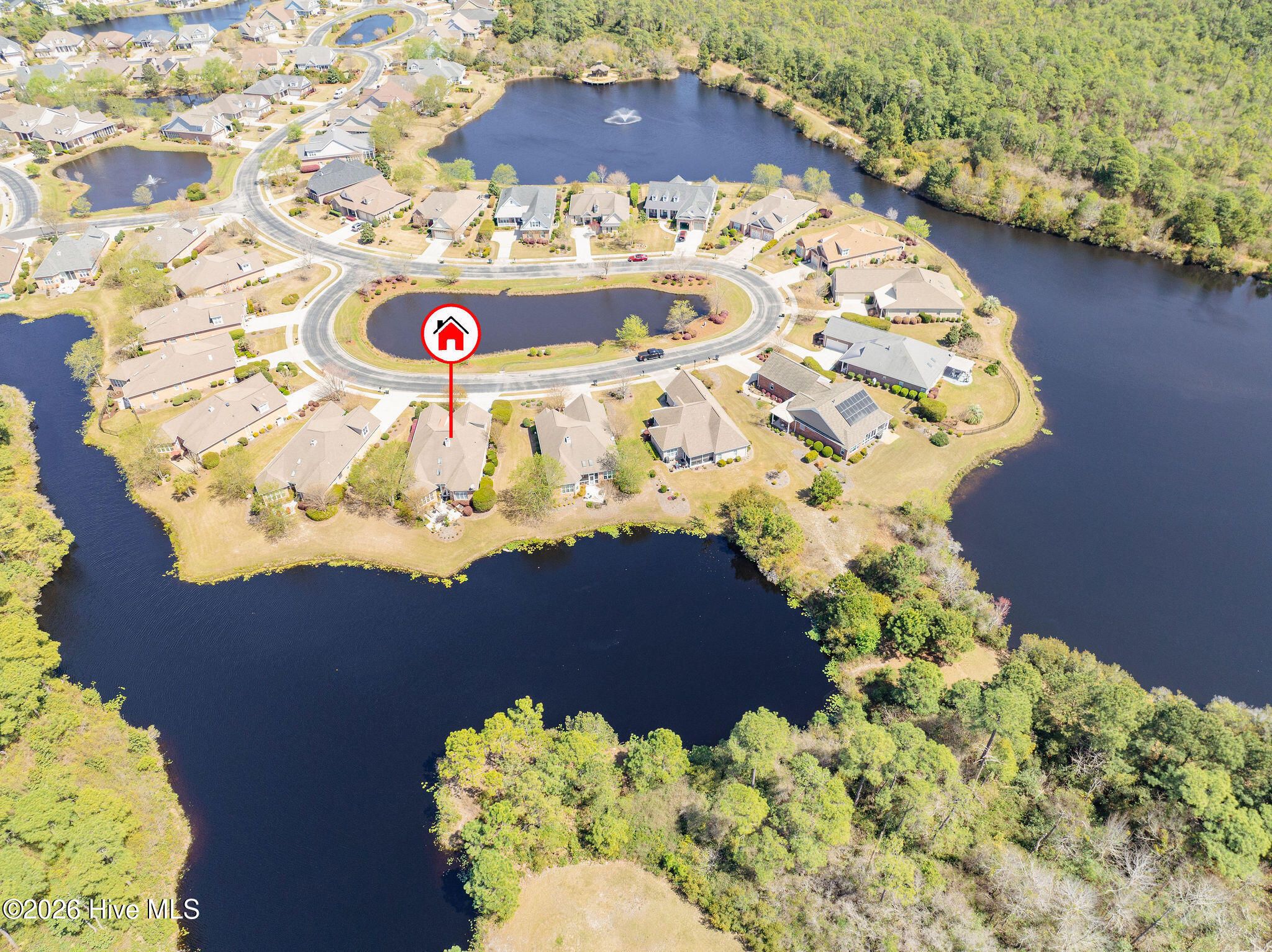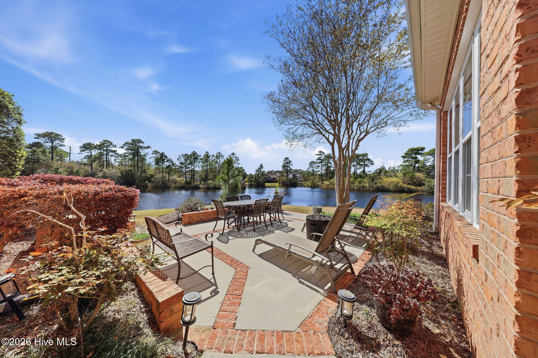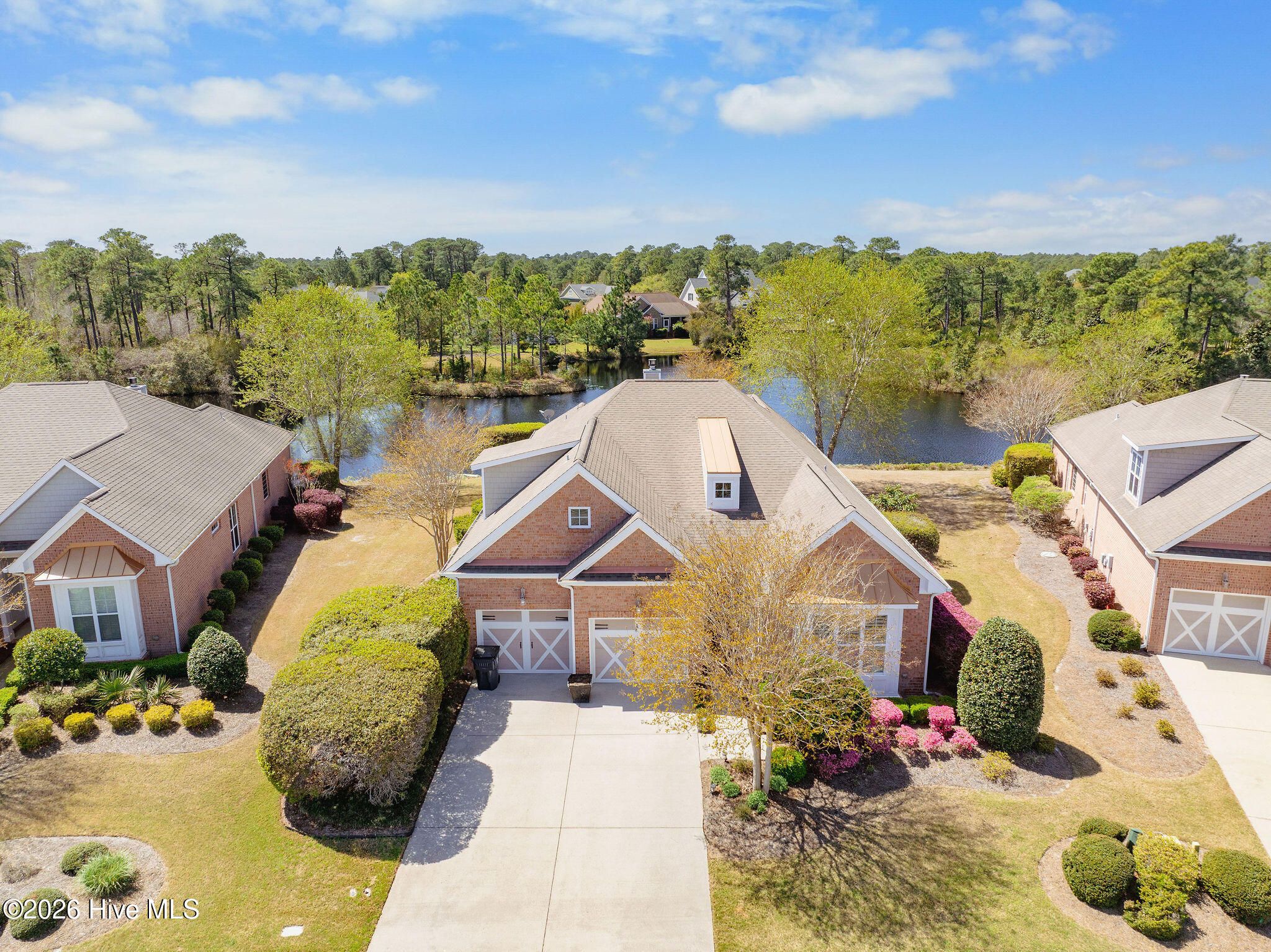 This all-brick home in the Regency Lakes section of St. James Plantation offers a low-maintenance lifestyle with a prime location near the Players Club amenity center and the Regency gate. This property boasts a truly unique homesite, offering picturesque water views from both the front and back of the house. The rear of the home faces a permanent nature preserve, ensuring your backyard remains a private sanctuary for watching local wildlife over the tranquil pond. Professionally maintained landscaping--lawn care is included in the HOA. The home is a sprawling open floor plan anchored by a Great Room featuring vaulted ceilings and a cozy gas fireplace. The space flows seamlessly into the kitchen and dining areas, tied together by beautiful, engineered hardwood floors. Adjacent to the kitchen a bright, enclosed sitting room with southern exposure is the ultimate spot for morning coffee, with large windows that pull natural light deep into the home and offer uninterrupted views of the water. The split-bedroom floor plan ensures maximum privacy for owners and guests alike. Located on its own wing, the primary suite is a peaceful escape with plantation shutters, a large walk-in closet, and a spacious bathroom featuring double sinks and a deep soaking tub. On the opposite side of the home, two spacious bedrooms share a full bath. The middle bedroom is perfectly sized to double as a den or hobby room. If you are searching for a great location, a thoughtful one-story living open floor plan, and well-built home in St. James Plantation you have found it.