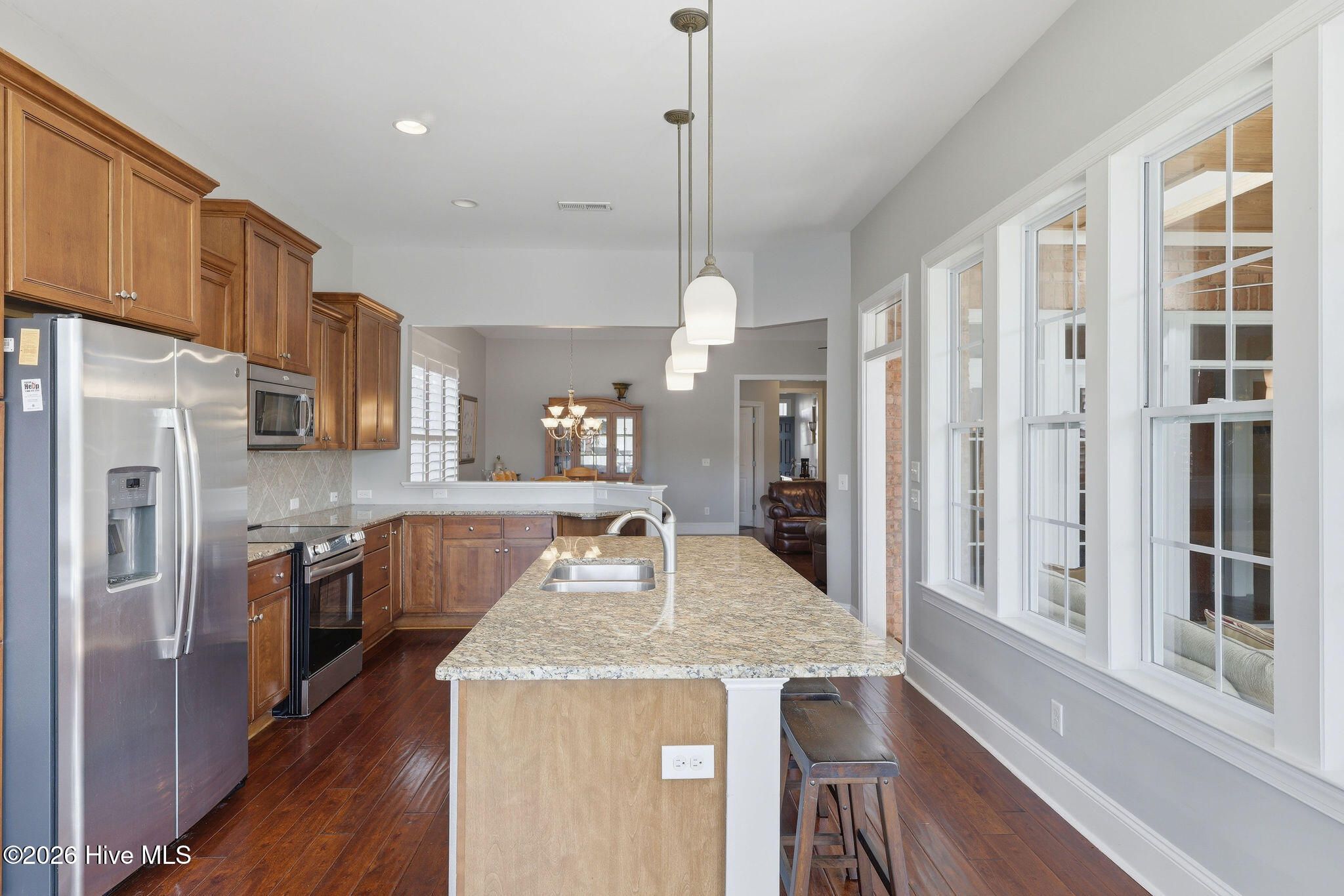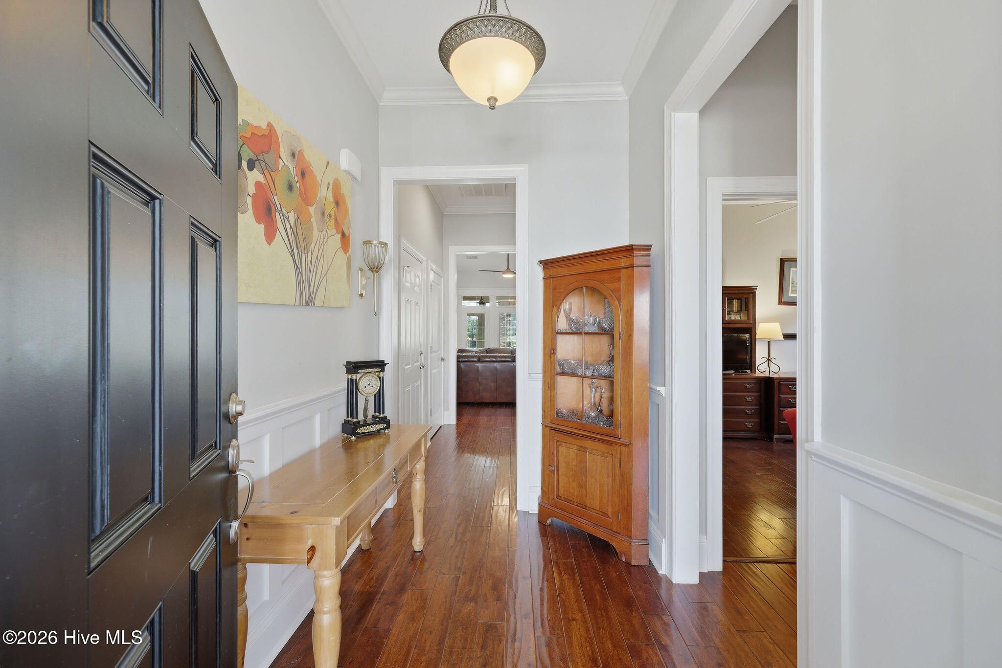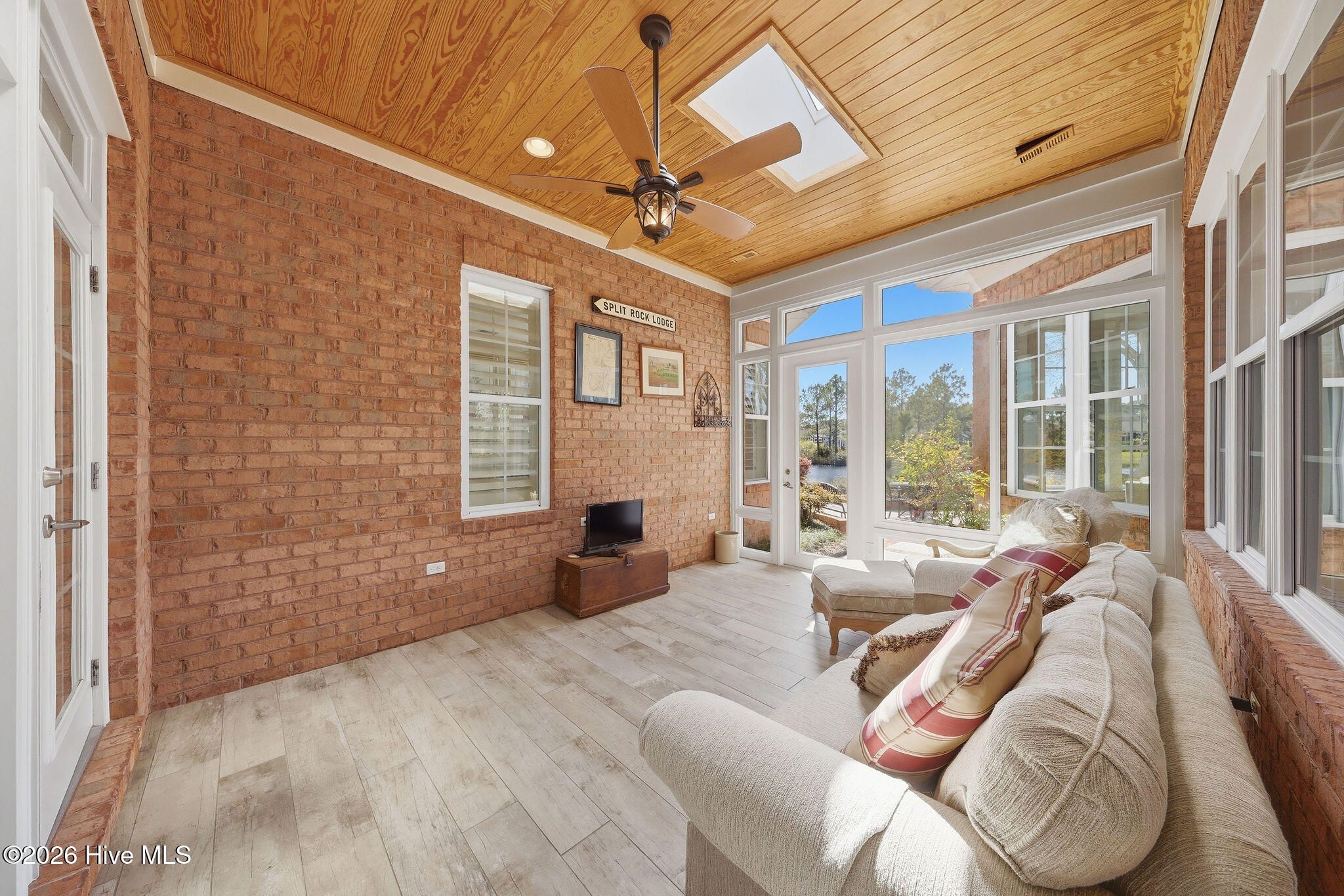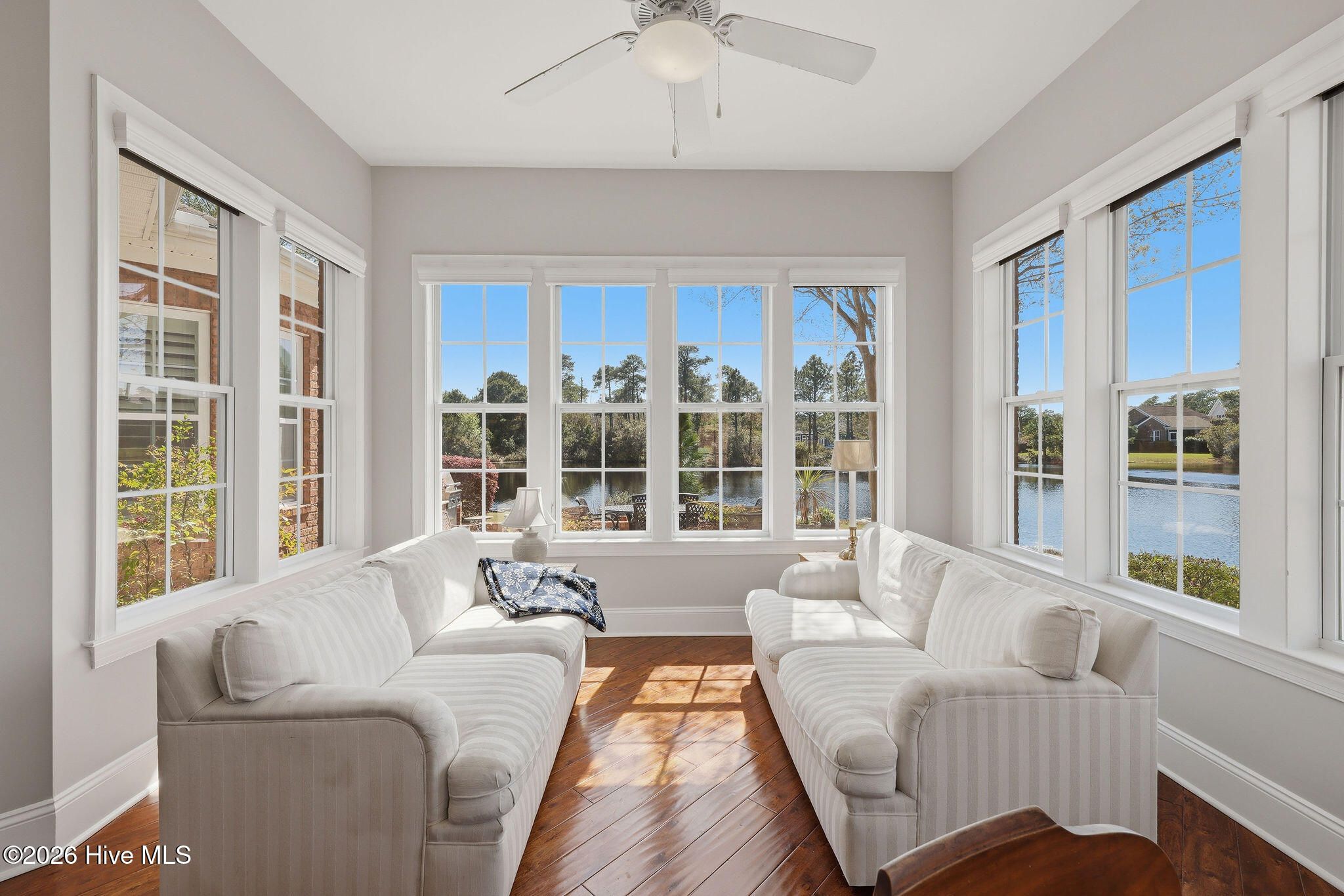This all-brick home in the Regency Lakes section of St. James Plantation offers a low-maintenance lifestyle with a prime location near the Players Club amenity center and the Regency gate. This property boasts a truly unique homesite, offering picturesque water views from both the front and back of the house. The rear of the home faces a permanent nature preserve, ensuring your backyard remains a private sanctuary for watching local wildlife over the tranquil pond. Professionally maintained landscaping--lawn care is included in the HOA. The home is a sprawling open floor plan anchored by a Great Room featuring vaulted ceilings and a cozy gas fireplace. The space flows seamlessly into the kitchen and dining areas, tied together by beautiful, engineered hardwood floors. Adjacent to the kitchen a bright, enclosed sitting room with southern exposure is the ultimate spot for morning coffee, with large windows that pull natural light deep into the home and offer uninterrupted views of the water. The split-bedroom floor plan ensures maximum privacy for owners and guests alike. Located on its own wing, the primary suite is a peaceful escape with plantation shutters, a large walk-in closet, and a spacious bathroom featuring double sinks and a deep soaking tub. On the opposite side of the home, two spacious bedrooms share a full bath. The middle bedroom is perfectly sized to double as a den or hobby room. If you are searching for a great location, a thoughtful one-story living open floor plan, and well-built home in St. James Plantation you have found it.