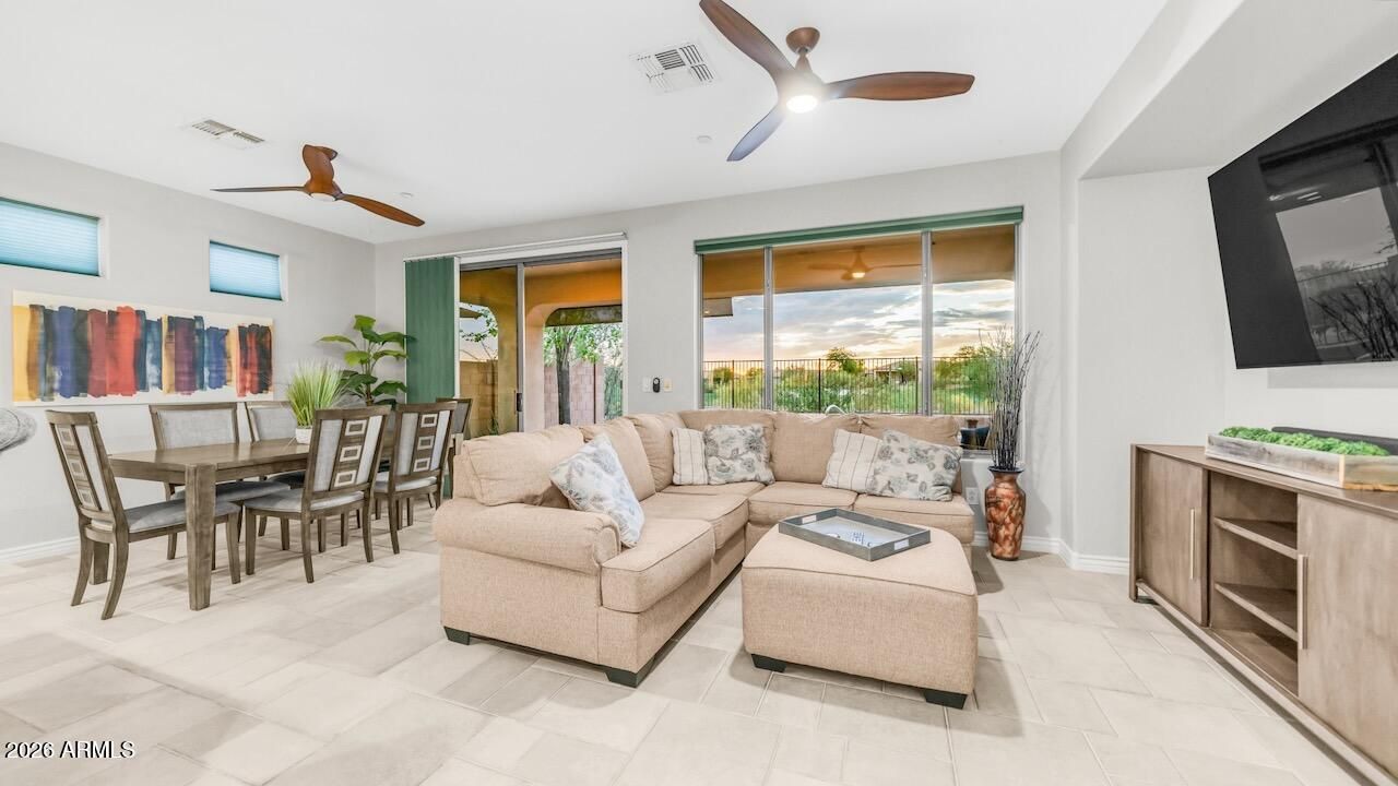 Nestled in the guard-gated community of Anthem Country Club, this Dover model 2-bedroom, 2-bath home offers a rare blend of privacy, scenic beauty, and low-maintenance living with golf course views from both the front and back. Perfectly positioned with no homes across the street and overlooking the 8th fairway of the Persimmon Golf Course, the setting captures breathtaking sunsets and tranquil desert surroundings. Inside, tile flooring runs throughout for a clean, carpet-free interior, complemented by natural light, contemporary ceiling fans, and energy-efficient honeycomb blinds. The kitchen features raised panel espresso cabinetry, granite countertops, stainless steel appliances, and a breakfast bar that opens seamlessly to the living space. The primary suite is thoughtfully designed to take in pool, fairway, and sunset views, along with an upgraded closet system. Step outside to a covered patio with an extended paver deck and a low-maintenance pool, creating an ideal space to relax or entertain while enjoying the serene golf course backdrop. Additional highlights include rain gutters, landscape lighting, a water softener, and a 2-car garage with built-in storage cabinets. Residents enjoy a lifestyle centered around two championship golf courses and beautifully appointed clubhouses, with resort-style amenities woven throughout the community including pools, fitness spaces, and courts for tennis, pickleball, and bocce.