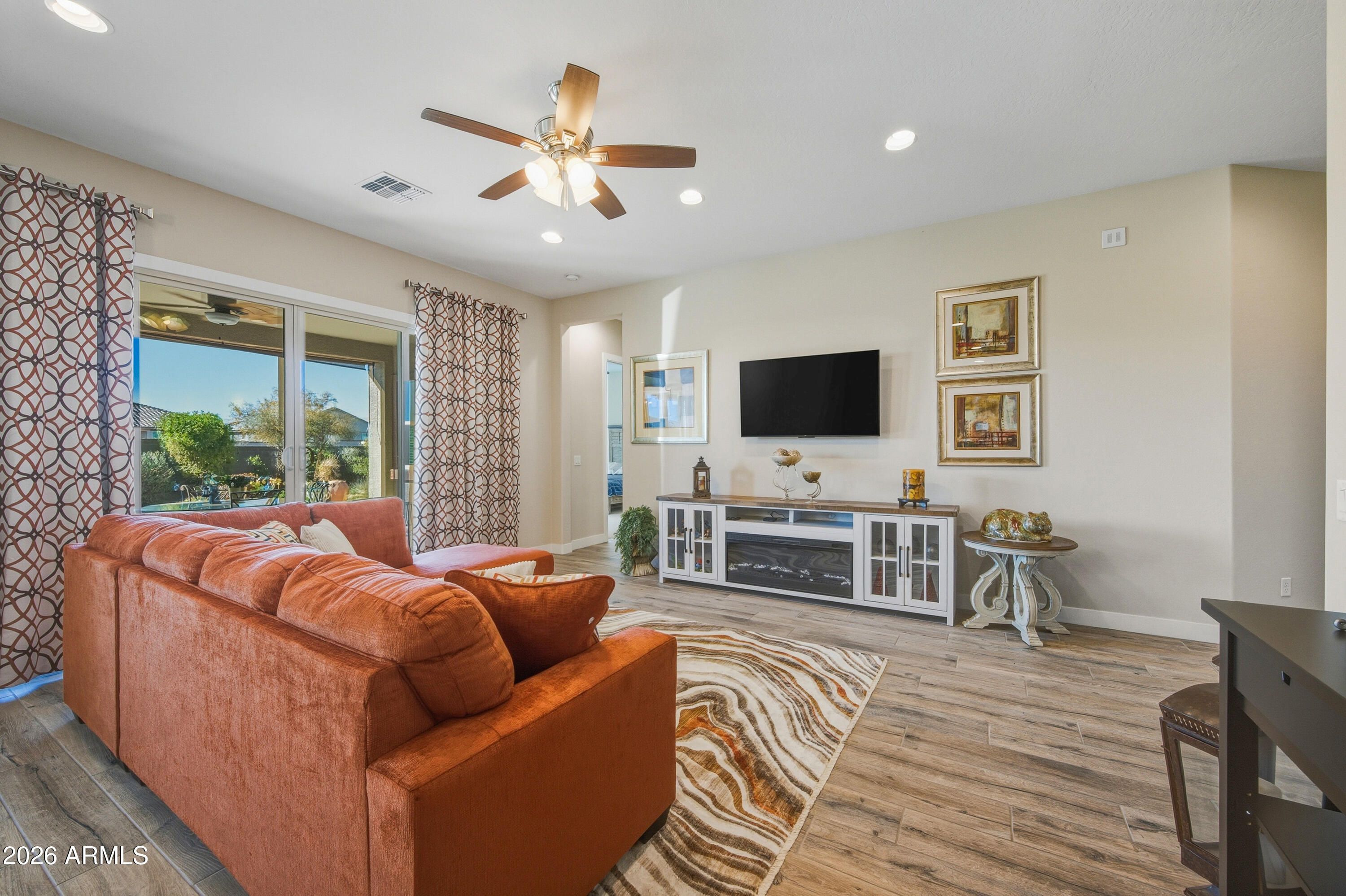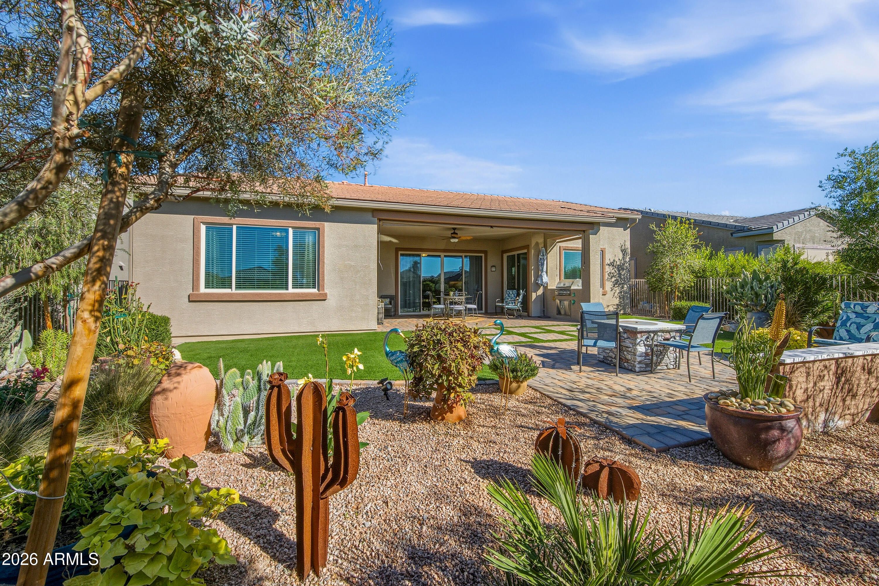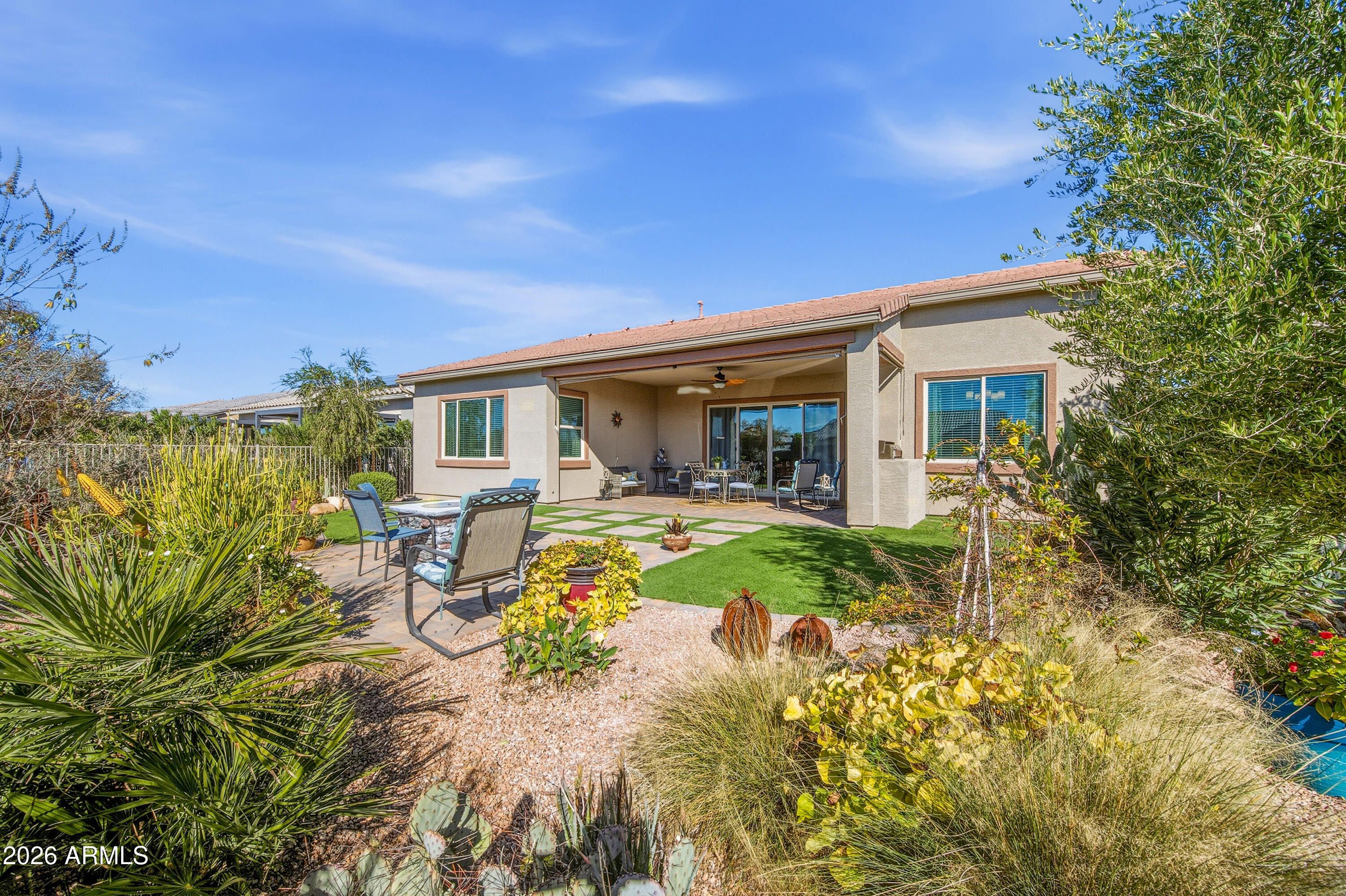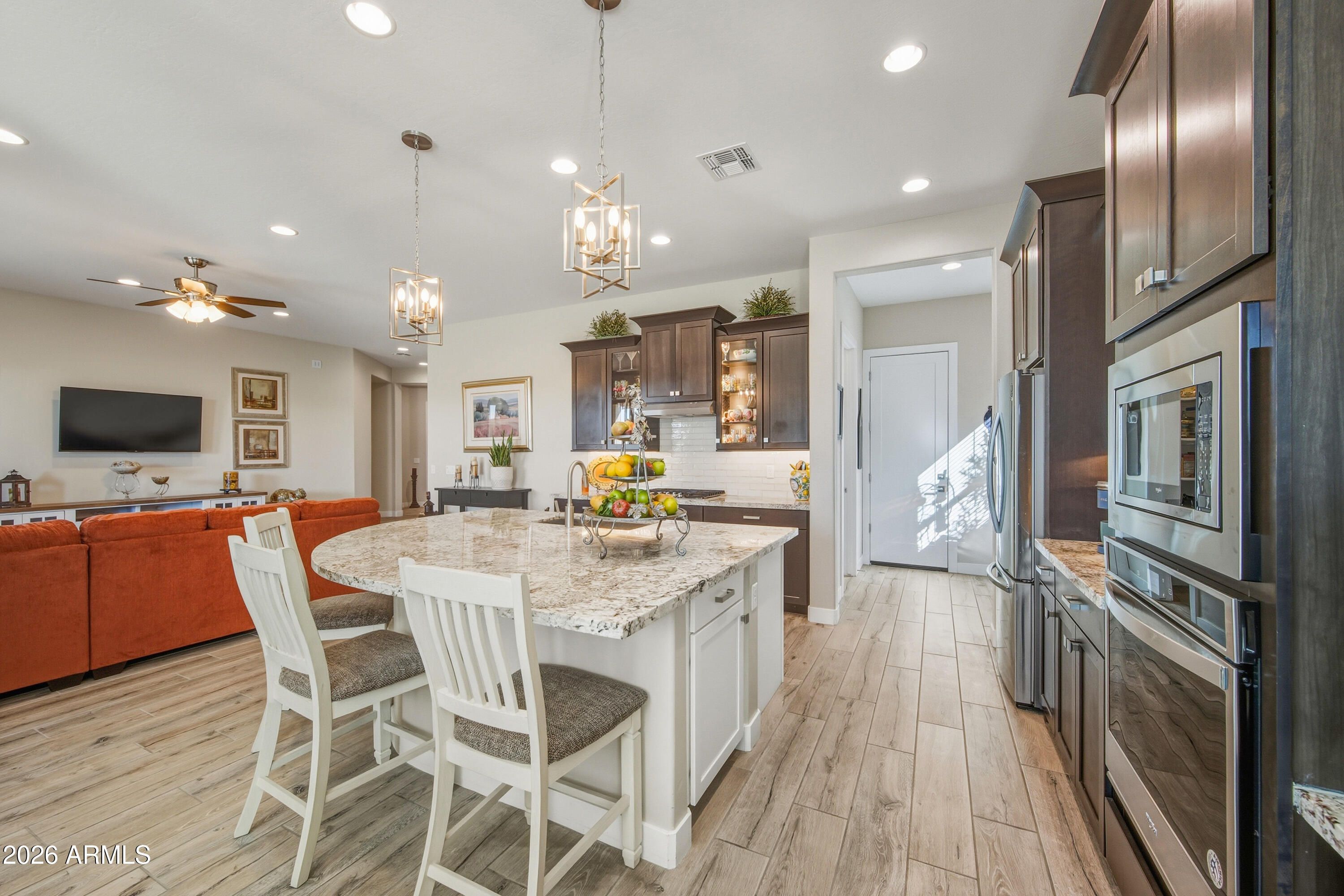 Experience elevated resort-style living in the highly sought-after Province at Maricopa, a premier active adult community offering exceptional amenities, scenic lakes, and a vibrant lifestyle. This beautifully upgraded 2-bedroom, 2.5-bath residence with a den showcases over $80,000 in seller improvements, delivering a rare blend of luxury, functionality, and thoughtful design. The open-concept layout is filled with natural light and features wide plank flooring, recessed lighting, ceiling fans, and a spacious great room ideal for entertaining or everyday comfort. The gourmet kitchen anchors the home with a large center island, granite countertops, stainless steel appliances, pendant lighting, abundant cabinetry, and a generous walk-in pantry. The kitchen flows seamlessly into the dining and living spaces and opens to the expansive covered patiocreating an effortless indoor-outdoor lifestyle. The private primary suite offers a relaxing retreat with a spa-inspired bath featuring dual vanities, an oversized walk-in shower with bench seating and glass enclosure, and excellent storage. A spacious secondary bedroom with nearby full bath and a versatile den provide flexibility for guests, hobbies, or a home office. A convenient powder bath adds functionality for entertaining. Step outside to a professionally landscaped backyard designed for year-round enjoyment, featuring a covered patio with ceiling fan, paver walkways and seating areas, low-maintenance artificial turf, mature desert plantings, accent lighting, and a built-in firepitperfect for relaxing evenings or hosting guests. The oversized garage is a standout feature with extensive custom cabinetry, work surfaces, overhead storage racks, and exceptional organization, ideal for hobbies, storage, or projects. Residents enjoy access to Province's impressive amenities including a clubhouse, fitness center, indoor and outdoor pools, pickleball and tennis courts, walking trails, lakes, dining options, and a full calendar of social and recreational activities. Conveniently located near shopping, dining, medical services, and commuter routes, this move-in-ready home offers comfort, quality, and an exceptional lifestyle opportunity. Truly a must-see property showcasing pride of ownership and outstanding upgrades throughout.