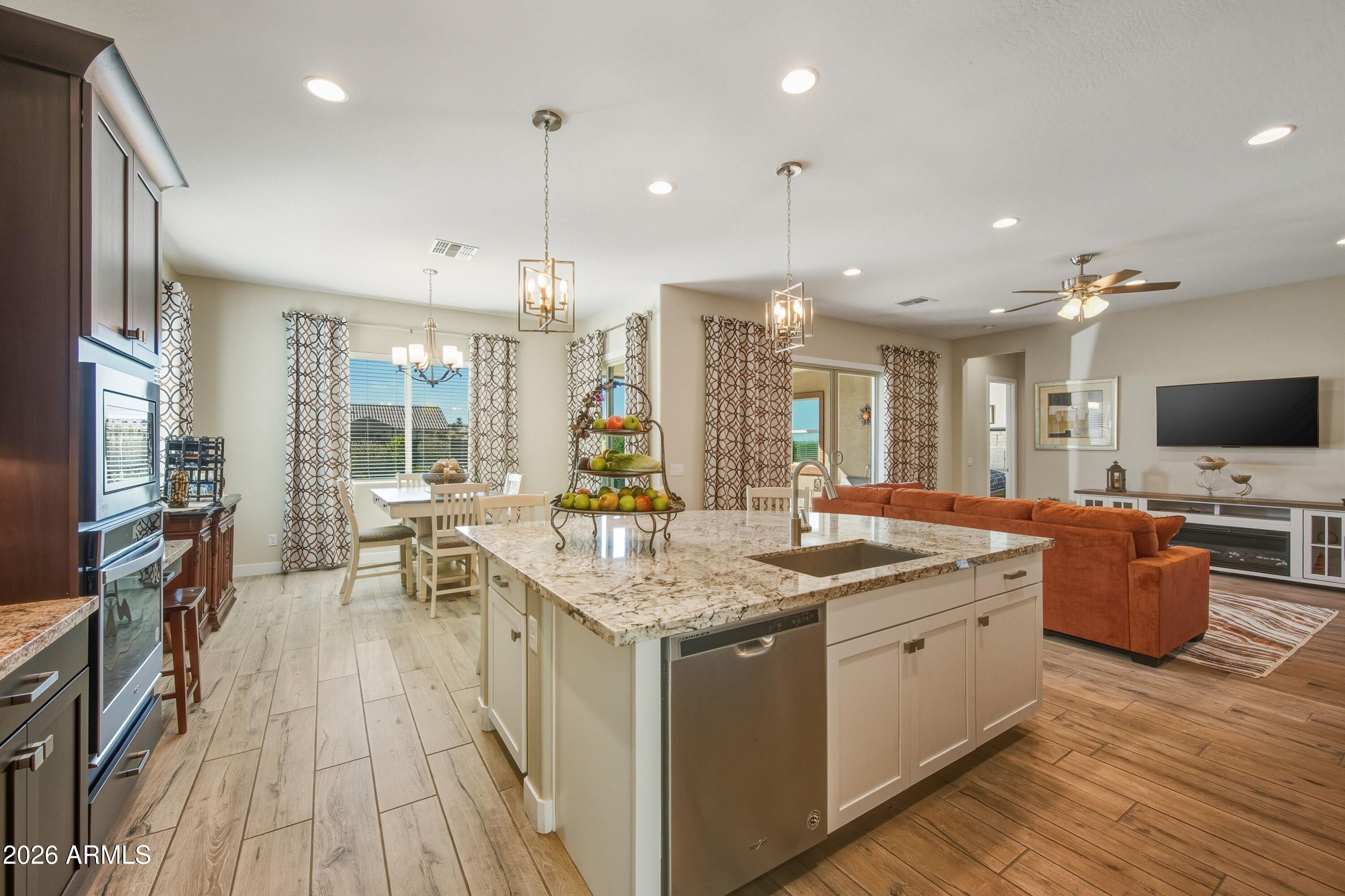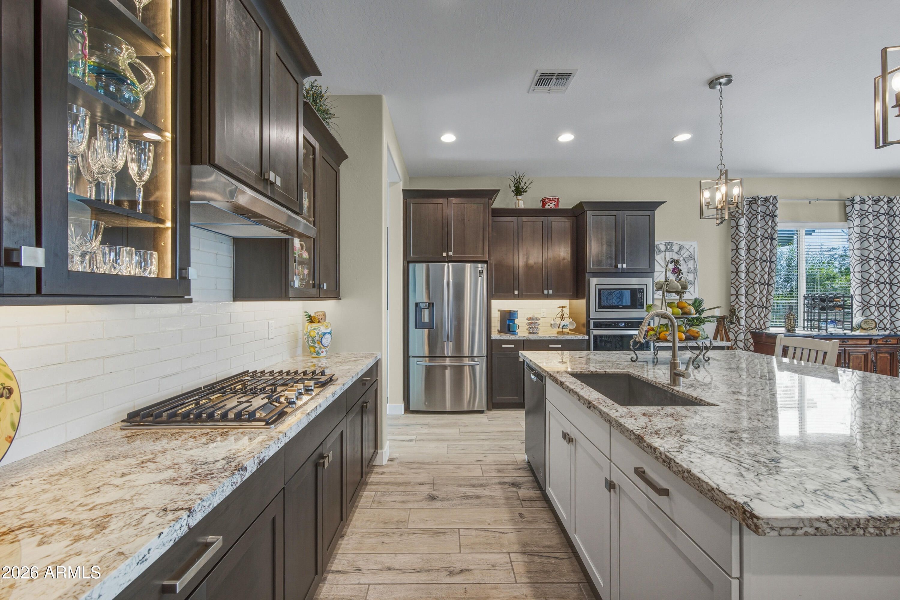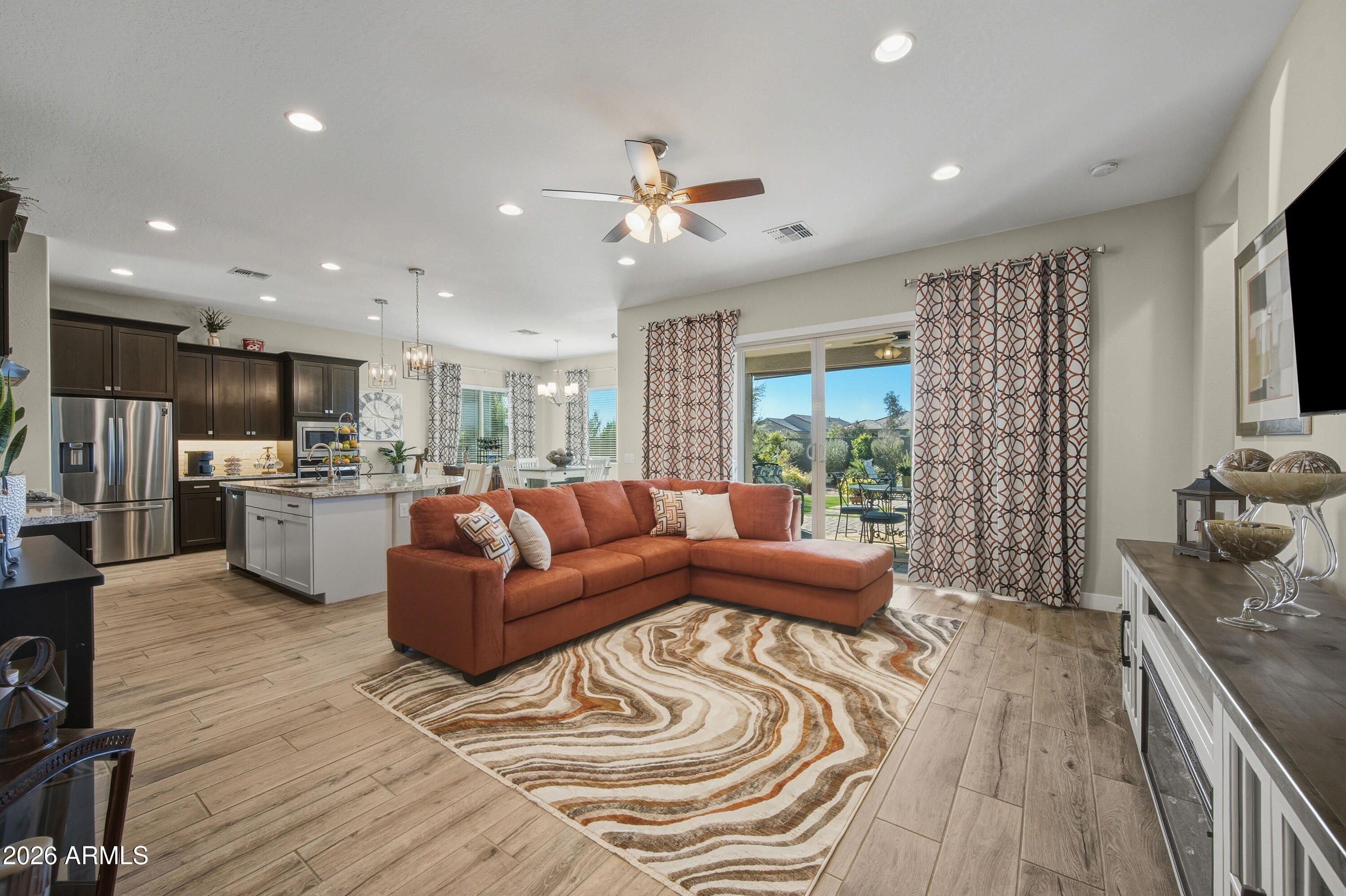 Experience elevated resort-style living in the highly sought-after Province at Maricopa, a premier active adult community offering exceptional amenities, scenic lakes, and a vibrant lifestyle. This beautifully upgraded 2-bedroom, 2.5-bath residence with a den showcases over $80,000 in seller improvements, delivering a rare blend of luxury, functionality, and thoughtful design. The open-concept layout is filled with natural light and features wide plank flooring, recessed lighting, ceiling fans, and a spacious great room ideal for entertaining or everyday comfort. The gourmet kitchen anchors the home with a large center island, granite countertops, stainless steel appliances, pendant lighting, abundant cabinetry, and a generous walk-in pantry. The kitchen flows seamlessly into the dining and living spaces and opens to the expansive covered patiocreating an effortless indoor-outdoor lifestyle. The private primary suite offers a relaxing retreat with a spa-inspired bath featuring dual vanities, an oversized walk-in shower with bench seating and glass enclosure, and excellent storage. A spacious secondary bedroom with nearby full bath and a versatile den provide flexibility for guests, hobbies, or a home office. A convenient powder bath adds functionality for entertaining. Step outside to a professionally landscaped backyard designed for year-round enjoyment, featuring a covered patio with ceiling fan, paver walkways and seating areas, low-maintenance artificial turf, mature desert plantings, accent lighting, and a built-in firepitperfect for relaxing evenings or hosting guests. The oversized garage is a standout feature with extensive custom cabinetry, work surfaces, overhead storage racks, and exceptional organization, ideal for hobbies, storage, or projects. Residents enjoy access to Province's impressive amenities including a clubhouse, fitness center, indoor and outdoor pools, pickleball and tennis courts, walking trails, lakes, dining options, and a full calendar of social and recreational activities. Conveniently located near shopping, dining, medical services, and commuter routes, this move-in-ready home offers comfort, quality, and an exceptional lifestyle opportunity. Truly a must-see property showcasing pride of ownership and outstanding upgrades throughout.