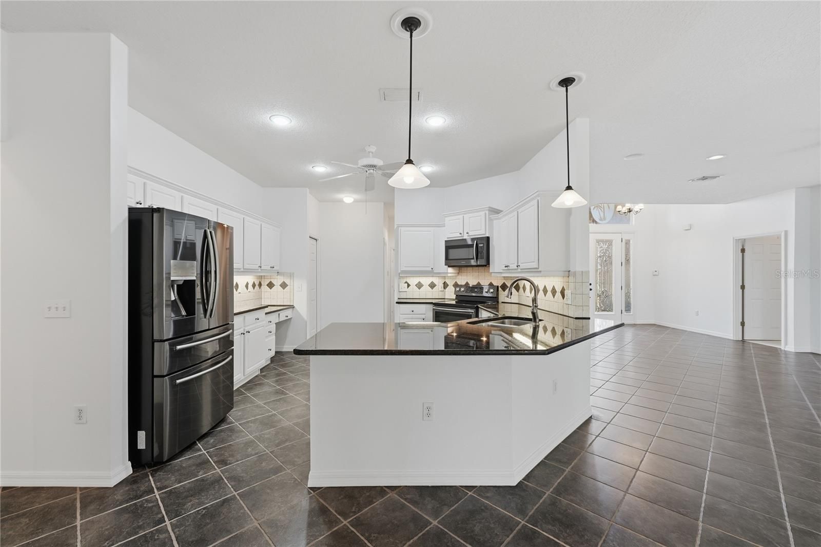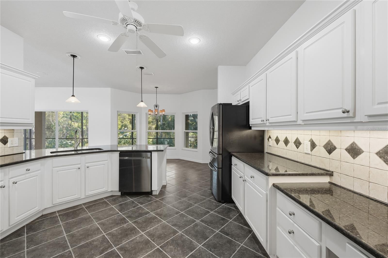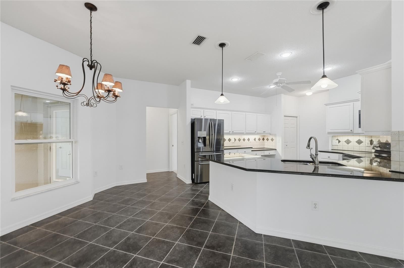- Ceiling Fan(s), Eat-in Kitchen, High Ceilings, Kitchen/Family Room Combo, Living/Dining Room, Open Floorplan, Solid Surface Counters, Split Bedrooms, Stone Counters, Thermostat, Walk-In Closet(s)