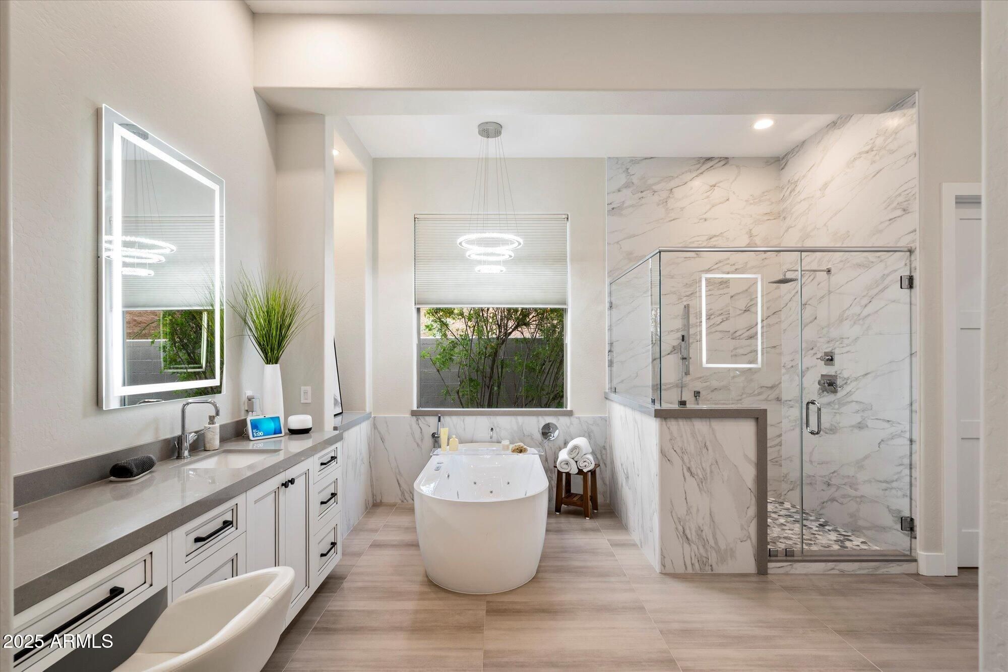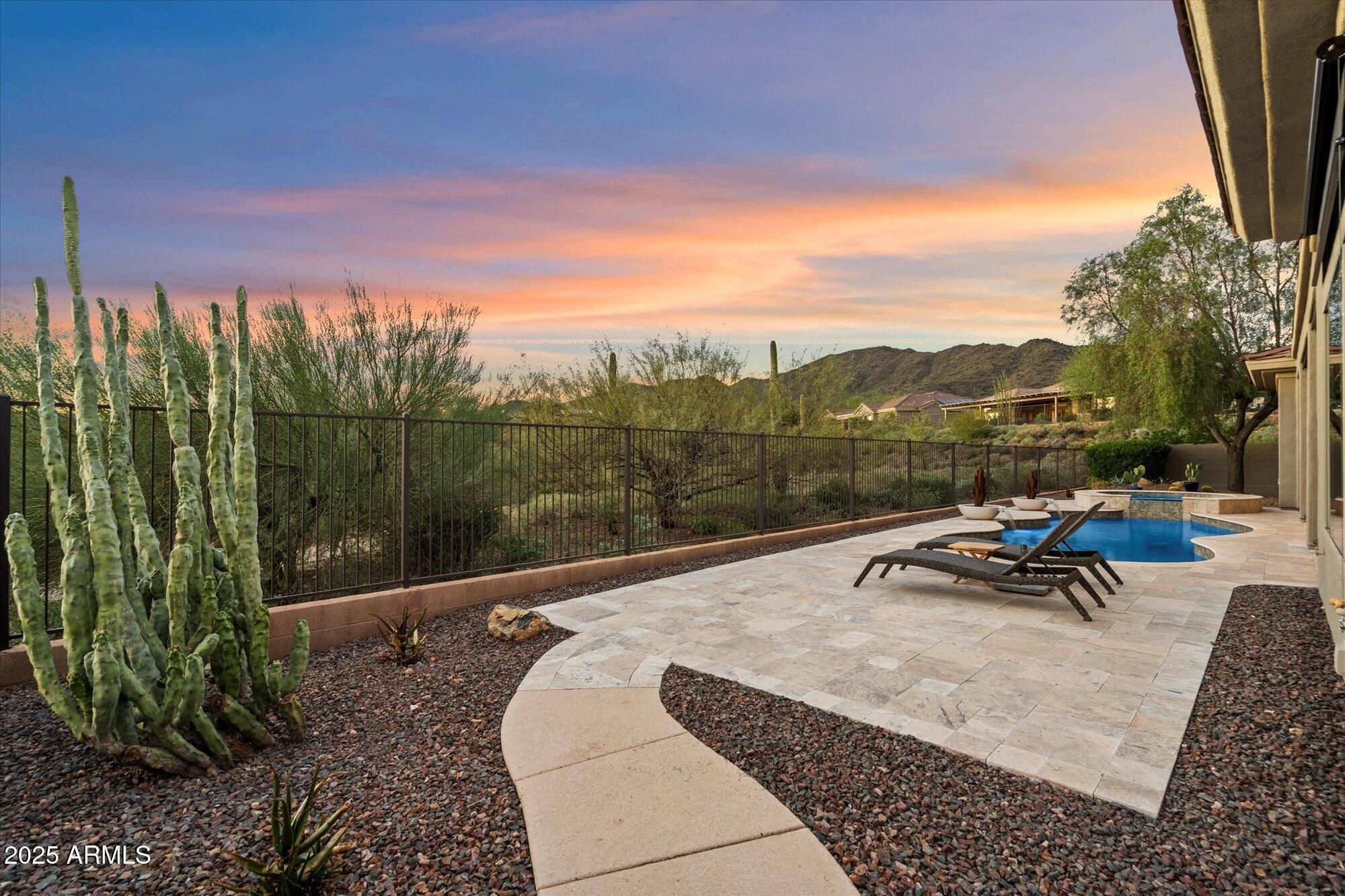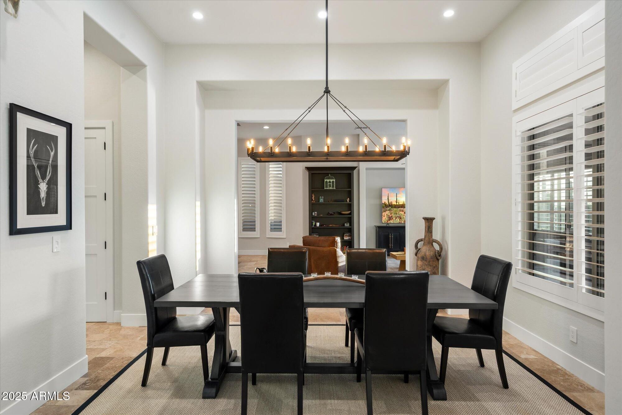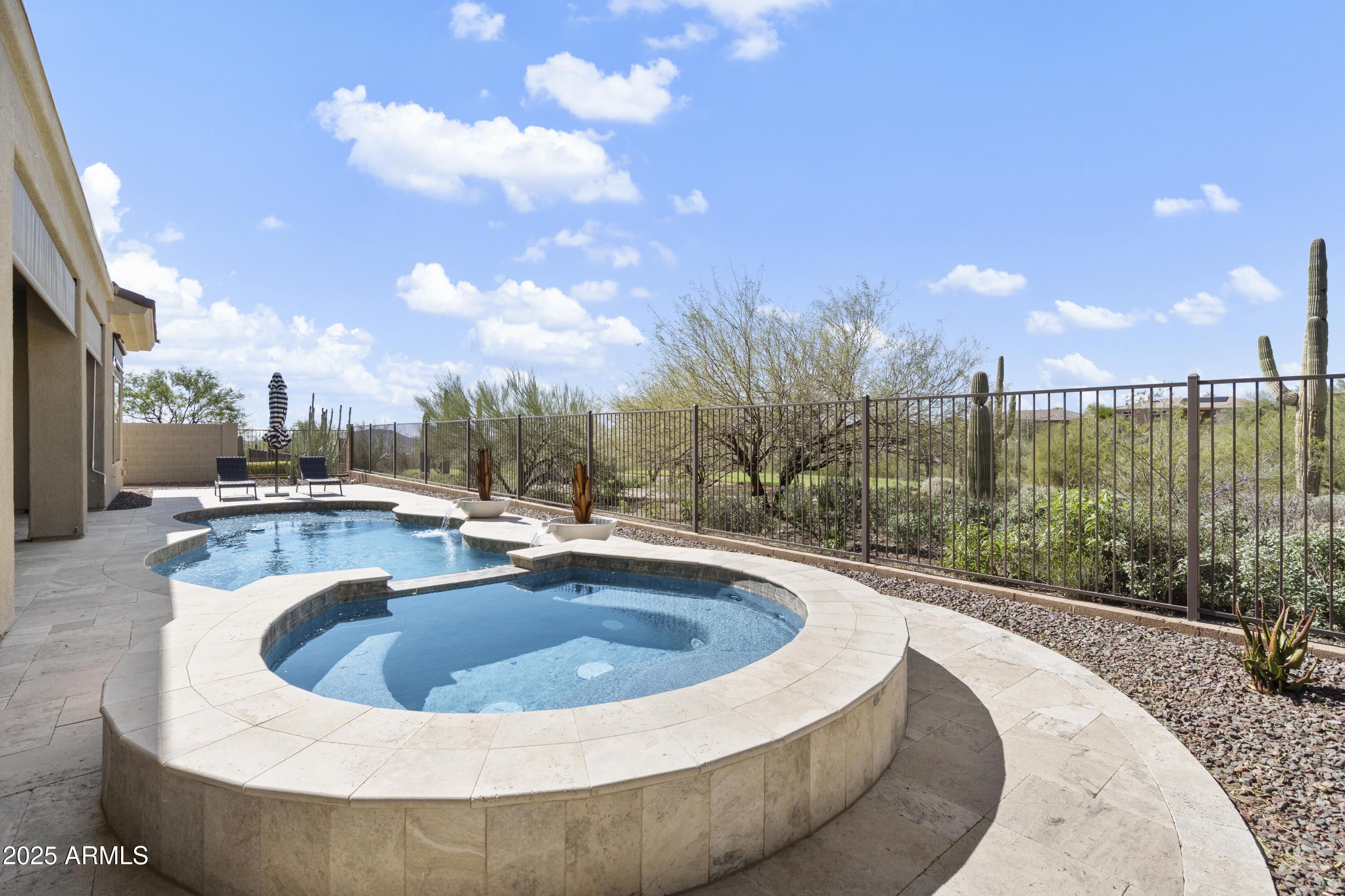 Nestled within the prestigious gated community of Anthem Country Club, this reimagined Hampton model has been completely redesigned by a luxury custom home builder—seamlessly blending timeless elegance with modern sophistication. Showcasing a comprehensive, high-end renovation (itemized list available upon request), this single-level residence offers 4,016 sq. ft. of thoughtfully designed living space. A grand custom iron-and-glass entry door opens to expansive formal living and dining areas with 12-foot ceilings and large picture windows that frame serene backyard, pool with multiple water features and multicolored lighting, and sweeping mountain and golf course views. At the heart of the home lies a chef's dream kitchen, featuring bespoke custom cabinetry, granite and quartz countertops, professional-grade stainless steel appliances, three ovens, a six-burner gas range, built-in espresso machine, under-counter microwave, double-drawer dishwasher, and an oversized 6' x 7' island with seating for five and abundant storage below. Additional highlights include a commercial-grade side-by-side refrigerator and freezer, pull-out trash and recycle drawers, a walk-in pantry with custom iron-and-glass door, a Miele wine fridge that accommodates over 70 bottles, and elegant custom shelving that balances function and flair. Separate coat and utility closets add extra convenience. The adjoining open-concept family room offers a warm, inviting atmosphere with seamless access to the outdoor living area, perfect for both relaxing and entertaining. The primary suite serves as a true private retreat, encompassing approximately 900 sq. ft. and featuring a sitting area with pool, mountain, and golf course views, direct patio access, and a spa-inspired ensuite with dual vanities and backlit mirrors, a freestanding soaking tub, oversized tile-and-glass shower, and an impressive 9' x 19' custom walk-in closet system. Additional bedrooms are thoughtfully placed for privacy, each with an ensuite or nearby bath, ideal for guests or family. Step outside to enjoy a resort-style backyard designed for year-round enjoyment. The covered patio includes custom roll-up sun shades, while the sparkling pool and spa are surrounded by low-maintenance desert landscaping and view fencing that capture stunning golf course and Daisy Mountain vistas. A four-car garage with insulated doors provides generous storage and convenience. Select designer furnishings, curated to complement the homes' aesthetic, are included with a full price offer-providing a truly Turnkey experience! This home perfectly embodies Anthem's resort lifestyle, graceful, functional, and ideally suited for both quiet living and elegant entertaining. You won't find a more complete or highly upgraded home within the community.