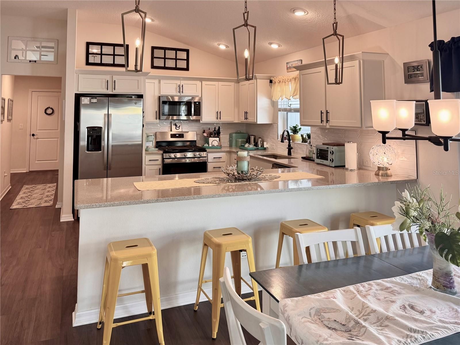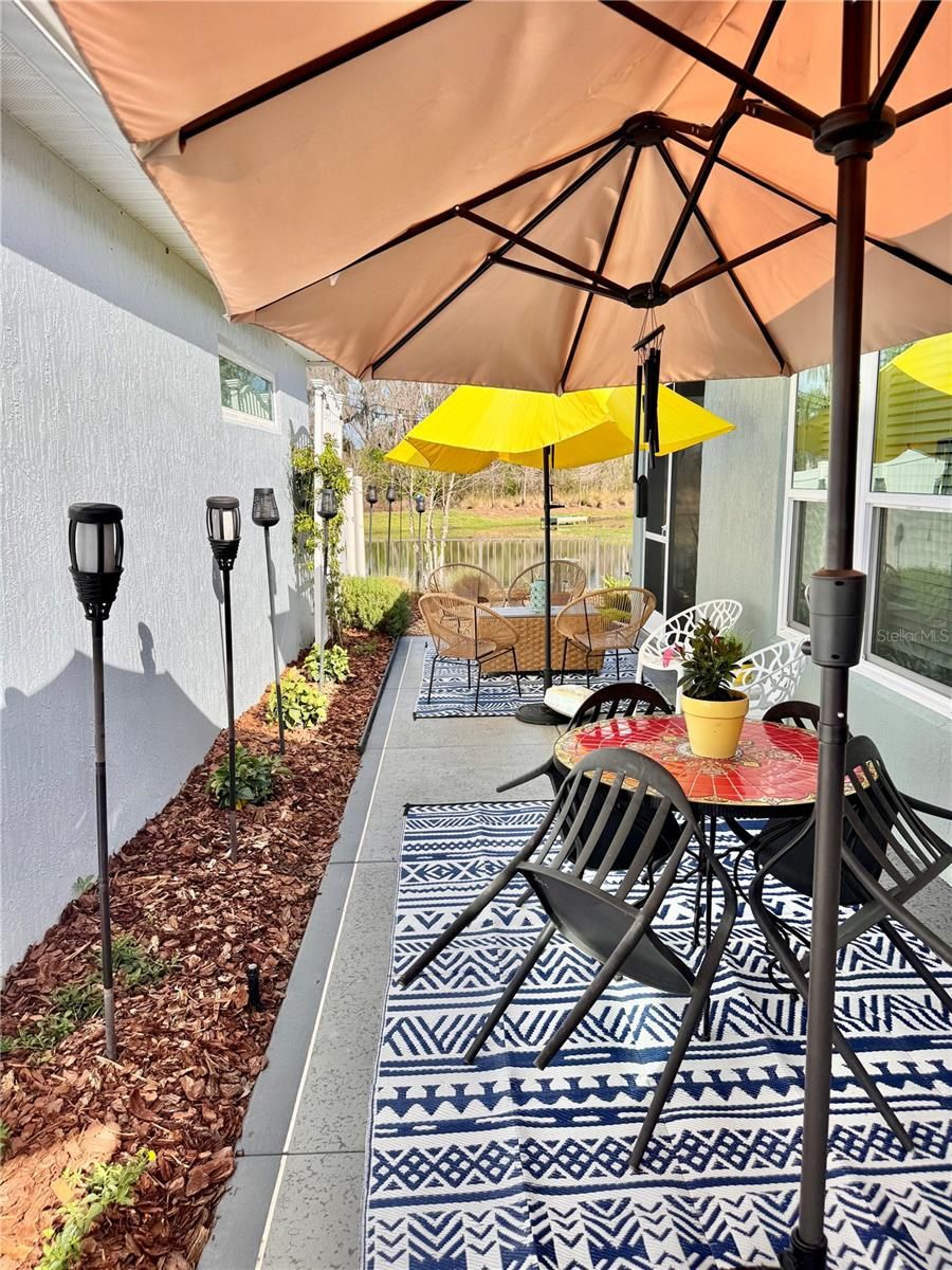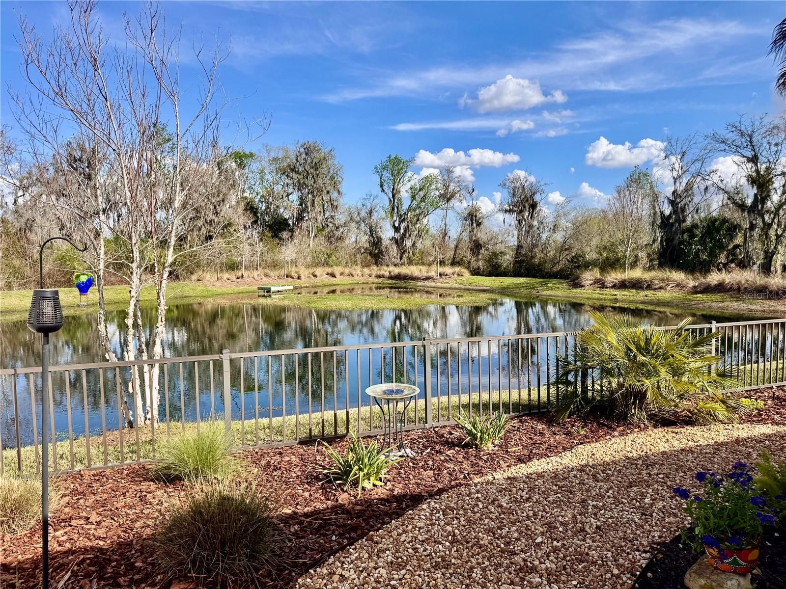 Welcome to 4193 Silvana Way, where beautiful design and PEACEFUL WATERFRONT VIEWS come together to create a home that feels like a PRIVATE RETREAT in the heart of The Villages. From the moment you arrive, the charming coastal color palette, STAMPED DESIGNER DRIVEWAY & WALKS , and inviting SCREENED-IN front entry set the tone for the relaxed Florida lifestyle waiting inside.Step through the door and you’re greeted by an open, light-filled floor plan with warm luxury flooring throughout-no carpet, soaring ceilings, and a beautifully designed kitchen that naturally becomes the heart of the home. The spacious breakfast bar , white cabinetry, QUARTZ COUNTERS THROUGHOUT, stainless appliances, and stylish lighting create a space that feels both elegant and welcoming — perfect for casual mornings, gathering with friends, or hosting memorable dinners.The living and dining areas flow effortlessly together, allowing the stunning backyard setting to take center stage. Large sliding doors lead to a PICTURE WINDOW screened LANAI designed for enhanced viewing,and year-round enjoyment, where comfortable seating invites you to relax and take in the peaceful water views. Just beyond, the thoughtfully landscaped backyard creates a private outdoor oasis with WINDING STONE PATHS, colorful plantings, and a patio space perfect for evening gatherings under café lights.The primary suite offers a SERENE ESCAPE with a beautifully updated bathroom featuring DUAL SINKS, modern finishes, SEPARATE WATER CLOSET with a built in Cabinet, and a spacious walk-in shower that feels fresh and spa-like.A GUEST BEDROOM, Bath, and Laundry Room which has extra CABINETS are made private by a pocket door off the Kitchen.Third Bedroom is currently being used as an Office, but can accommodate a Queen size bed. Every room throughout the home reflects thoughtful care and attention to detail, creating a space that feels both comfortable and refined.Whether enjoying a quiet morning watching the water, entertaining friends on the lanai, or simply soaking in the peaceful setting, this home delivers the lifestyle that makes living in The Villages so special.ADDED FEATURES INCLUDE…Rain gutters, attic stairs, whole house water filtration, portable generator plug and wiring panel updated to use generator during power outages. Zero Lawn Mantainence. Homes with views, outdoor living spaces, and this level of charm are the ones buyers remember long after a showing ends. If you’re looking for a home that truly stands out, 4193 Silvana Way is ready to welcome you. Call me!