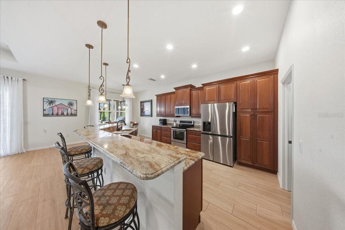 Welcome to your private slice of paradise—where luxury, comfort, and resort-style living come together in one unforgettable home. From the moment you arrive, the beautifully landscaped grounds, paver walkway, and inviting front porch set the tone for what’s inside. Step through the elegant glass front door into a bright, open-concept design that immediately feels like home. Triple sliding glass doors draw your eye straight to the showstopper—your own heated saltwater pool and spa retreat. This 3-bedroom, 2-bath residence was designed for both relaxation and entertaining. The outdoor space is nothing short of extraordinary, featuring a fully equipped outdoor kitchen with a gas grill with a smoker, gas burner, granite countertops, refrigerator, wine fridge, storage drawers, and dining space perfect for hosting unforgettable gatherings. The pool system is top-of-the-line with commercial-grade filtration, saltwater sanitation, and a variable-speed pump for efficiency and low maintenance. Inside, the heart of the home is a chef-inspired kitchen boasting 42” upper cabinets, under-cabinet lighting, granite countertops, stainless steel appliances, reverse osmosis system, pull-out pantry shelving, and abundant storage. Whether you’re hosting holidays or enjoying a quiet evening, the spacious dining areas offer the perfect setting. The primary suite is a true retreat, featuring two custom walk-in closets and a luxurious en suite bath complete with dual vanities, a walk-in glass shower with floor-to-ceiling tile, and a relaxing garden tub. Guest spaces are just as thoughtful, with a second bedroom offering a Murphy bed with built-in storage and a third bedroom with a built-in desk—ideal for hobbies or a home office. Every detail has been carefully considered, including fresh interior and exterior paint, new landscaping, a brand-new roof (2025), irrigation system, gutters, skeeter beater, and a spacious 2-car garage plus golf cart garage. A separate dining room and indoor laundry with sink add even more convenience. And beyond your front door? A lifestyle that feels like a year-round vacation. Enjoy an incredible array of amenities including golf, tennis, pickleball, bowling, fitness center, indoor lap pool, movie theater, restaurant, social clubs, and a full-time activities director to keep your calendar as full—or as relaxed—as you’d like. Perfectly located near shopping, dining, medical facilities, and entertainment, this home offers not just a place to live—but a lifestyle to love. This is more than move-in ready… this is where your next chapter begins.
