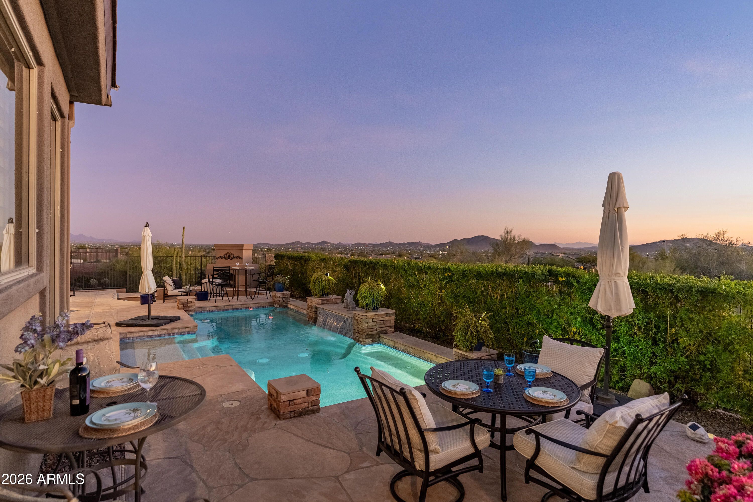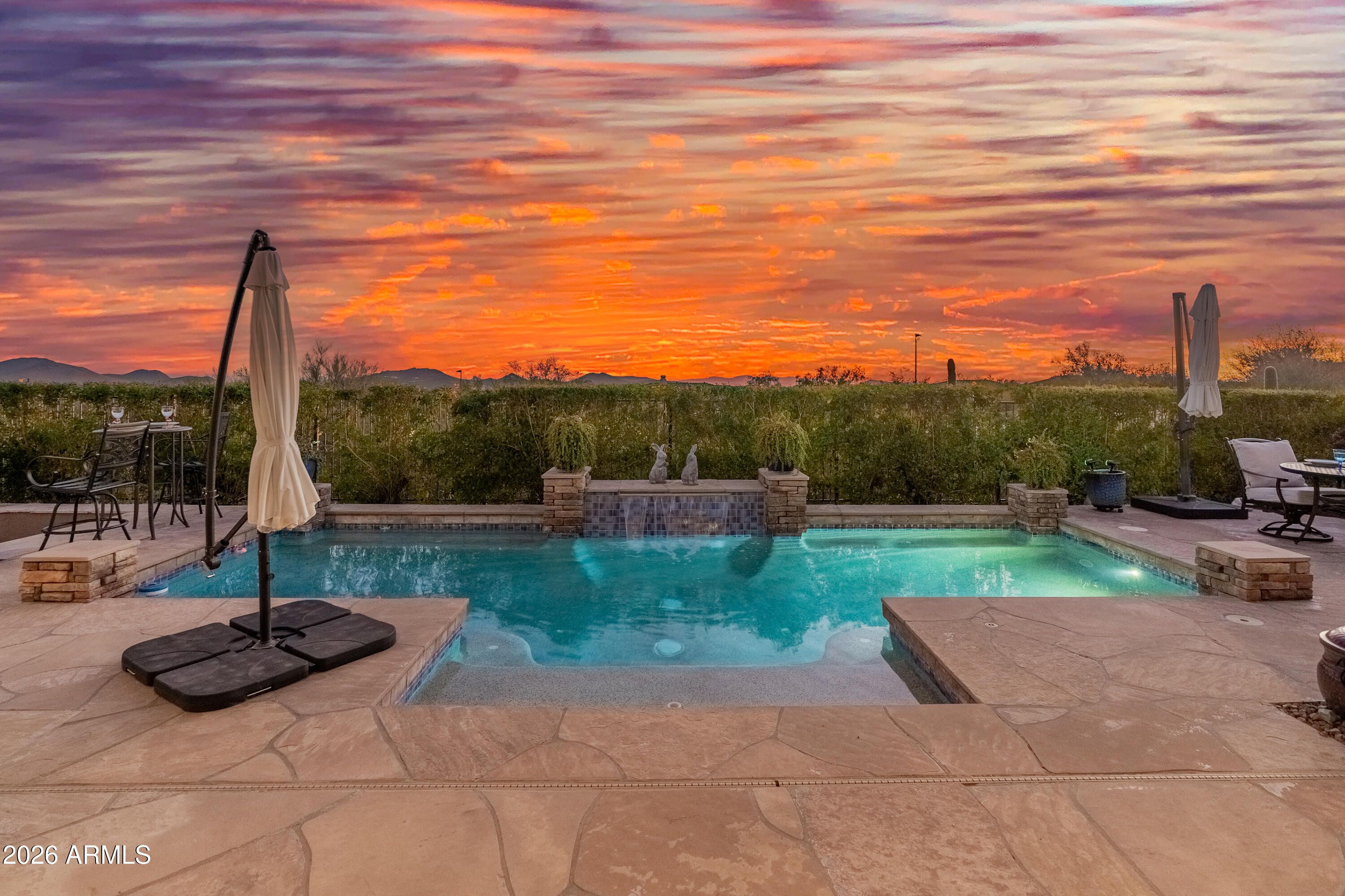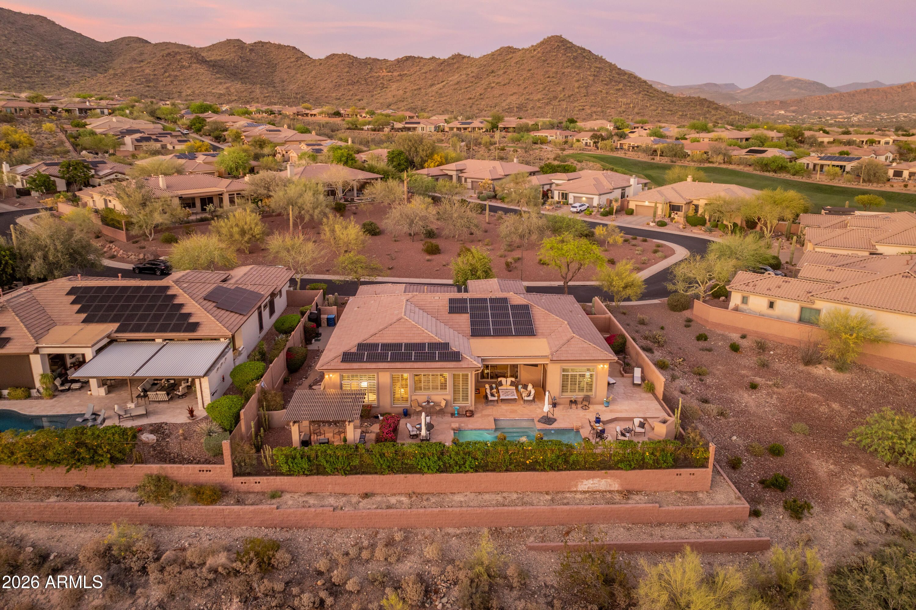 Location, Location, Location! This gorgeous home offers breathtaking sunrise and sunset views along with mountain and city-light views. Ideally positioned for privacy, the home enjoys a rare setting with no homes in front, behind, or on one side, creating a peaceful retreat. Major updates include a roof replacement in 2024, HVAC systems replaced in 2022 and 2024, and an owned solar system. Inside, the thoughtfully designed floor plan features three spacious bedrooms with private en-suite bathrooms, plus a powder bath, formal living and dining areas, a welcoming great room, and a dedicated office with floor-to-ceiling bookcases. The updated kitchen with new appliances features granite countertops, double ovens, stainless steel appliances, and a beverage center. The primary suite offers a cozy sitting area with a private exit to the covered patio, while the luxuriously updated bath includes a coffee bar, double sinks, soaking tub, and walk-in shower. Step outside to enjoy the resort-style backyard with a pool, water feature, fireplace, and ramada while taking in the spectacular views. Additional upgrades include crown molding, custom window treatments, shutters, electric shade on the back patio, a 17-SEER mini-split with added insulation in the 3-car garage, soothing water feature at the front courtyard, R/O, soft water, Central Vacuum, a laundry room sink with an additional beverage fridge are just a few of the updates to this home.