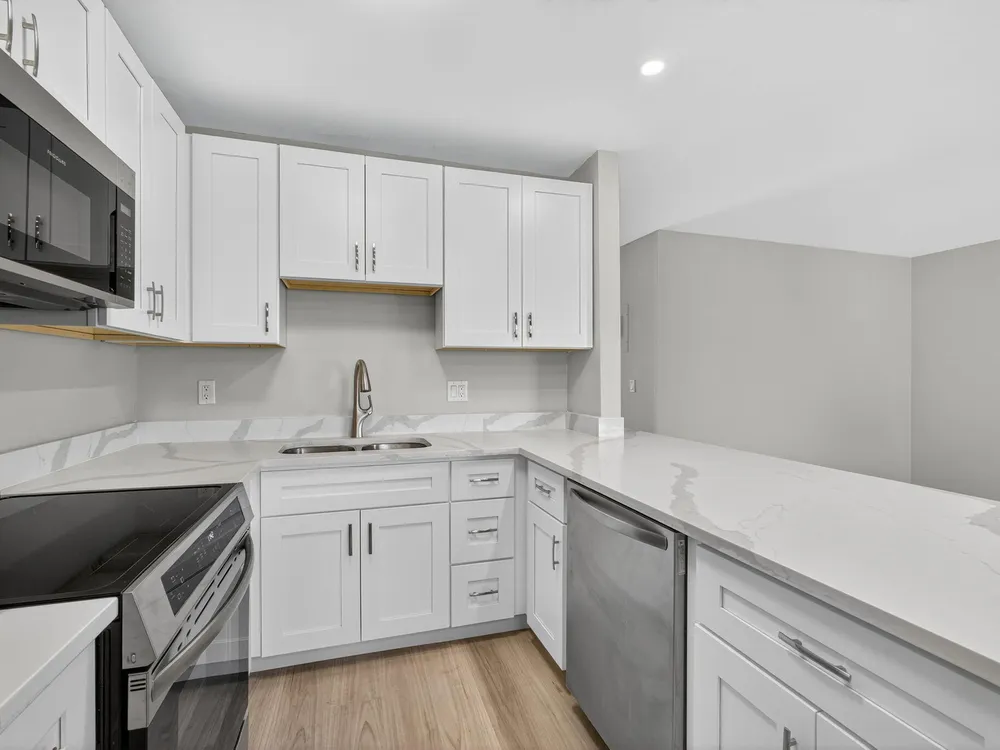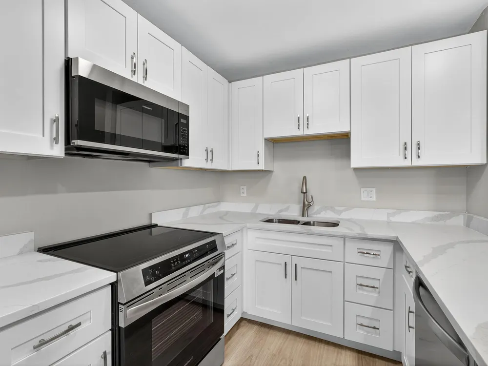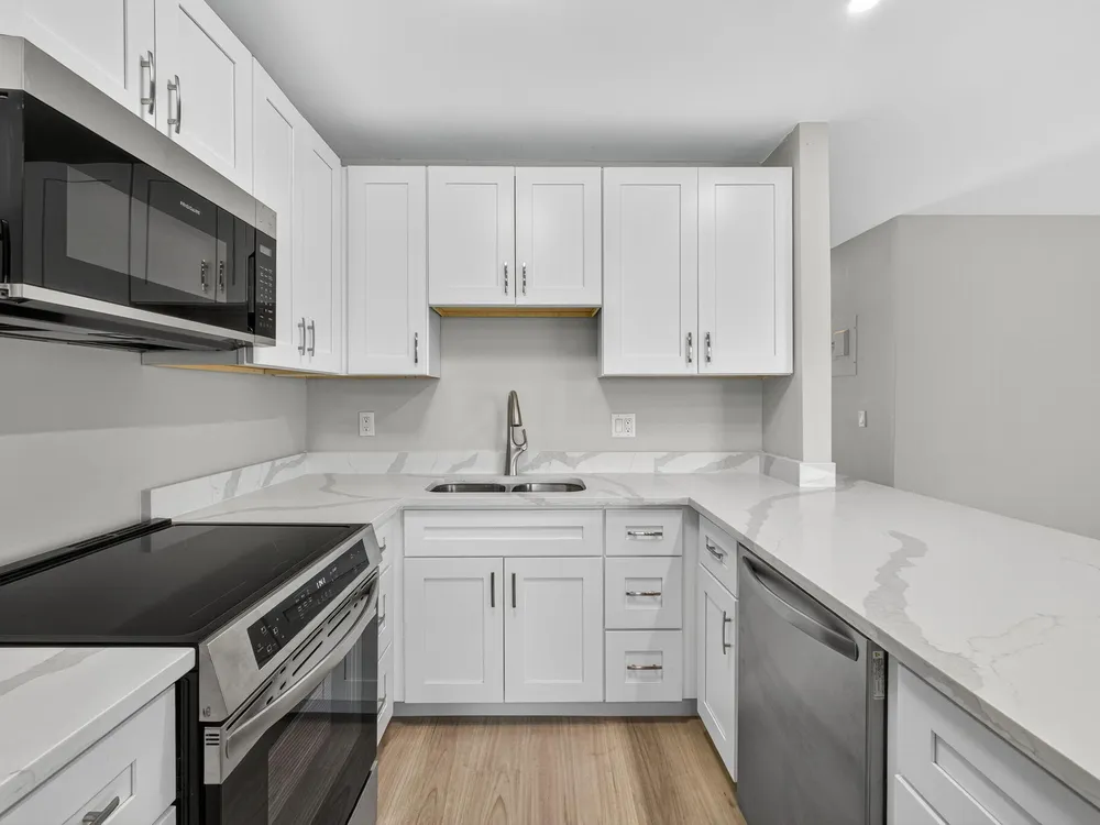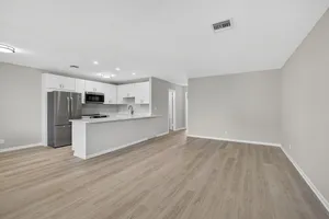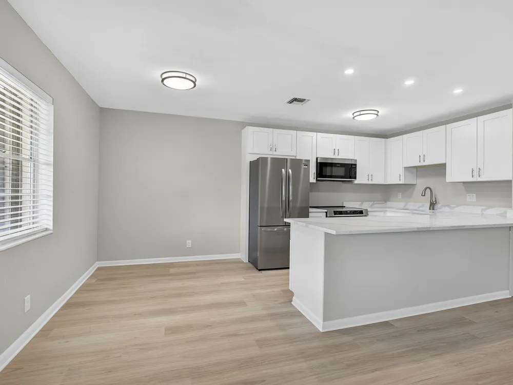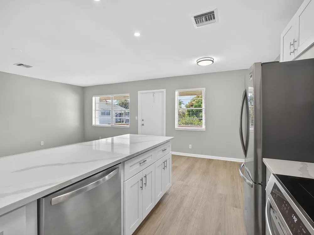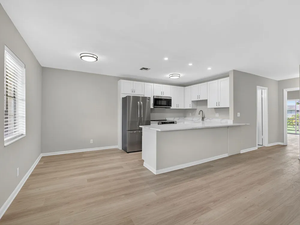 Stunning Fully Renovated Condo in Premier 55+ Community ~ Step into luxury with this beautifully renovated 2-bedroom, 1-bath condo showcasing high-end finishes throughout. From the moment you enter, you'll appreciate the sophisticated open design, featuring top-tier woodgrain plank laminate flooring that seamlessly flows through every room. The open-concept kitchen with separate dinette area is a showstopper, offering brand-new stainless steel appliances, custom cabinetry with gleaming quartz countertops, and a spacious island--perfect for entertaining or casual dining. The bathroom has designer tile with a modern vanity and light fixture. The open and airy layout is bathed in natural light, enhancing the serene, upscale atmosphere of the home. Located in one of the area's most desirable