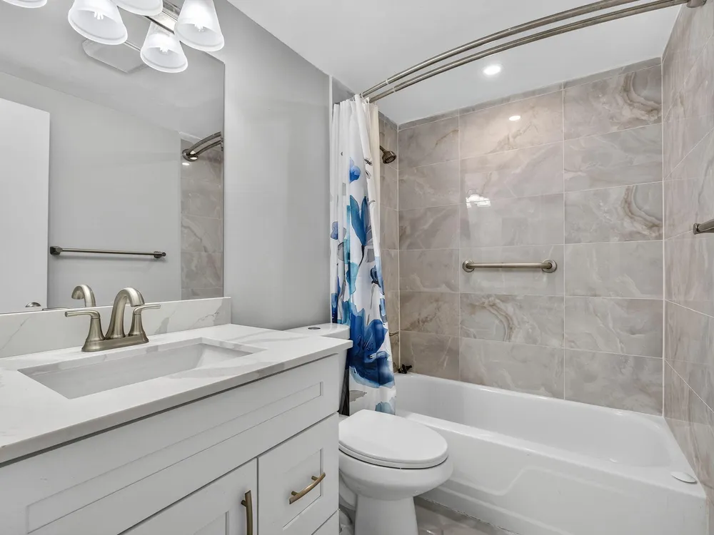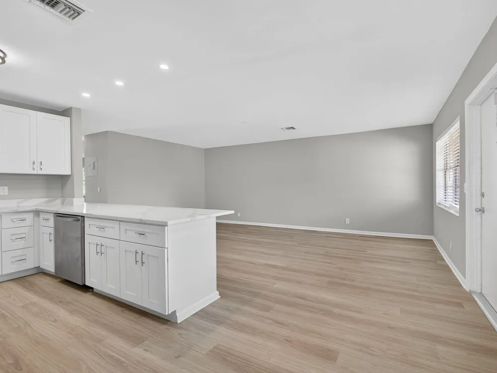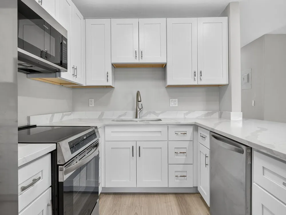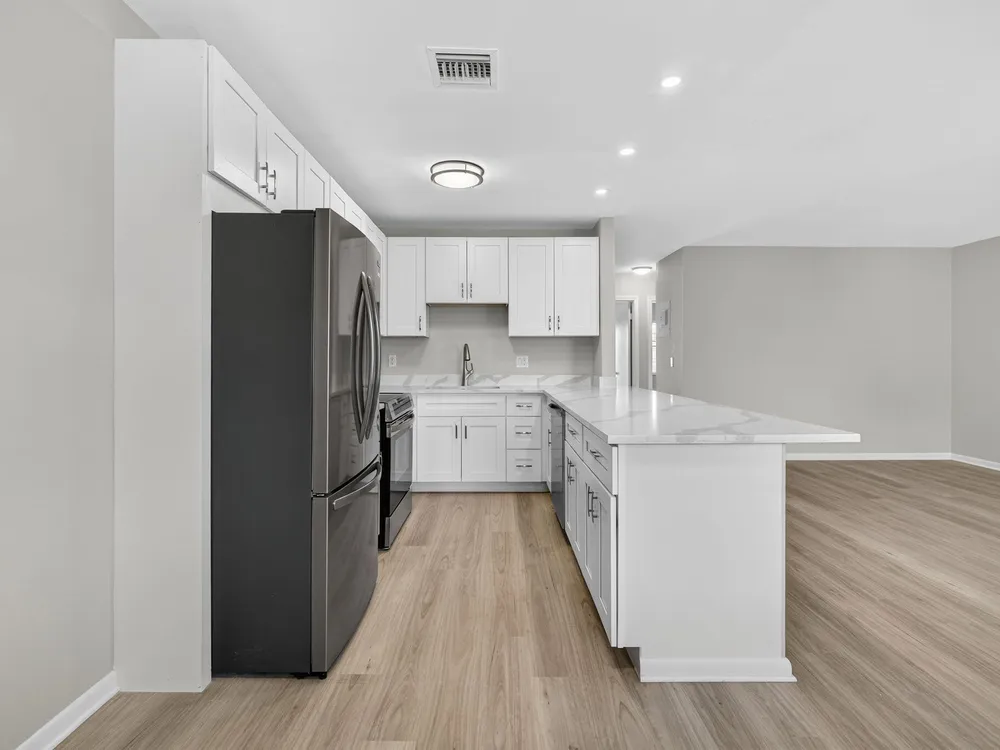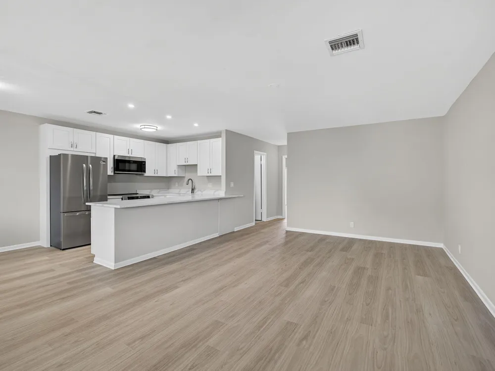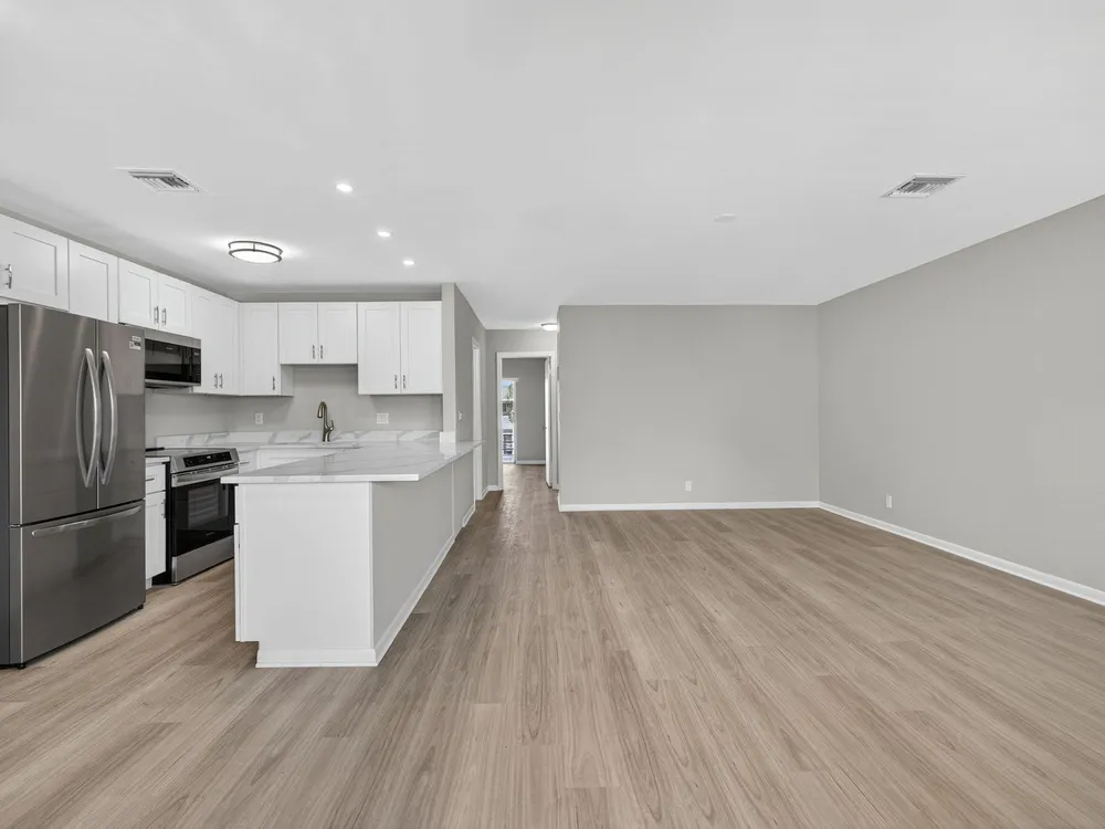 Stunning Fully Renovated Condo in Premier 55+ Community ~ Step into luxury with this beautifully renovated 2-bedroom, 1-bath condo showcasing high-end finishes throughout. From the moment you enter, you'll appreciate the sophisticated open design, featuring top-tier woodgrain plank laminate flooring that seamlessly flows through every room. The open-concept kitchen with separate dinette area is a showstopper, offering brand-new stainless steel appliances, custom cabinetry with gleaming quartz countertops, and a spacious island--perfect for entertaining or casual dining. The bathroom has designer tile with a modern vanity and light fixture. The open and airy layout is bathed in natural light, enhancing the serene, upscale atmosphere of the home. Located in one of the area's most desirable