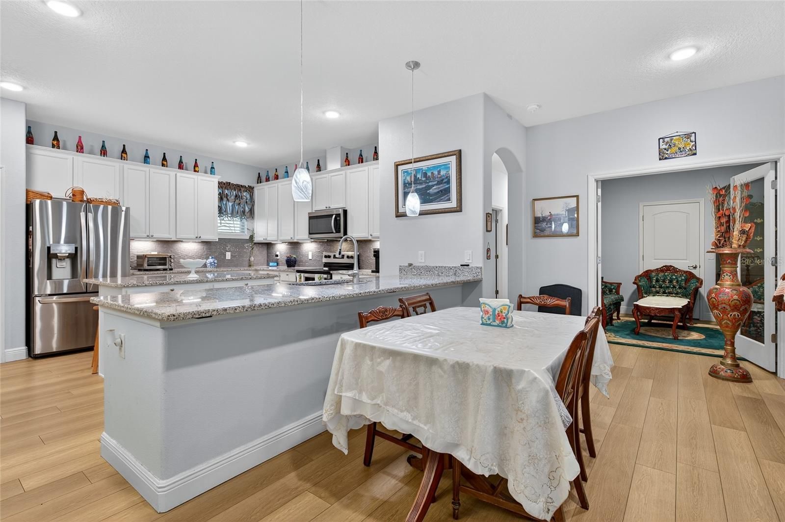 Welcome to this beautifully maintained 4-bedroom, 2-bath home with 2-car garage in the sought-after 55+ community of Huntington Village. The open floor plan flows easily through spacious living and dining areas into a large kitchen with 42-inch upper cabinets and crown molding, featuring quartz countertops, stainless steel appliances, and a second island—perfect for entertaining or everyday comfort. Enjoy the screened-in porch and outdoor patio sitting area overlooking the private fenced backyard, complete with a gutter system and French drains for added peace of mind with energy smart features. Additional upgrades include a water softener and hurricane shutters. HOA fees cover cable, internet, lawn care, irrigation, and access to resort-style amenities including a pool, clubhouse, fitness center, sauna, playground, basketball court, and dog park—offering the best in maintenance-free living.