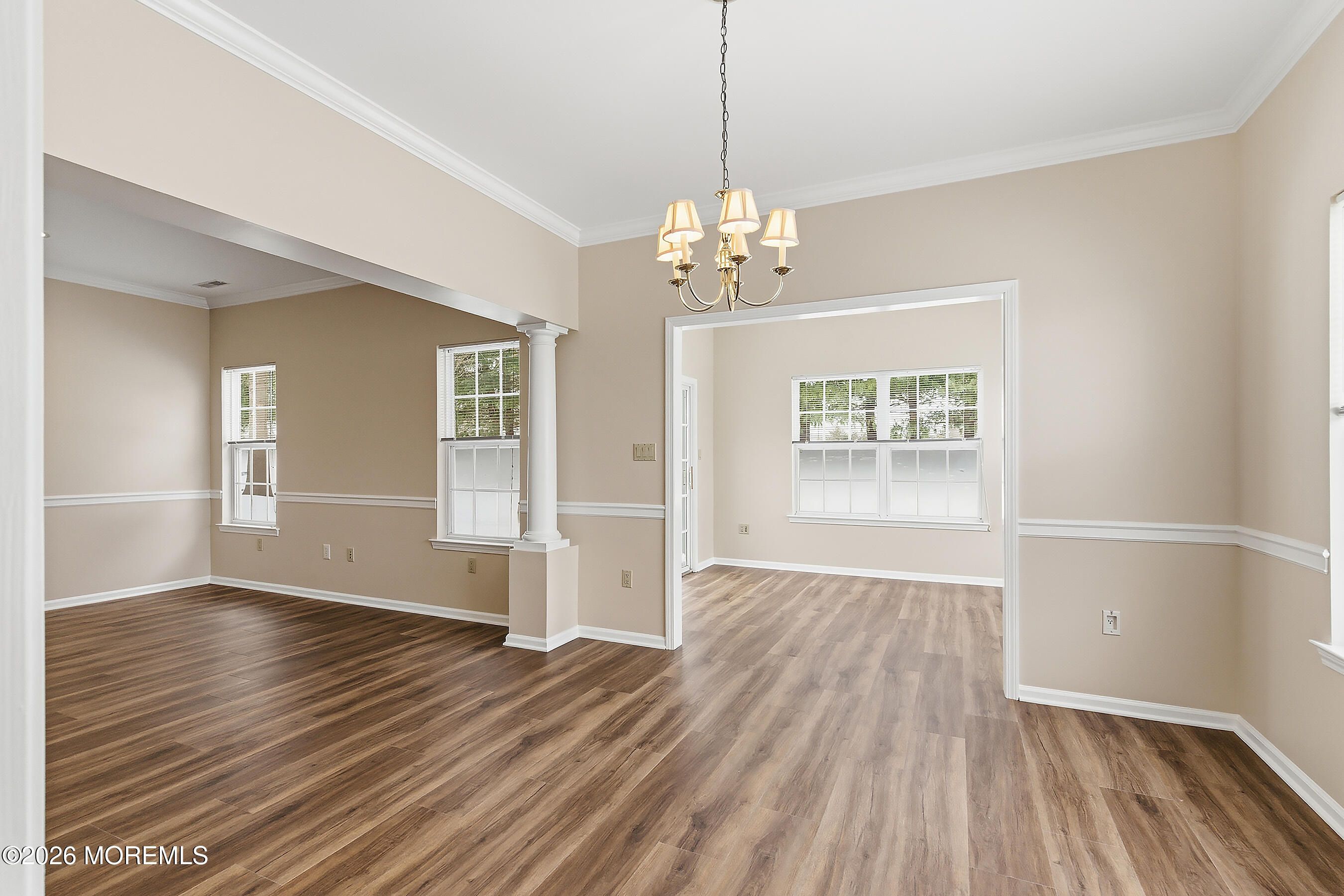 Welcome to The Villas at Jumping Brook where refined comfort meets easy, resort-style living. This beautifully updated Augusta model offers two bedrooms and two full baths with an expansive, light-filled layout designed for both everyday living and entertaining. The oversized living room impresses with 9-foot ceilings, crown and chair moldings, recessed lighting, The eat-in kitchen features a pantry and convenient pass-through to the dining room with decorative columns, ideal for hosting. An effortless flow into the sun-drenched den/sun room with sliders leading to patio. Serene primary suite boasts a tray ceiling, walk-in closet, and an en-suite bath with double sinks and a large shower stall with a new door, while a generously sized guest bedroom (see more)... complemented by a full bath just steps away. A laundry/mud room with direct access to the two-car garage, brand-new wood-style flooring throughout, and fresh paint complete the home. Residents enjoy an easy, breezy lifestyle with access to a clubhouse, community pool, tennis and bocce courts, all adjacent to Jumping Brook Country Club and Golf Course, and conveniently located near shopping, dining, beaches, the Garden State Parkway, and Route 18.