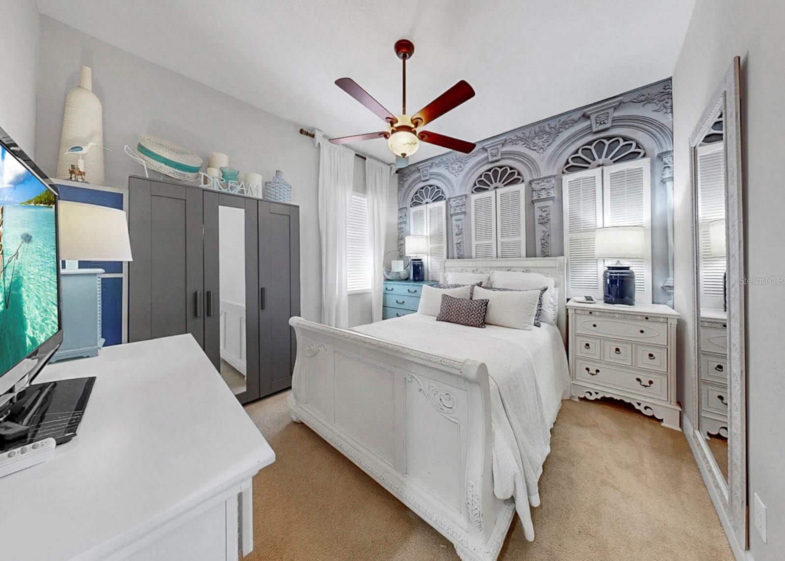 - Ceiling Fan(s), Kitchen/Family Room Combo, Main Level Primary, Solid Surface Counters, Split Bedrooms, Thermostat, Window Treatments