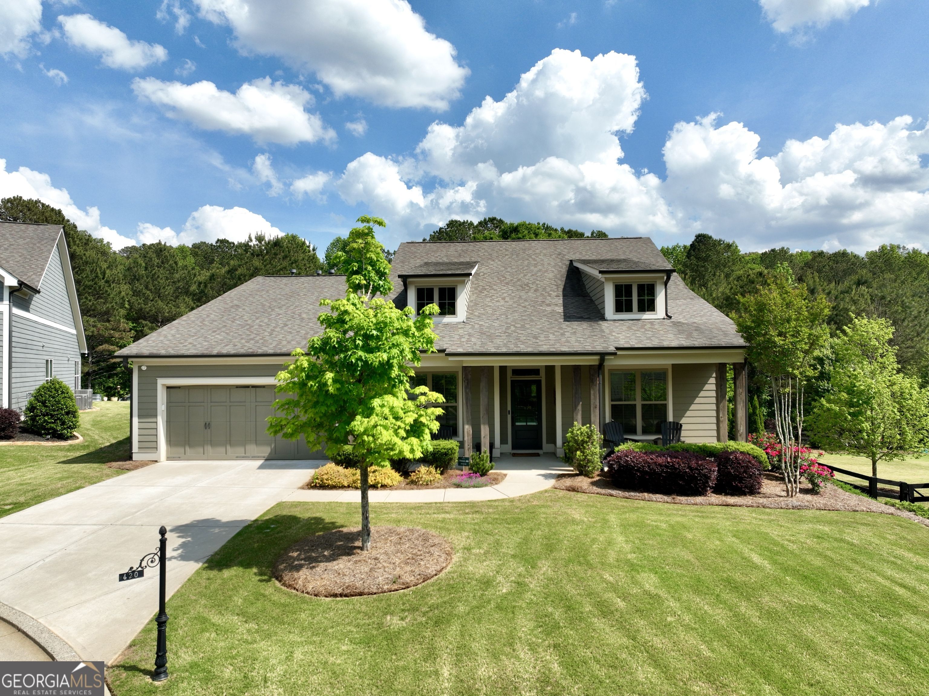 Welcome to maintenance-free living in the sought-after Larkspur Active Adult Community, a gated enclave designed for connection, convenience, and resort style enjoyment. This beautifully maintained Craftsman home, built by Edward Andrews Homes in 2017, features the desirable Ashland Phase II floor plan and is tucked away on a quiet cul-de-sac. Residents enjoy an exceptional array of amenities, including a resort-style swimming pool, pickleball and bocce ball courts, walking trails, a community garden, and the charming Ranch House clubhouse, home to social gatherings, concerts, wine clubs that foster a true sense of community. The HOA provides maintenance free living, covering lawn care, shrub trimming, seasonal fresh pine straw (spring and fall), and weed control, allowing you to enjoy your home without the upkeep. Ideally located near Vickery Village, Halcyon, Avalon, the Big Creek Greenway, and Echelon Golf Club, this home offers both tranquility and accessibility. Enjoy the benefit of Cherokee County taxes with an Alpharetta mailing address. This is an opportunity to embrace an active, social lifestyle in a beautifully cared for home within one of the area's most desirable active adult communities. Gate entrance is closed 24/7. Gate code will be provided at time of home tour.