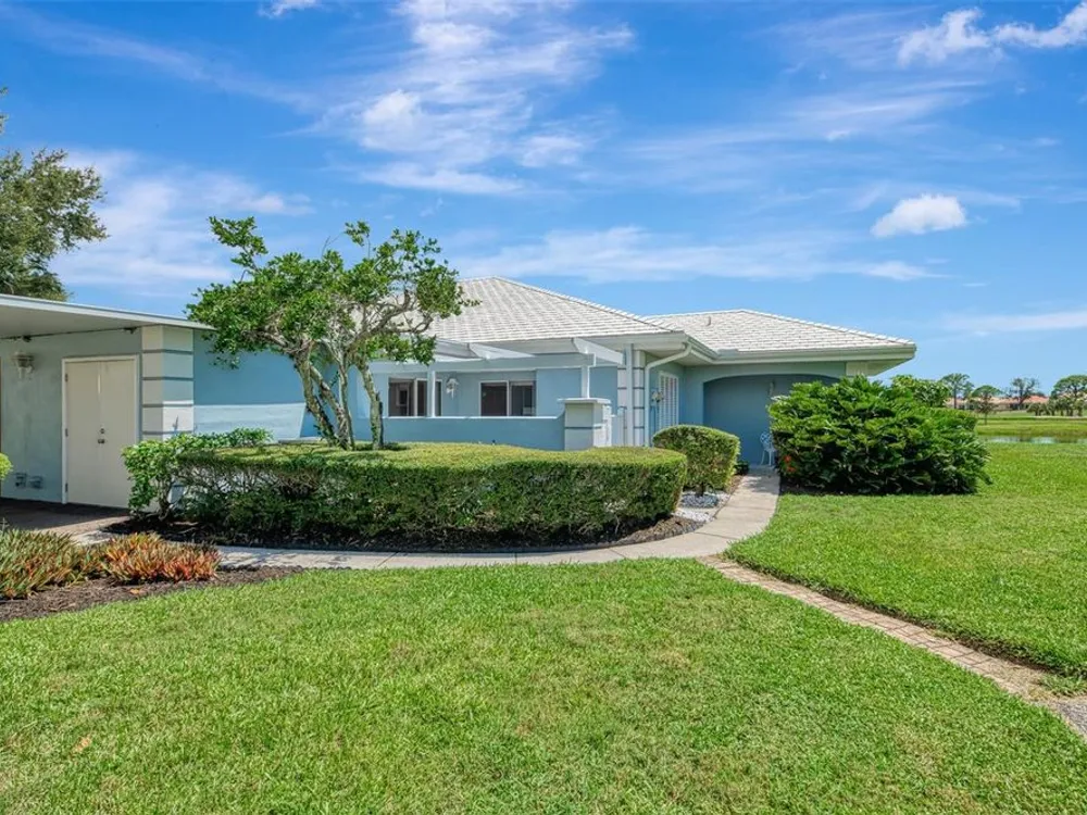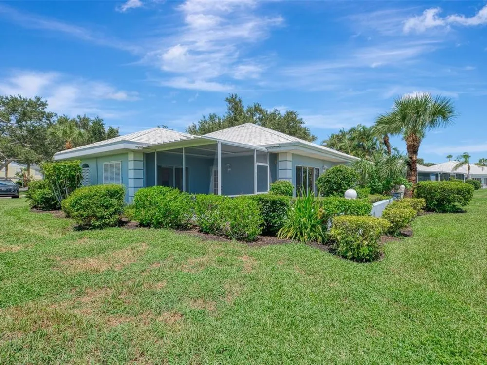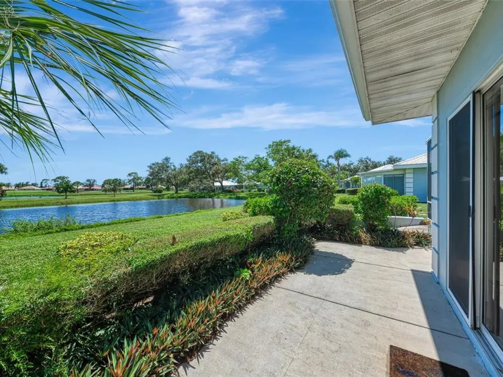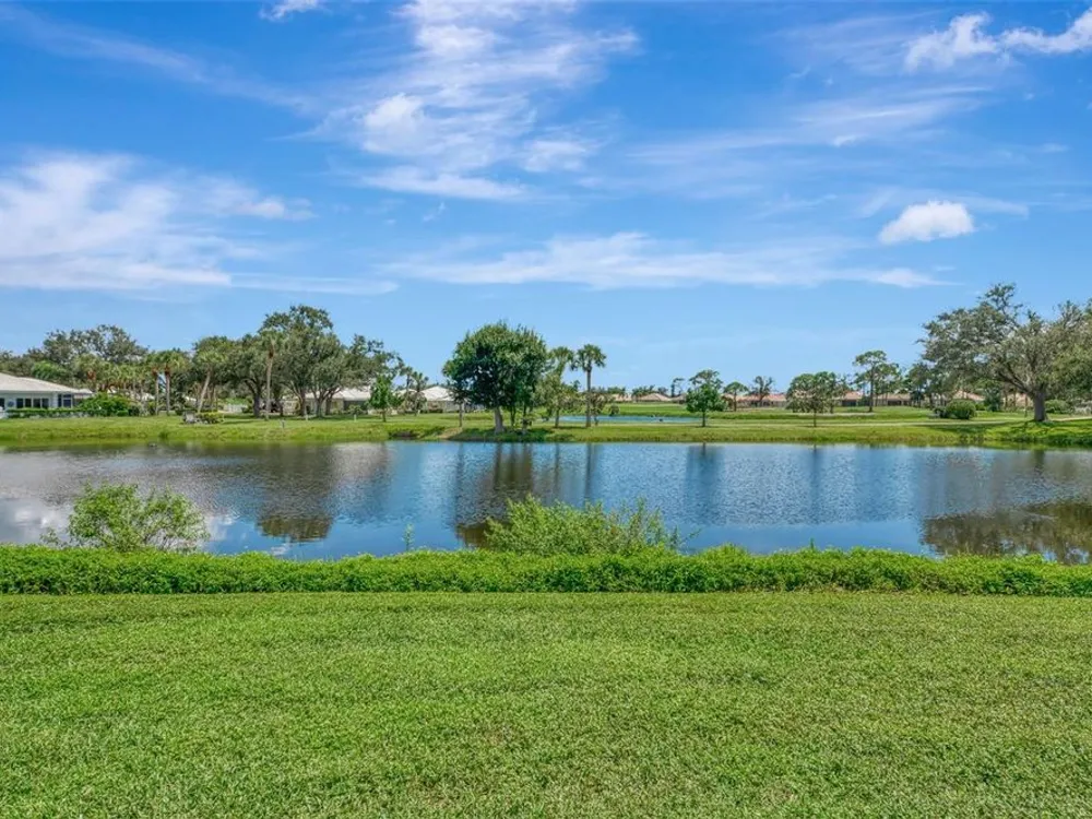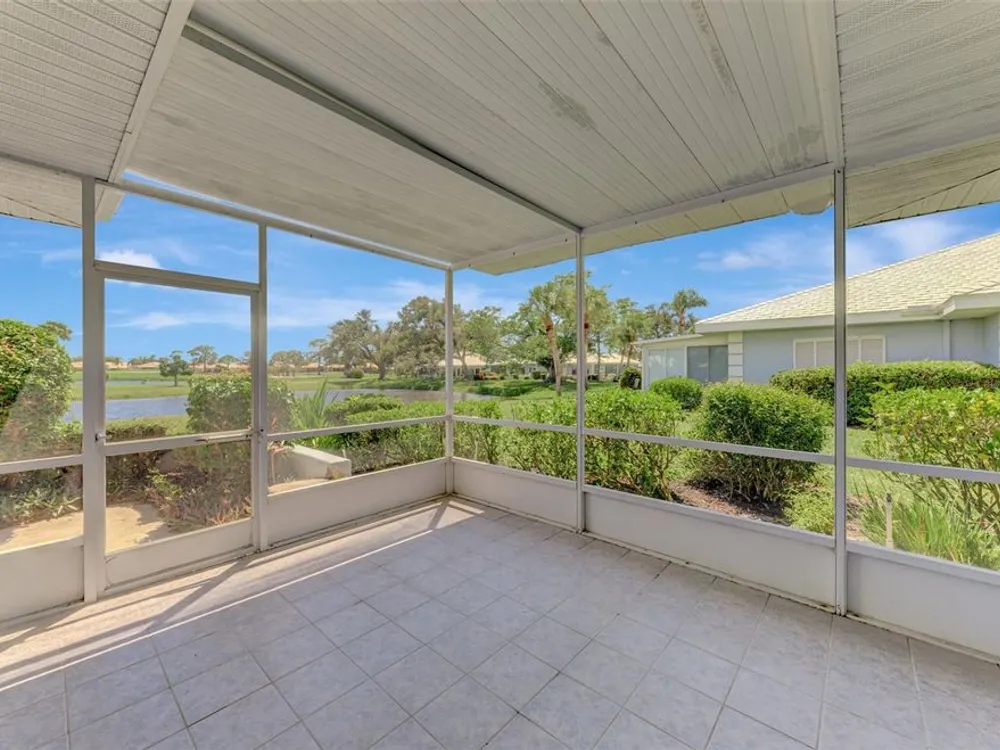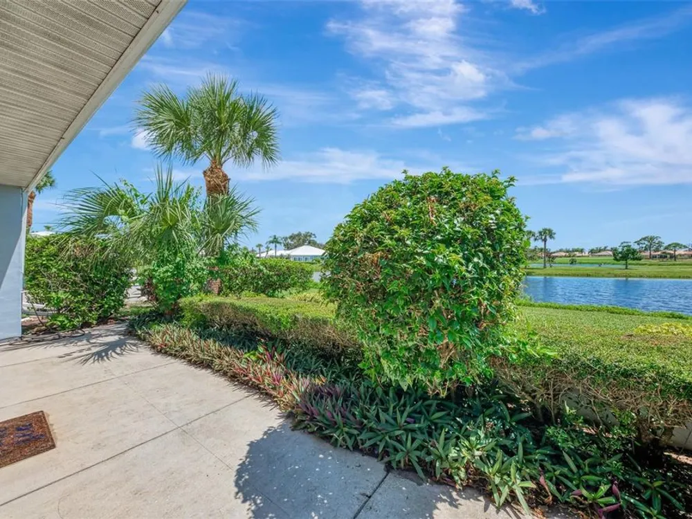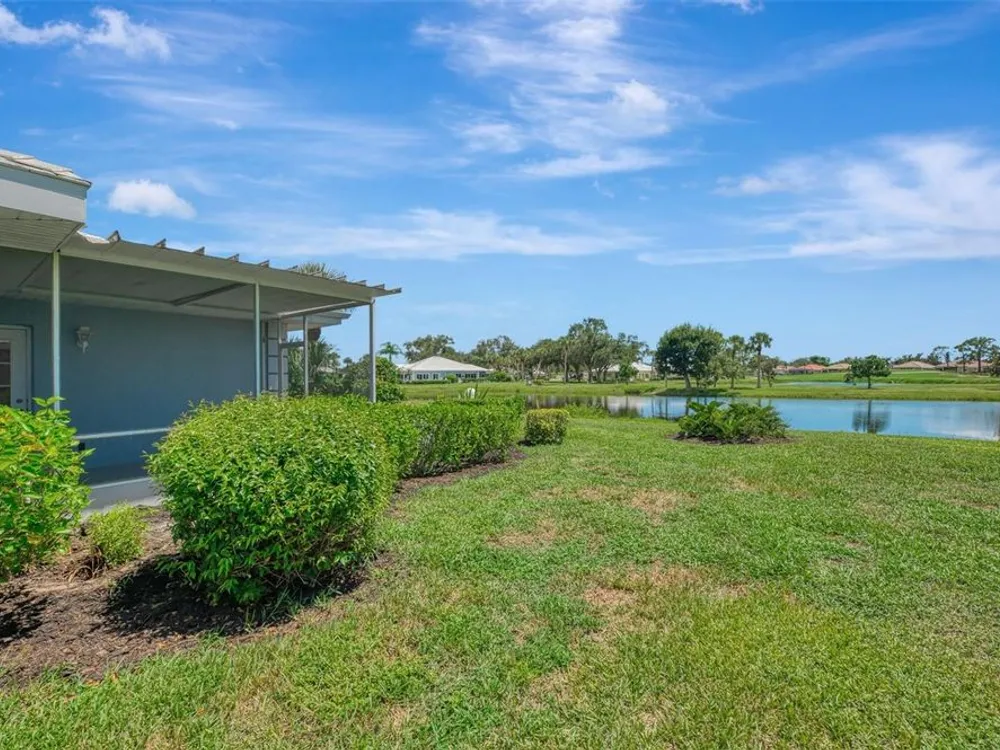 Stunning waterfront views in this villa home located in the desirable Augusta Villas community! Not one but two lake views and the wonderful planation golf course just beyond makes this home among the best locations and best views in all of August Villas. This 3 bedroom, 2 bathroom home is currently setup with one of the bedrooms extending the living area, giving you additional lighting and living space. The primary bedroom is unique featuring an additional den/office, or flex space. This space serves as an added benefit by connecting the previously detached laundry room directly to the interior of the home for added convenience. The primary bedroom features an updated en-suite bath with dual vanities and sinks, a walk-in roman style shower, plus a large walk-in closet. Updated kitchen with granite counters and stainless-steel fridge, hood, and oven. Fantastic water views from your screened lanai area, and from the main living area. Unique front gated porch area with pergola gives you lots of additional outdoor living space. Conveniently located close to Wellen Park, Historic Downtown Venice, and Gulf Coast Beaches. The Augusta Villas community features two community pools, included lawn maintenance, and exterior home maintenance including roof replacement and cleaning. Optional golf, social, or fitness membership to the Plantation Golf and Country Club just down the road. Come and see this wonderful home today!