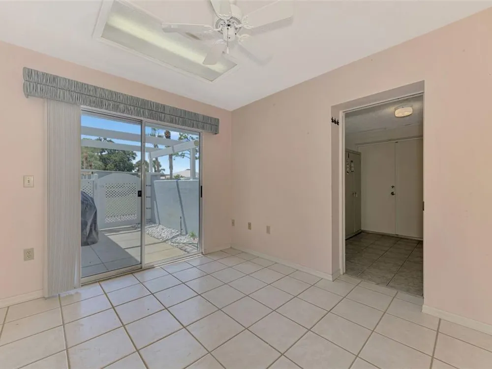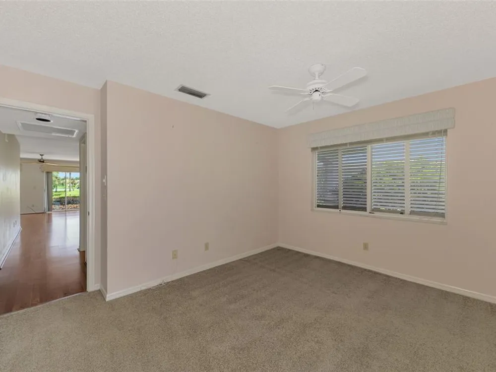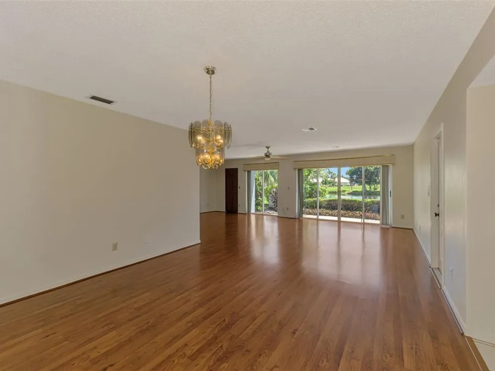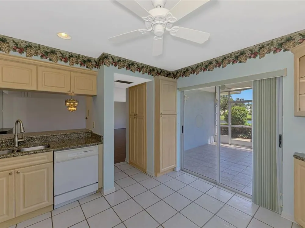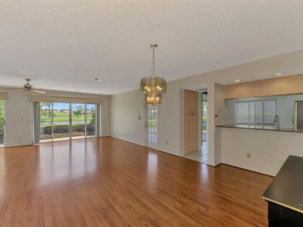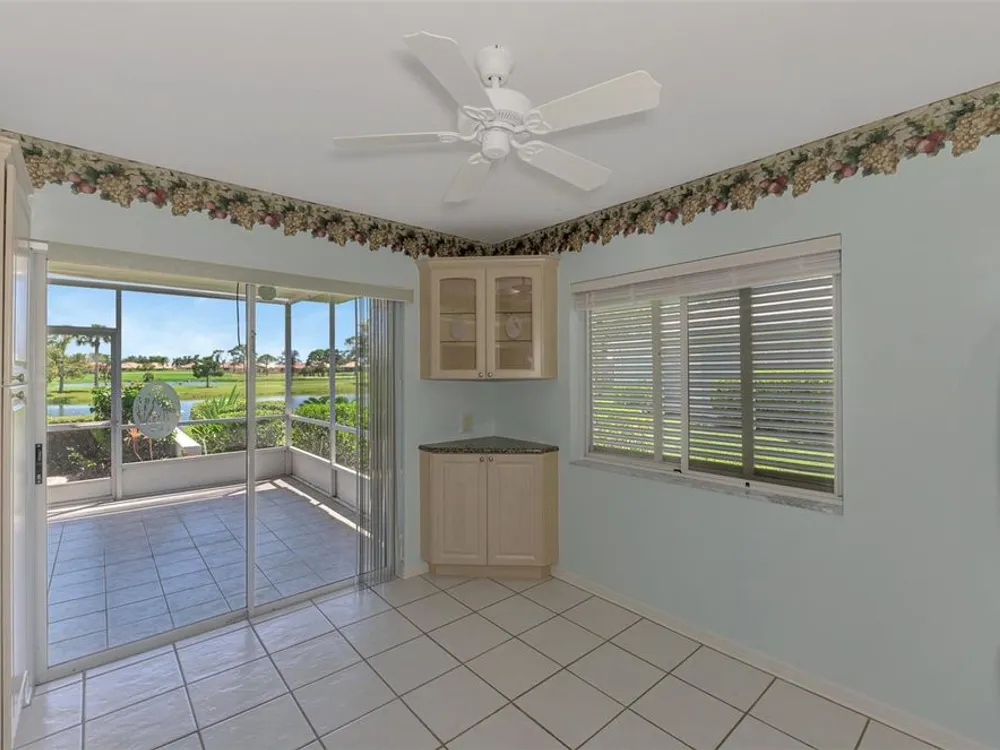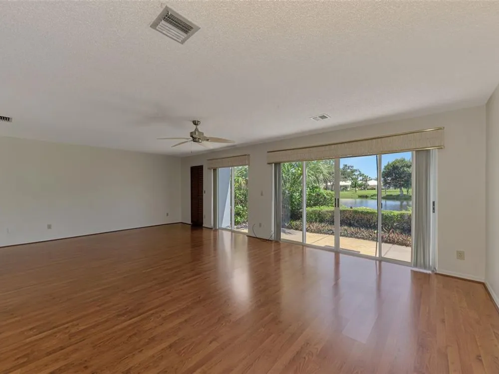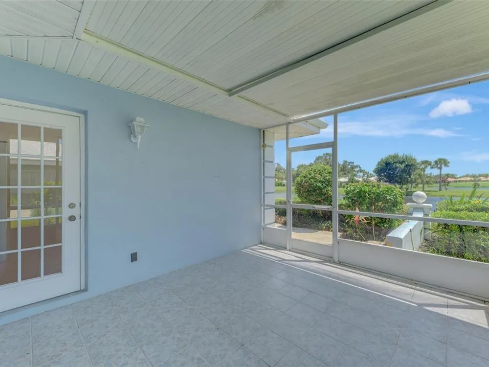 Stunning waterfront views in this villa home located in the desirable Augusta Villas community! Not one but two lake views and the wonderful planation golf course just beyond makes this home among the best locations and best views in all of August Villas. This 3 bedroom, 2 bathroom home is currently setup with one of the bedrooms extending the living area, giving you additional lighting and living space. The primary bedroom is unique featuring an additional den/office, or flex space. This space serves as an added benefit by connecting the previously detached laundry room directly to the interior of the home for added convenience. The primary bedroom features an updated en-suite bath with dual vanities and sinks, a walk-in roman style shower, plus a large walk-in closet. Updated kitchen with granite counters and stainless-steel fridge, hood, and oven. Fantastic water views from your screened lanai area, and from the main living area. Unique front gated porch area with pergola gives you lots of additional outdoor living space. Conveniently located close to Wellen Park, Historic Downtown Venice, and Gulf Coast Beaches. The Augusta Villas community features two community pools, included lawn maintenance, and exterior home maintenance including roof replacement and cleaning. Optional golf, social, or fitness membership to the Plantation Golf and Country Club just down the road. Come and see this wonderful home today!