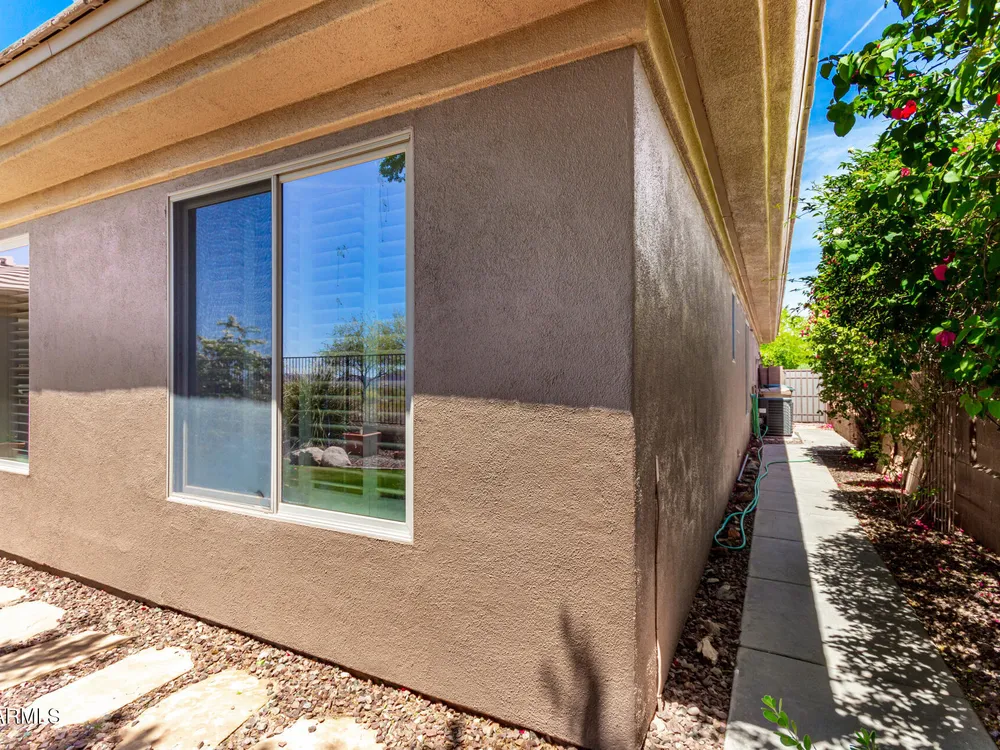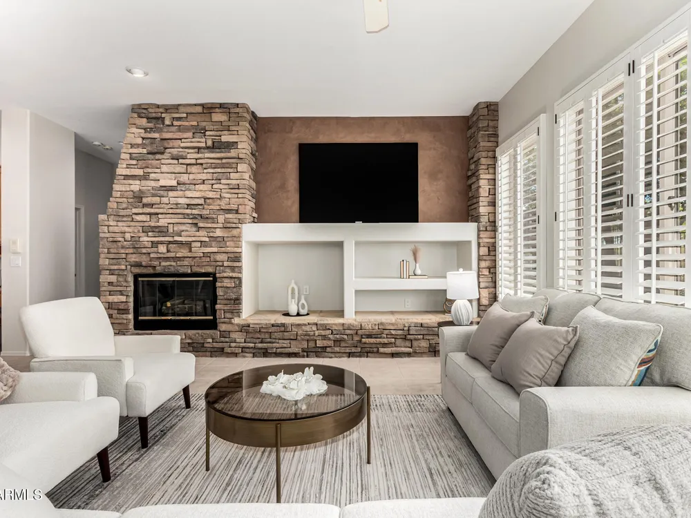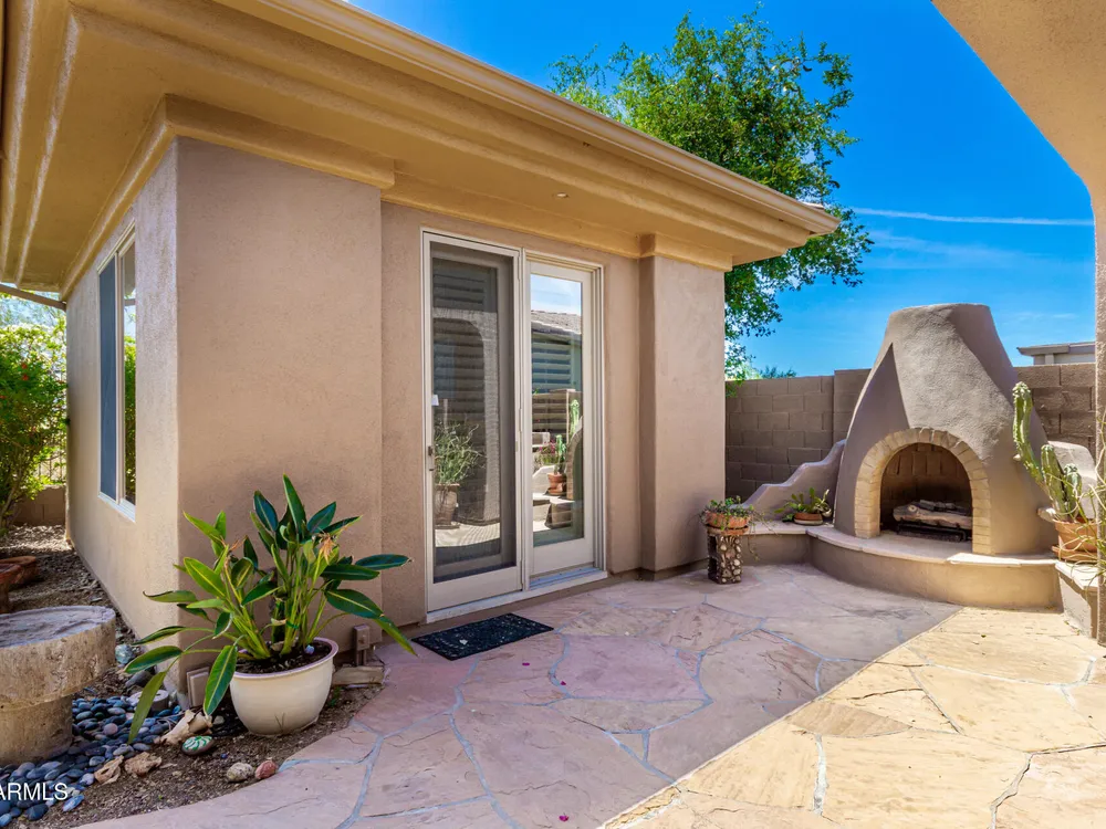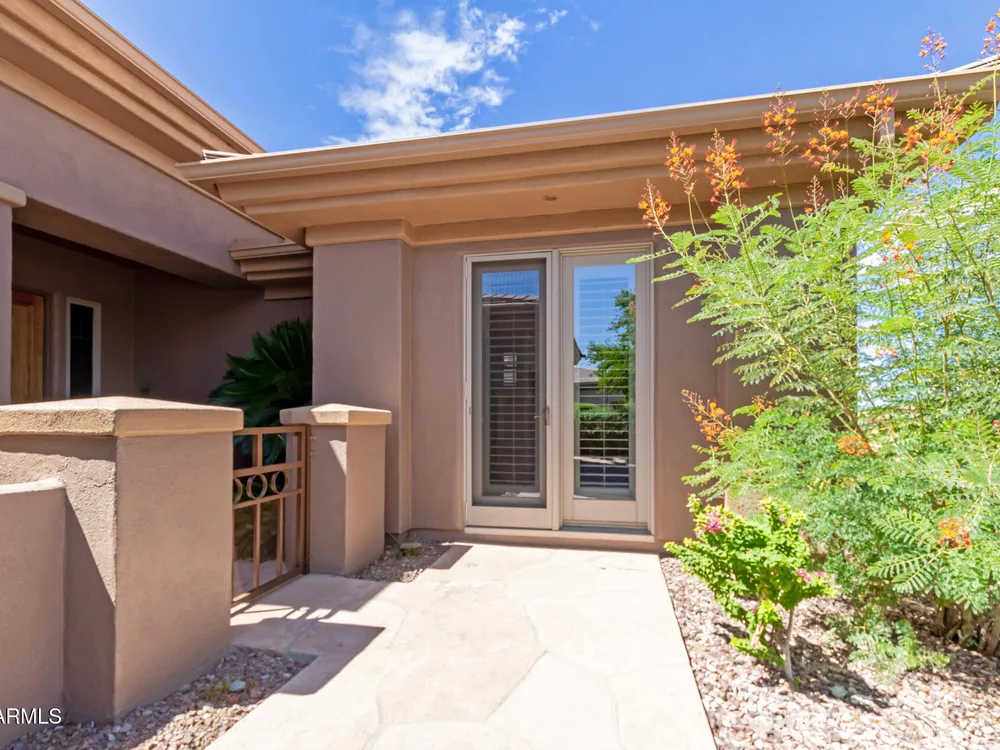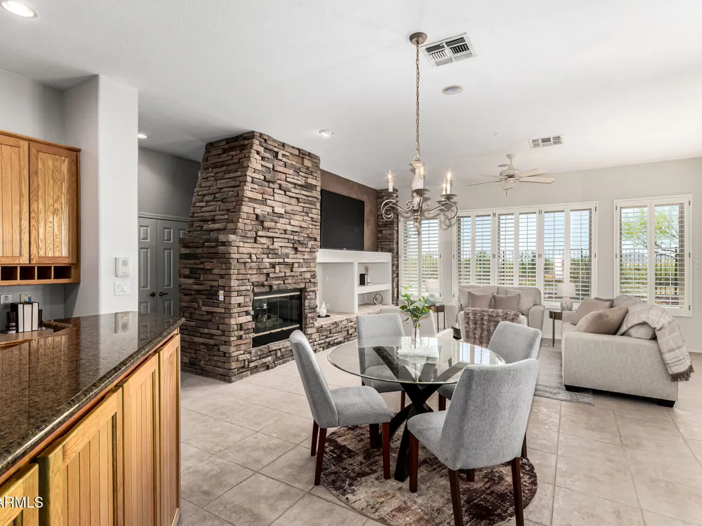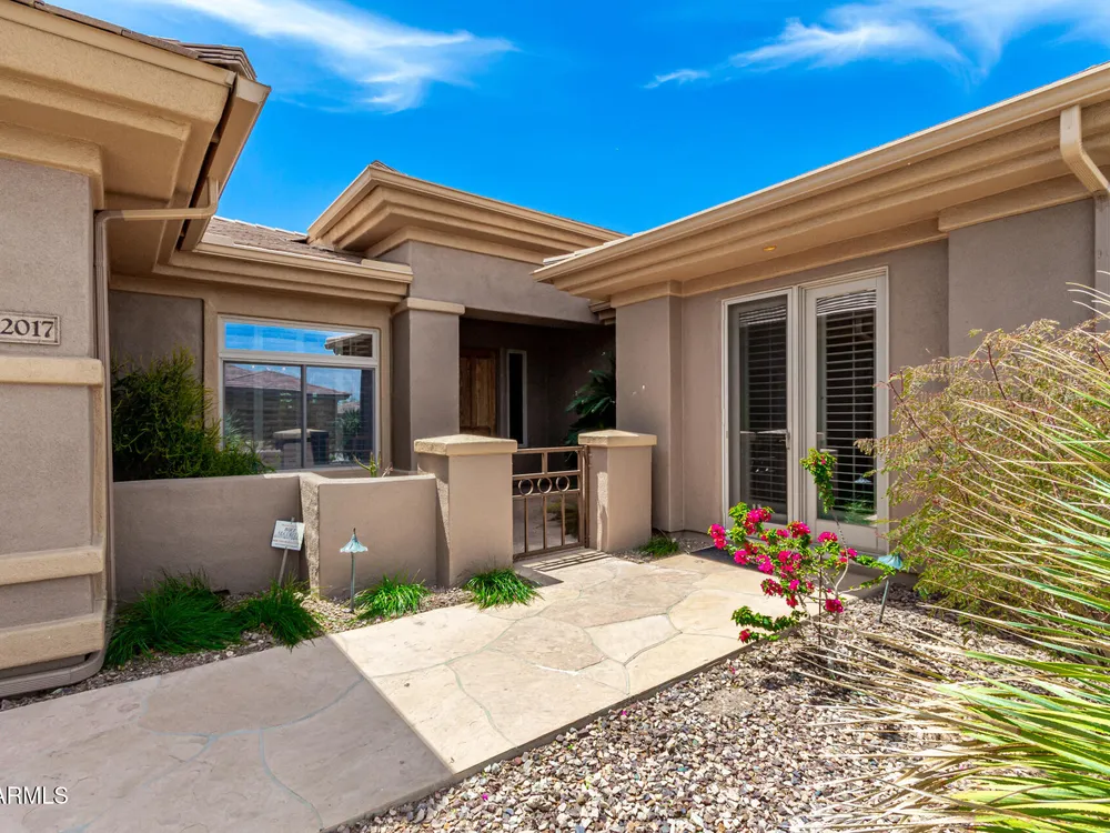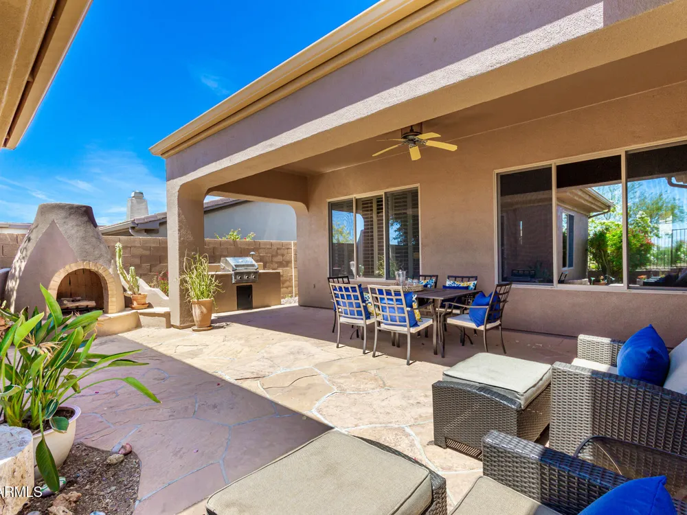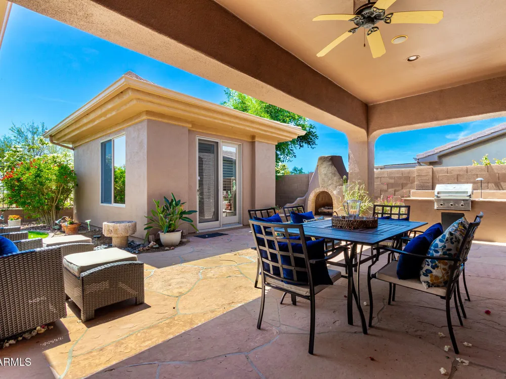 Welcome to Anthem Country Club living! Priced to sell $73k under recent comps. This home located on the 9th fairway of Persimmon Golf Course features a main house (2 bdrs & den), Casita (1 bdr & half bath), and a Cabana (1 bdr & full bath). Venetian plaster to add a design splash around home and a floor to ceiling stacked stone wall in FR and den. Den offers built in desk and shelving for the at home executive. You will find granite slab, a SubZero built-in fridge, Bosch dishwasher, and GE gas range in the kitchen. Many wonderful gatherings will happen on the patio entertainment area with built in BBQ and wood burning fireplace. Full roof replacement 2024 (warranty), R/O system 2024 (warranty), 2 AC's replaced in 2019 (warranty), and exterior paint completed in 2024. Put this home on your must see list!