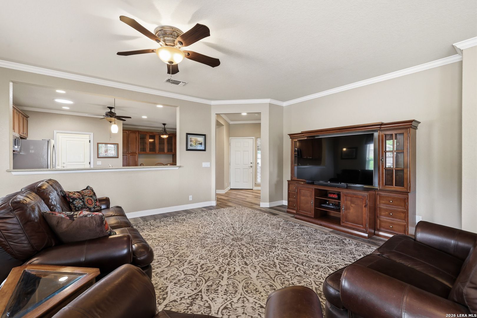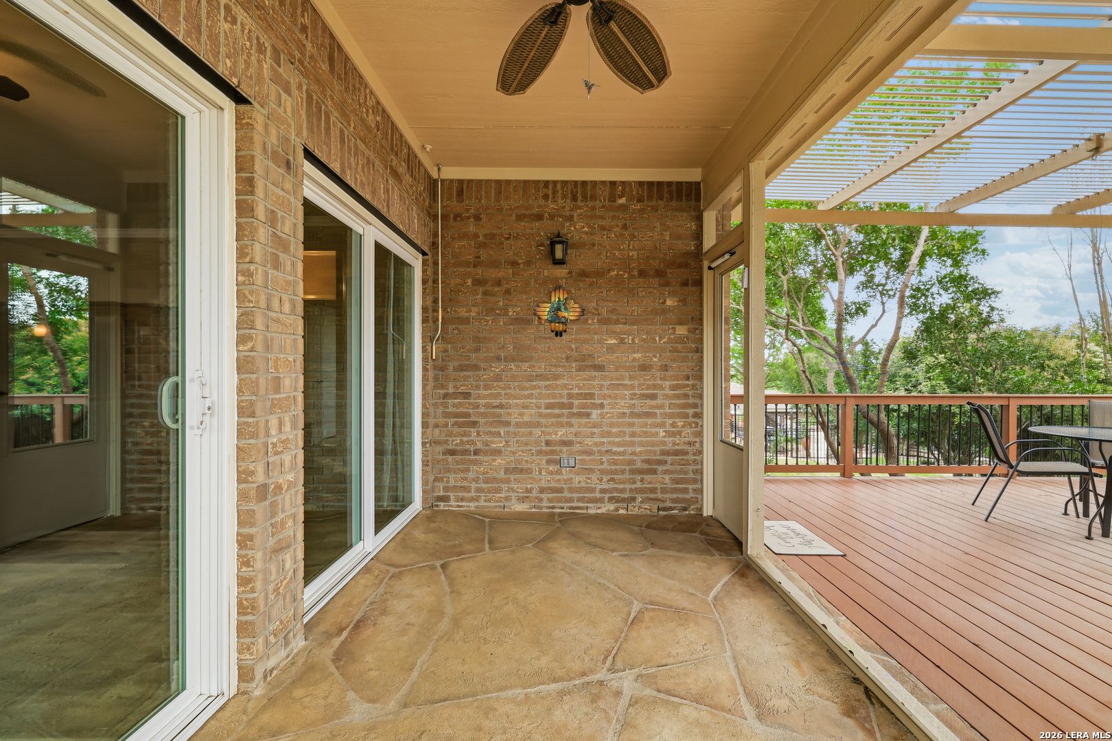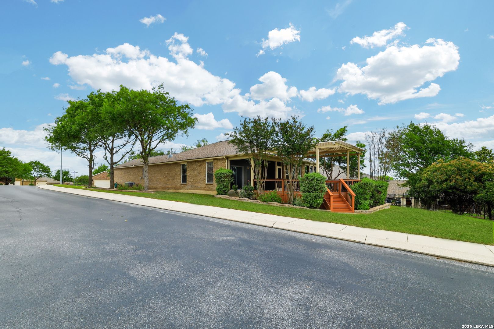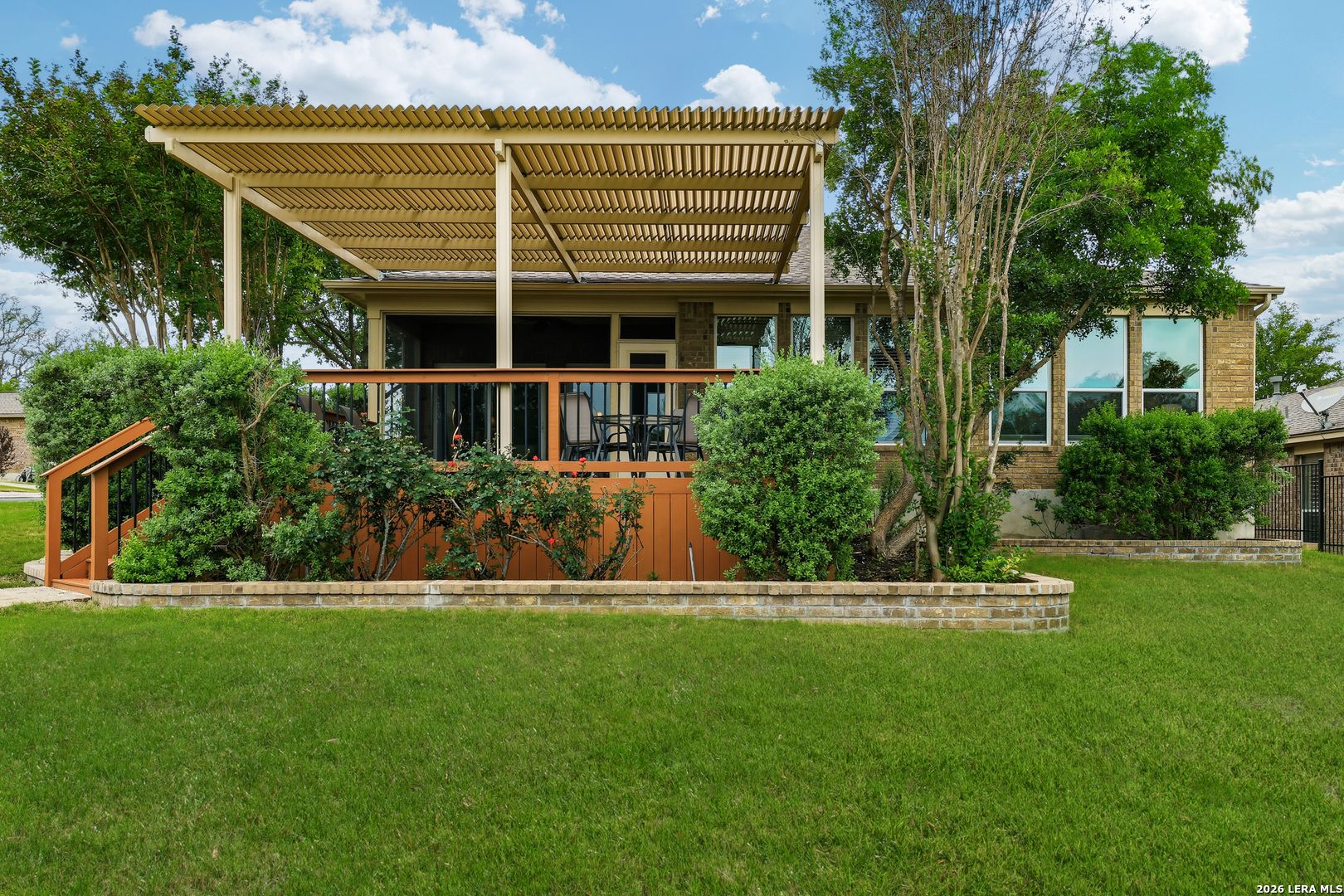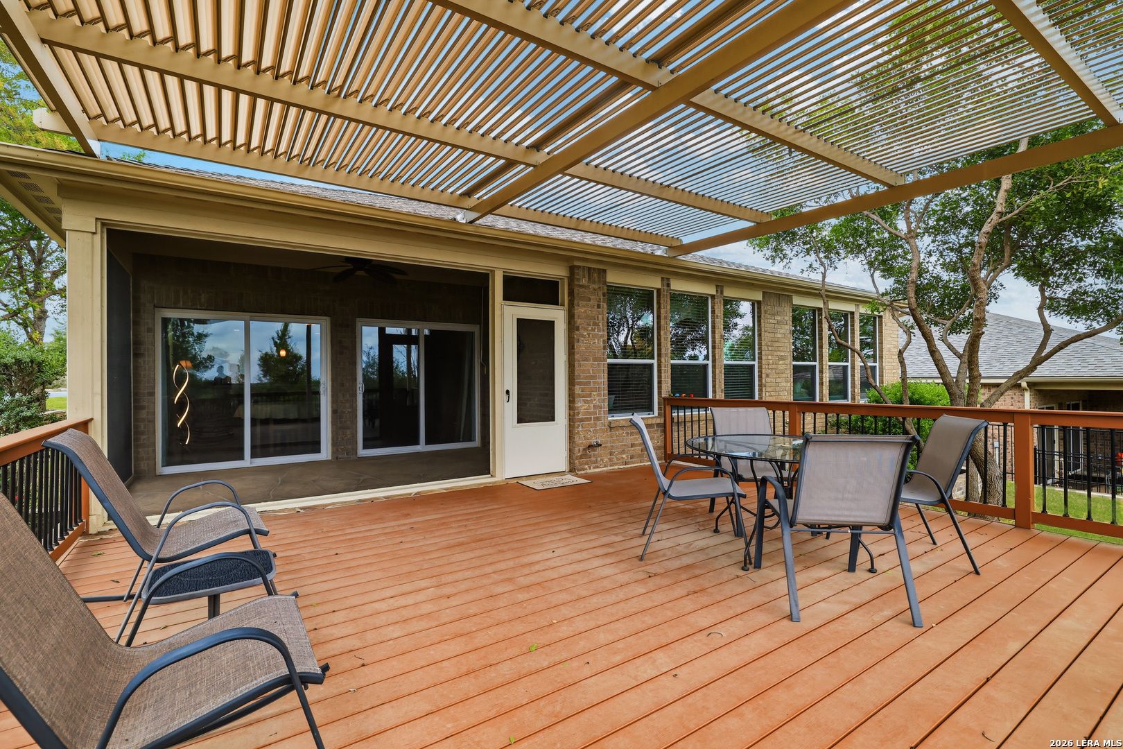 Welcome to 4202 Black Rock in San Antonio's premier 55+ community, Hill Country Retreat, where thoughtful upgrades and resort-style living come together beautifully. This beautifully maintained 2-bedroom, 2-bath home with a private study offers a spacious open-concept layout designed for both everyday comfort and effortless entertaining. The heart of the home is the well-appointed kitchen featuring Corian countertops, stainless steel appliances, a large island with ample storage, and cabinet pullouts throughout for ease of access. What truly sets this home apart is the extensive list of recent improvements and high-value upgrades. Enjoy luxury vinyl plank flooring throughout the main living areas, bedrooms, and flex space, along with crown molding and upgraded baseboards that add a refined finish. Step outside to an exceptional outdoor living space featuring a massive 19x19 Ipe wood deck and an upgraded pergola with adjustable louvers, offering the perfect blend of shade and sunlight. The screened-in patio, heavy-duty sliders, and beautiful landscaping with brick edging and mature trees create a private, serene retreat ideal for year-round enjoyment. Major system updates provide peace of mind, including a Carrier 16 SEER HVAC system (2024), roof replacement with ridge vents (2021), water heater (2024), and water softener system updates (2024). Additional features like WiFi-enabled sprinkler system, skylight tunnels for natural light, added cabinetry, and storm doors enhance both functionality and efficiency. Situated on a desirable corner lot with scenic views, this home offers both space and privacy within one of San Antonio's most sought-after active adult communities. Residents of Hill Country Retreat enjoy a 28,000 sq. ft. amenity center, indoor/outdoor pools, fitness center, walking trails, social clubs, and a vibrant lifestyle calendar. This is the perfect blend of low-maintenance living, thoughtful upgrades, and community lifestyle-all in a prime location close to shopping, dining, and medical facilities.
