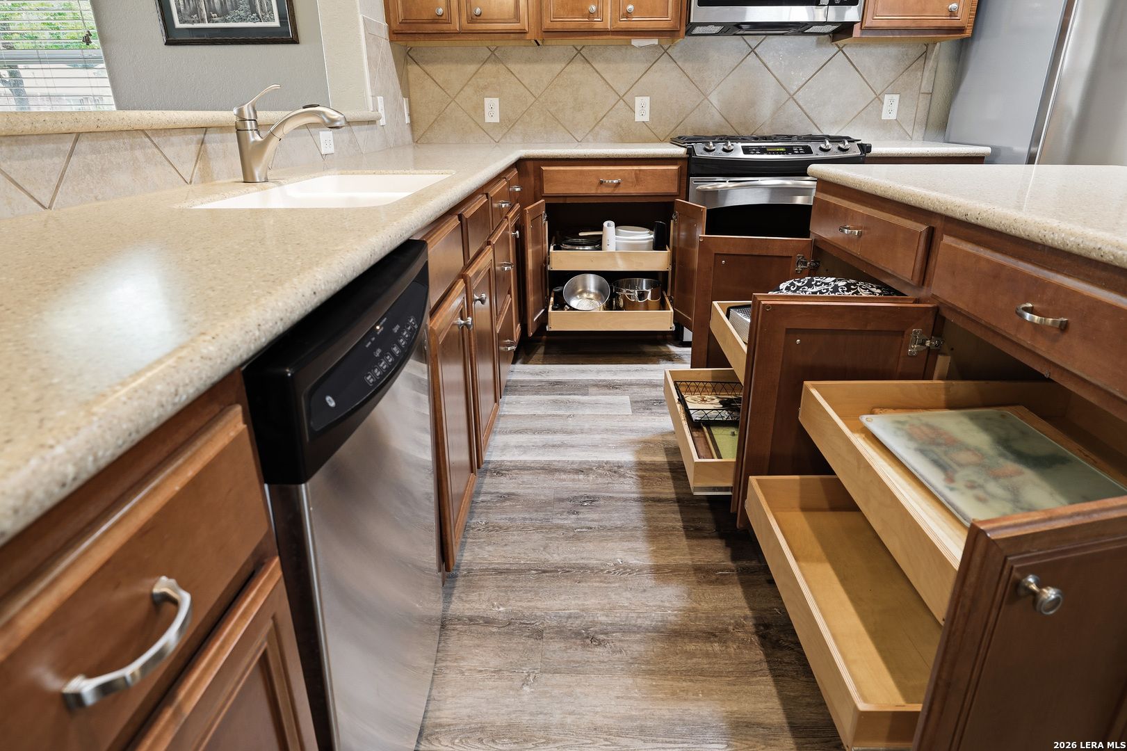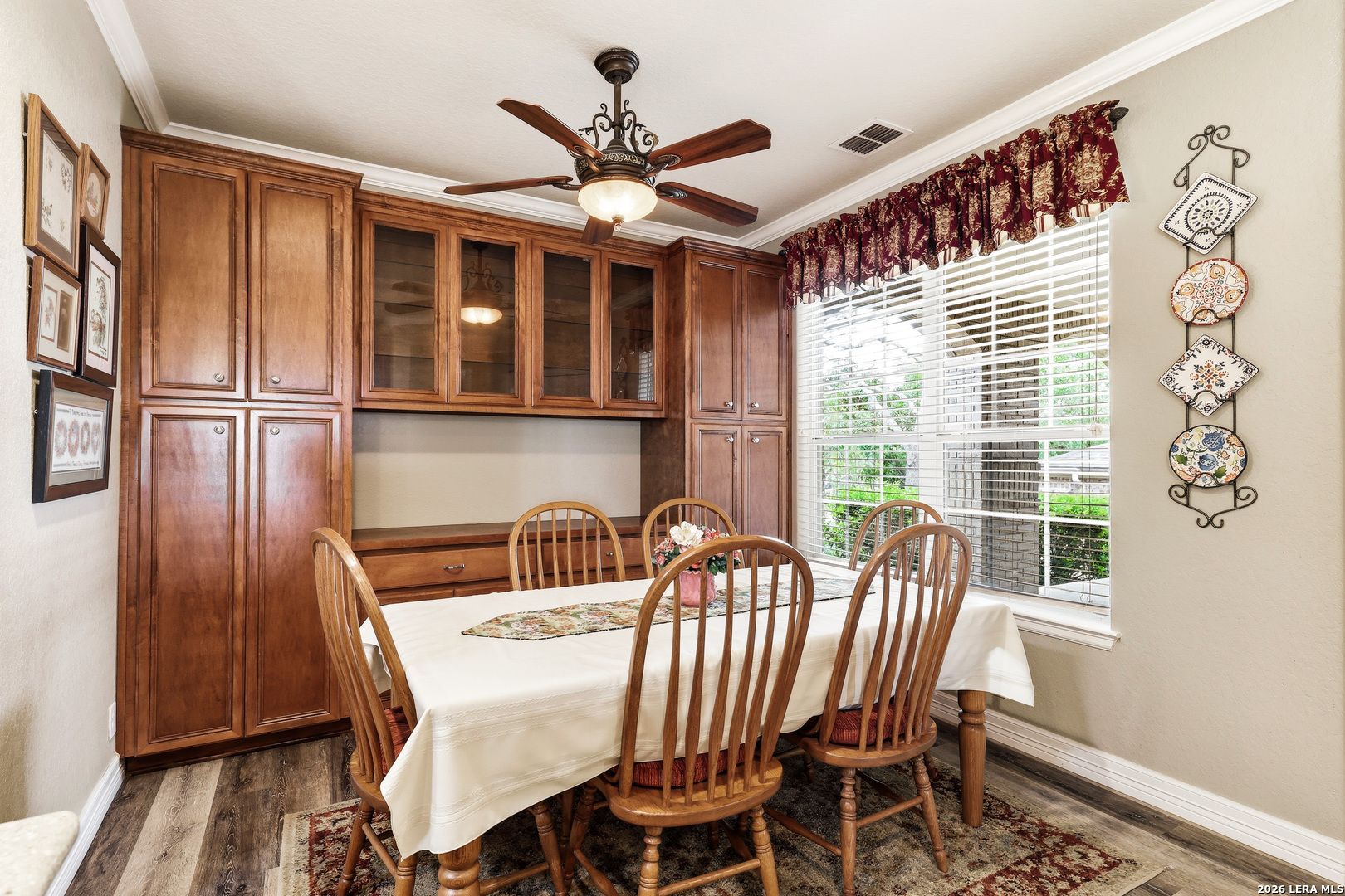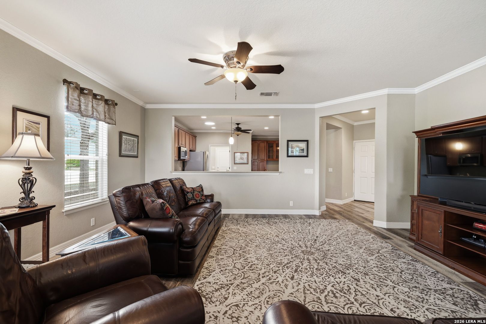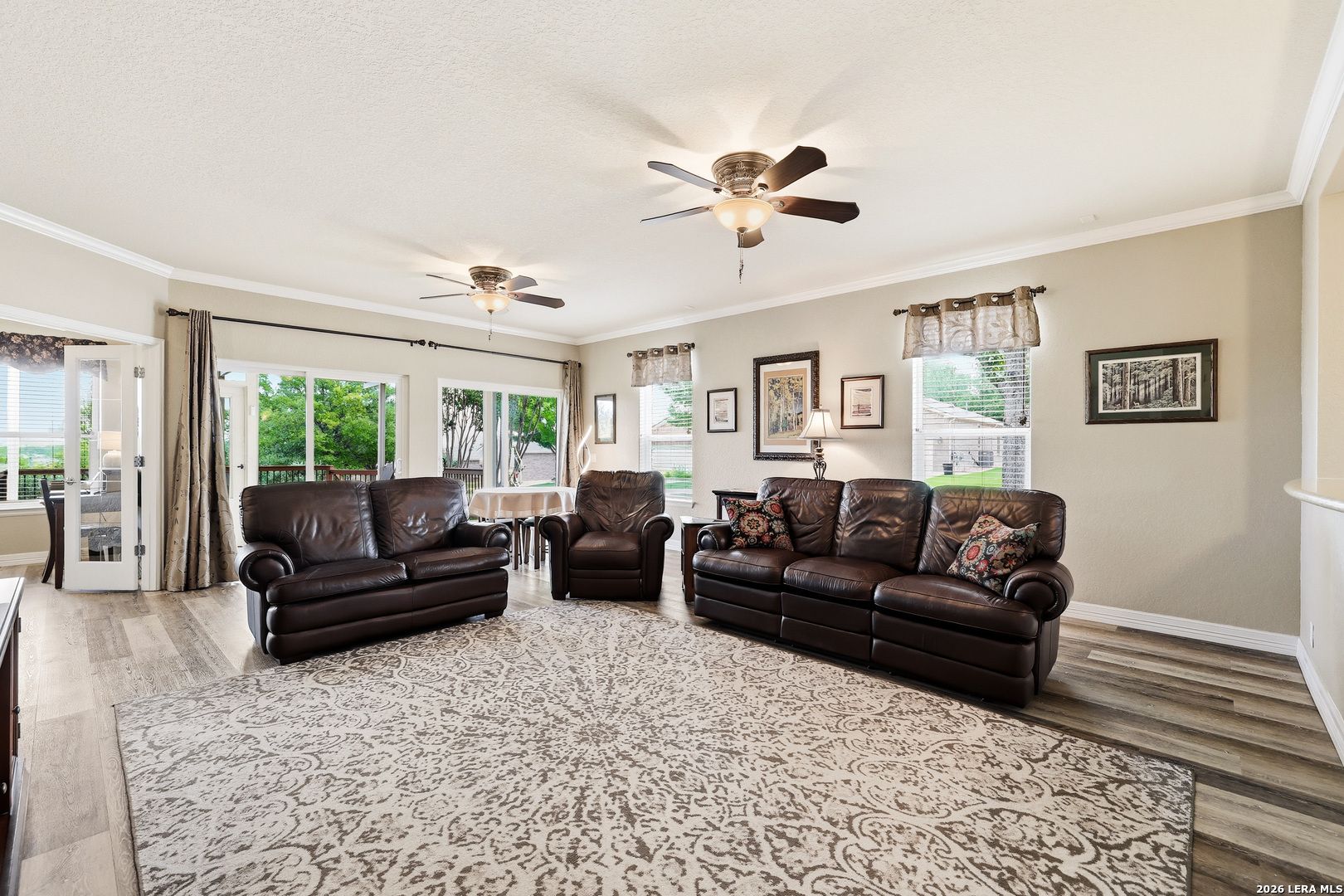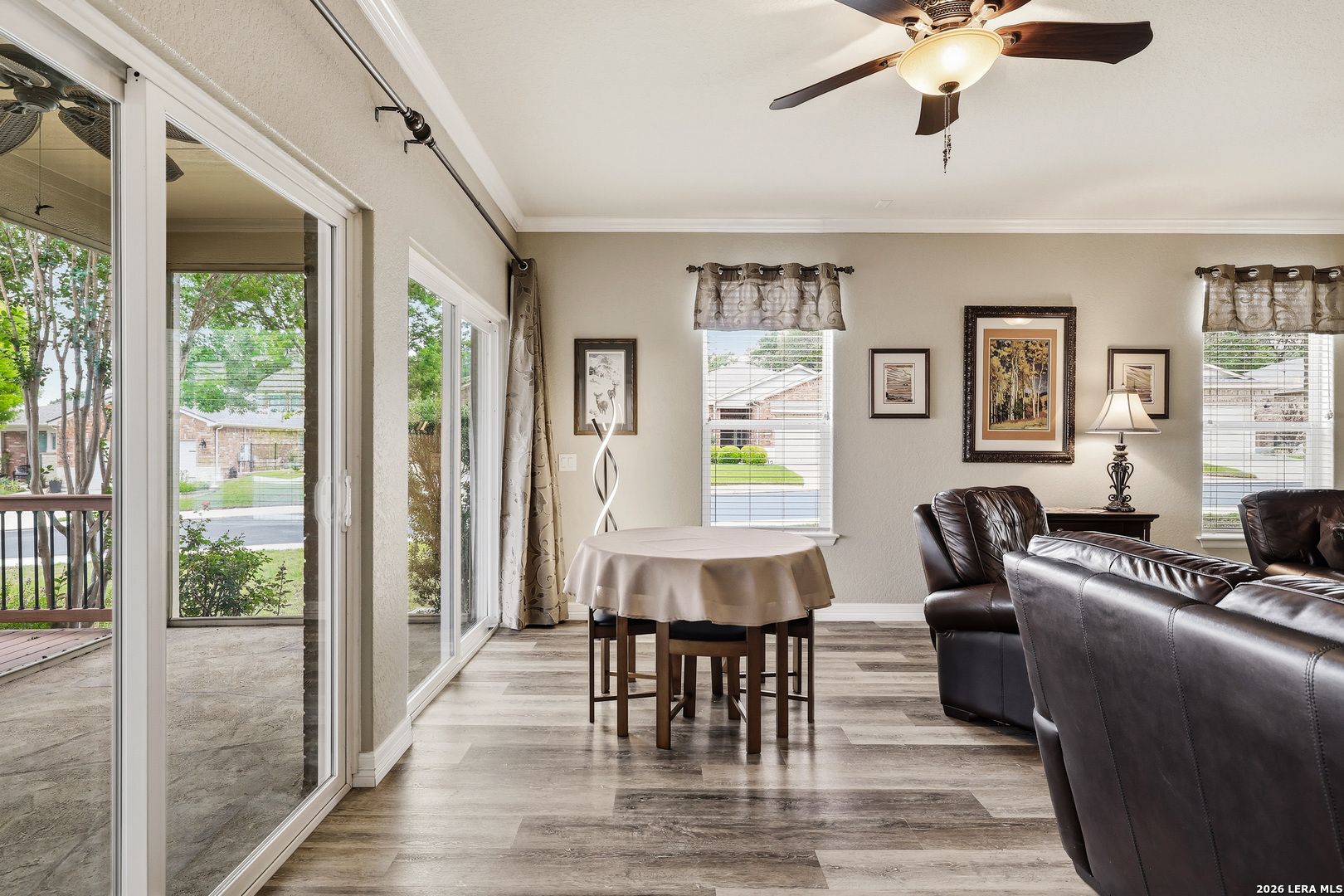 Welcome to 4202 Black Rock in San Antonio's premier 55+ community, Hill Country Retreat, where thoughtful upgrades and resort-style living come together beautifully. This beautifully maintained 2-bedroom, 2-bath home with a private study offers a spacious open-concept layout designed for both everyday comfort and effortless entertaining. The heart of the home is the well-appointed kitchen featuring Corian countertops, stainless steel appliances, a large island with ample storage, and cabinet pullouts throughout for ease of access. What truly sets this home apart is the extensive list of recent improvements and high-value upgrades. Enjoy luxury vinyl plank flooring throughout the main living areas, bedrooms, and flex space, along with crown molding and upgraded baseboards that add a refined finish. Step outside to an exceptional outdoor living space featuring a massive 19x19 Ipe wood deck and an upgraded pergola with adjustable louvers, offering the perfect blend of shade and sunlight. The screened-in patio, heavy-duty sliders, and beautiful landscaping with brick edging and mature trees create a private, serene retreat ideal for year-round enjoyment. Major system updates provide peace of mind, including a Carrier 16 SEER HVAC system (2024), roof replacement with ridge vents (2021), water heater (2024), and water softener system updates (2024). Additional features like WiFi-enabled sprinkler system, skylight tunnels for natural light, added cabinetry, and storm doors enhance both functionality and efficiency. Situated on a desirable corner lot with scenic views, this home offers both space and privacy within one of San Antonio's most sought-after active adult communities. Residents of Hill Country Retreat enjoy a 28,000 sq. ft. amenity center, indoor/outdoor pools, fitness center, walking trails, social clubs, and a vibrant lifestyle calendar. This is the perfect blend of low-maintenance living, thoughtful upgrades, and community lifestyle-all in a prime location close to shopping, dining, and medical facilities.