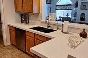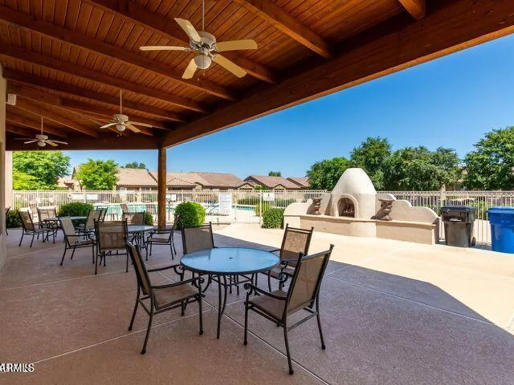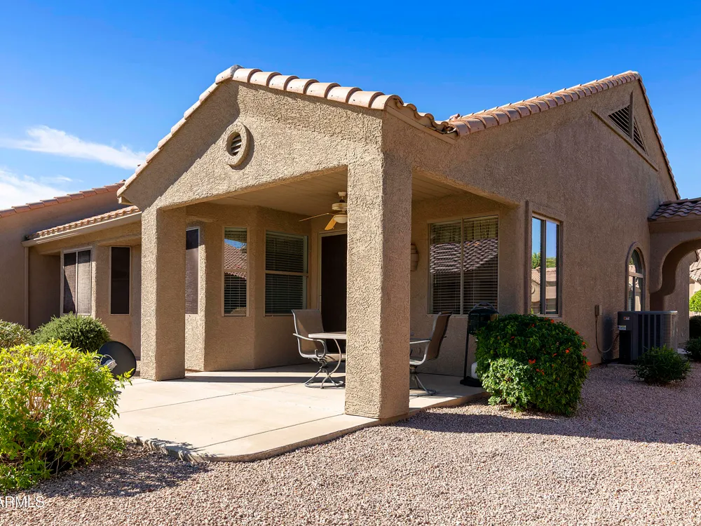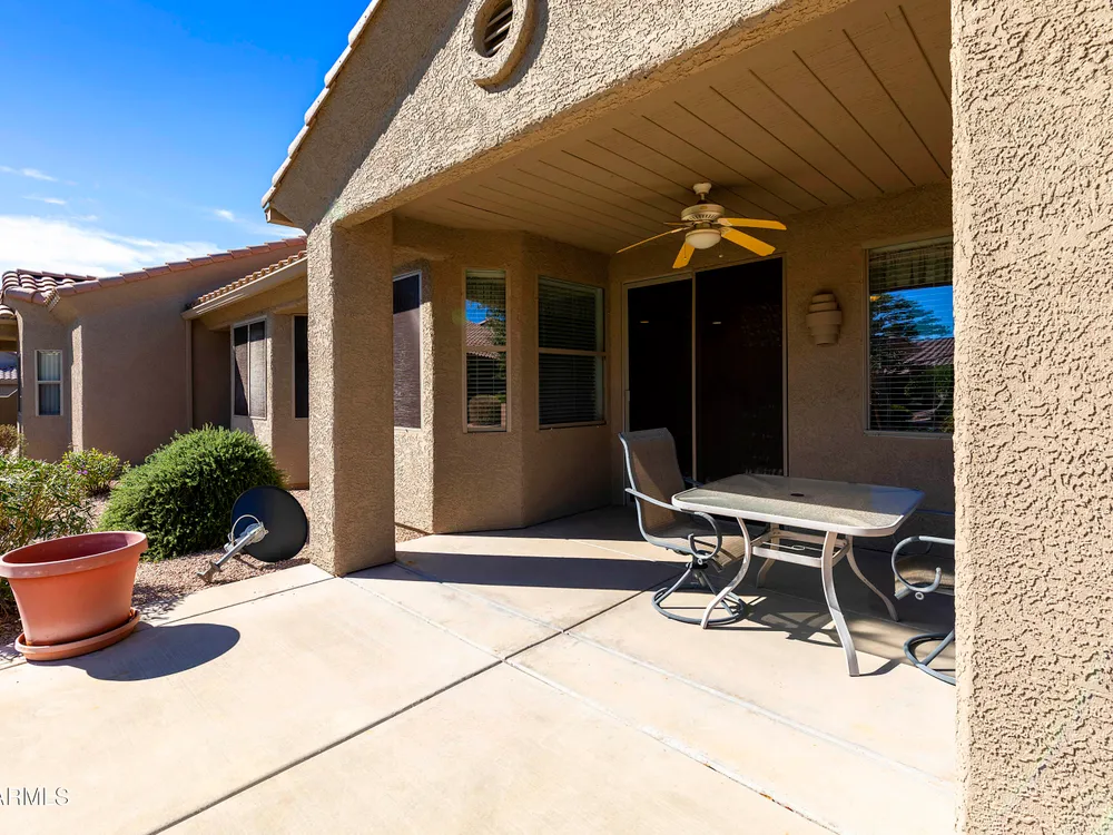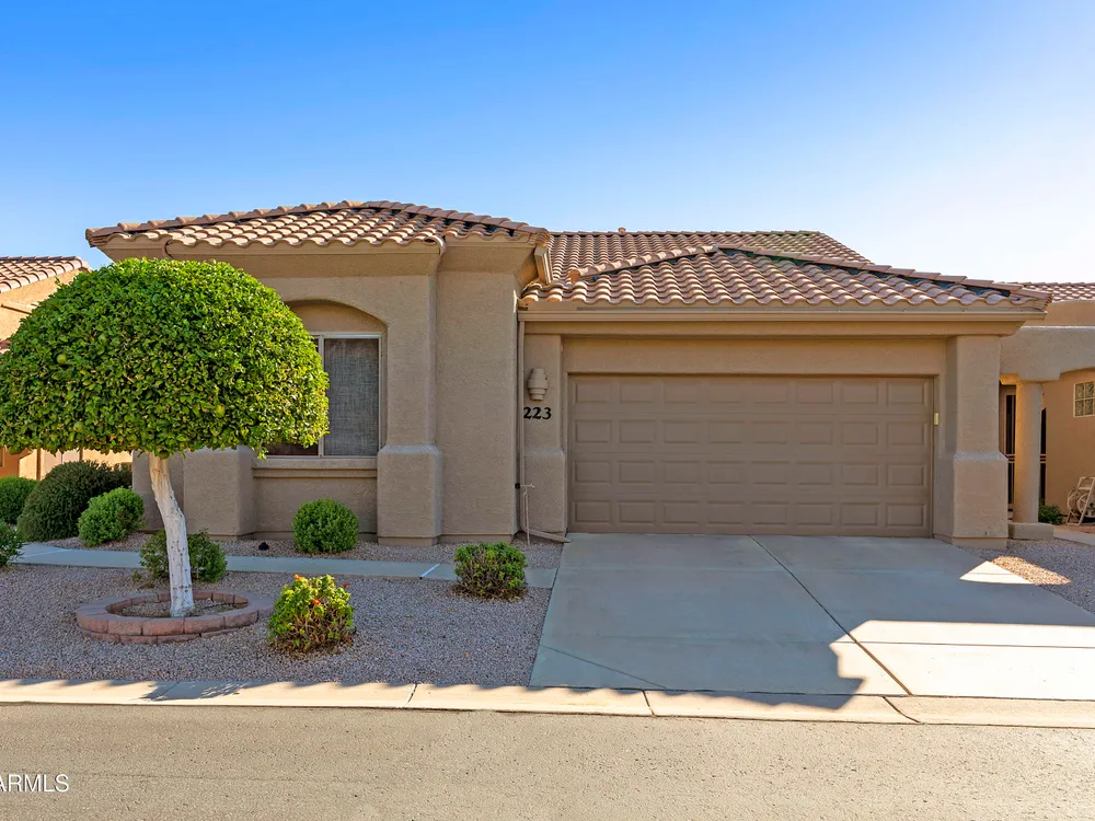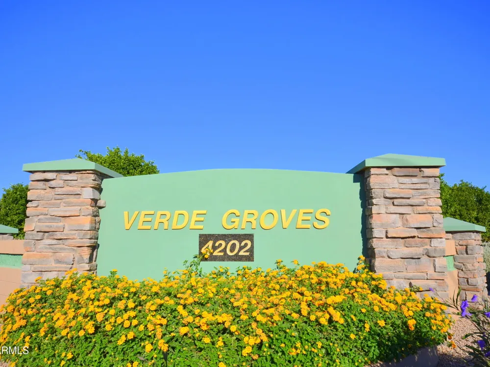 ATTACHED PATIO HOME IN THE 55+ HIDDEN GEM GATED COMMUNITY OF VERDE GROVES. Popular HERITAGE FLOOR PLAN 1540 SQ FT, BUILT 2003. East/West with rear patio backing to common area complete with Xeriscape. This 2 bdrm, 2 bath home with extended depth 2 car garage features tile flooring through entire home, coffered ceiling in great room with accents of half-moon clerestory style windows newer interior paint creating a soothing palate, built in lighted media niche to showcase your keepsakes, photos or art, dual masters both with walk in closets plus front bedroom has updated lighting. Newer SS appliances accents the quartz countertops & backsplash in the kitchen. RO, inside laundry room & washer/dryer convey, water softener replaced 2024, water heater 2020 & HVAC 2016. Lock & Leave style home c Lock & Leave style home completely TURNKEY as some furniture, furnishings, pots, pans, linens etc. available on a separate bill of sale. The HOA includes water, sewer, trash, basic cable, exterior pest/termite control, front & rear landscape, exterior painting, roof repair, roof replacement plus all common area maintenance. As part of the HOA Capital Reserve Project, the exterior was painted in 2020 & Unit #223 scheduled to have new roof underlayment installed in Fall 2025/Spring 2026. Priced to bring you home soon! Hurry as this one awaits you! Keep in mind that the HOA maintains not only your front & backyard landscape but the exterior structural maintenance of your home...talk about LOCK & LEAVE! The HOA maintains all the exterior, roof, front & rear landscaping, water, sewer, trash, termite, pest control & Cox basic cable. The Clubhouse boasts a large Kitchen, Great Room, Media Room, & Living Room. Along with Exercise Room, Billiards Room, Pool & Spa to keep you active. Verde Groves offers a resort style lifestyle with an over 10,000 sq ft Clubhouse, 2 heated pools, spa, outdoor fireplace, BBQ & covered patio. Inside the Clubhouse features billiards, cards & craft room, fitness room, library with computers, tv room, dance floor & a full kitchen. What a gathering place this is. Many scheduled activities can be found posted on the Clubhouse Bulletin Board and in the community newsletter. This gated 55+ community has a (HOA) Homeowners Association which is currently managed by the professionals at Kinney Management as well as by a Board of Directors comprised of Verde Groves homeowners. The 2025 monthly fee is $385 & currently includes such services as: * A blanket insurance policy on each home as well as the community clubhouse and its facilities * Maintenance of the exterior and roof of each home * Roof Replacement * Exterior pest control service * Exterior termite warranty * Maintenance of the common areas of the community * Landscape services of both your front and back yards * COX Basic Cable (owner pays for upgraded programing, internet and/or phone land line) * Water, Sewer, Trash Collection Verde Groves is an age restricted community & requires one permanent resident per household be age 55 or older and prohibits permanent residents less than 19 years of age. HOA does allow up to 20% of residents to be 40 years or older. Buyer has one time $1500 Capital Reserve fee payable upon Close of Escrow.