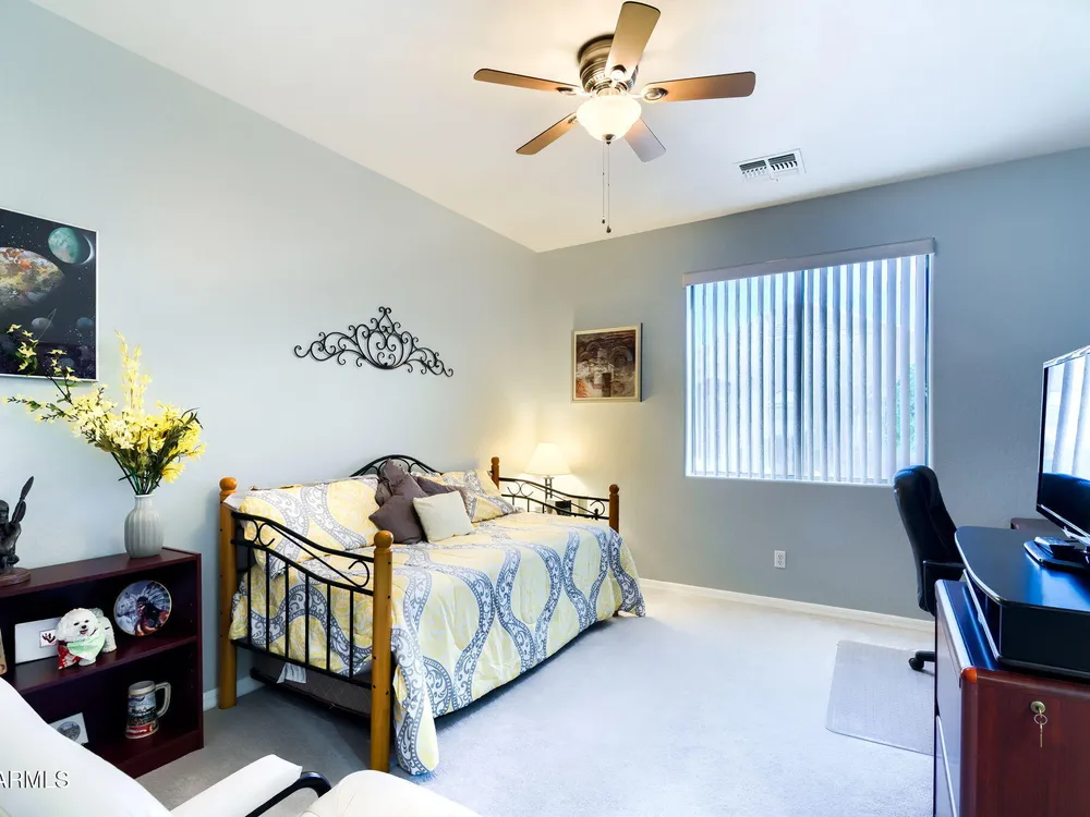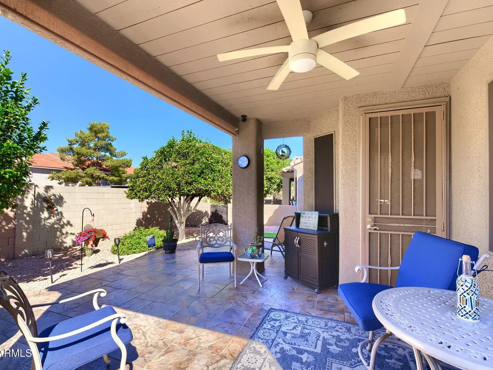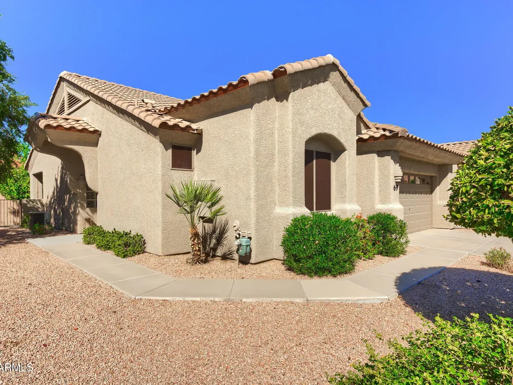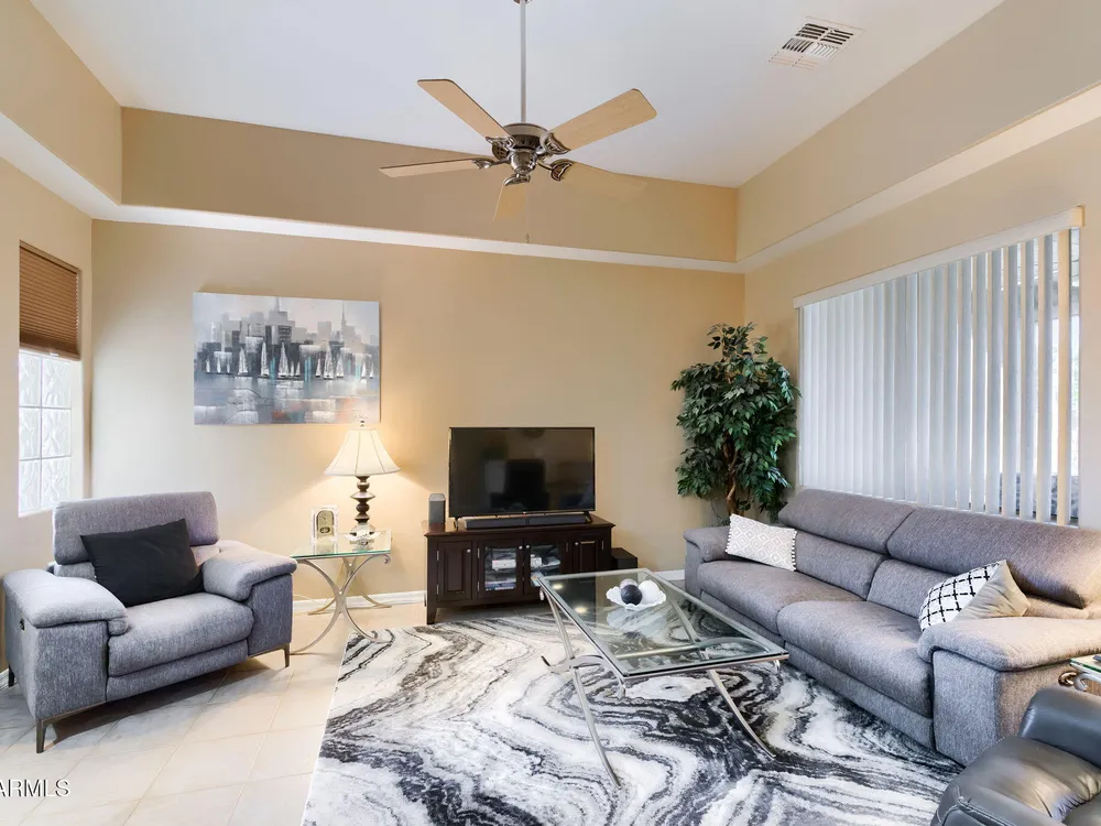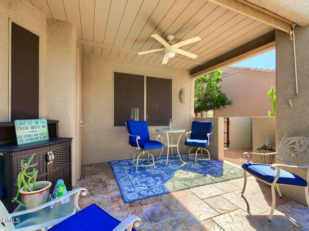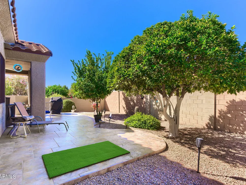 Step into the Scottsdale-adjacent 55+ gem in Verde Groves...a turnkey, maintenance-free home that's been fully refreshed and is ready to delight your clients. From the moment you cross the gated entry, you'll sense the pride of ownership and the promise of ease. The exterior was freshly painted in 2024 and a brand-new roof was installed, so structural maintenance won't be a worry. Inside, smart updates abound: new water heater and water softening system (2024), faucets and toilets are modern, and the guest bath now boasts a stylish shower door. Appliances are approximately two years old. The split-plan layout includes a generous master suite with dual sinks, a walk-in shower, and two separate closets—a luxury rarely found in this price tier. Four ceiling fans,one in nearly every room,plus thoughtful window treatments help manage the Arizona heat. Step outdoors into your private fenced patio (yes, pets are allowed), complete with travertine surface, ceiling fan, sun shades, and even orange, lemon, and grapefruit trees for fresh morning citrus. But the real headline is the lifestyle: a full-service clubhouse offering library, billiards, craft room, fitness center, heated pool & spa, and more. HOA handles all front and backyard landscaping. And with quick access to US-60, convenience meets comfort in this rare and valuable property.