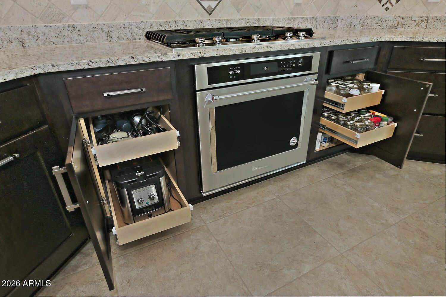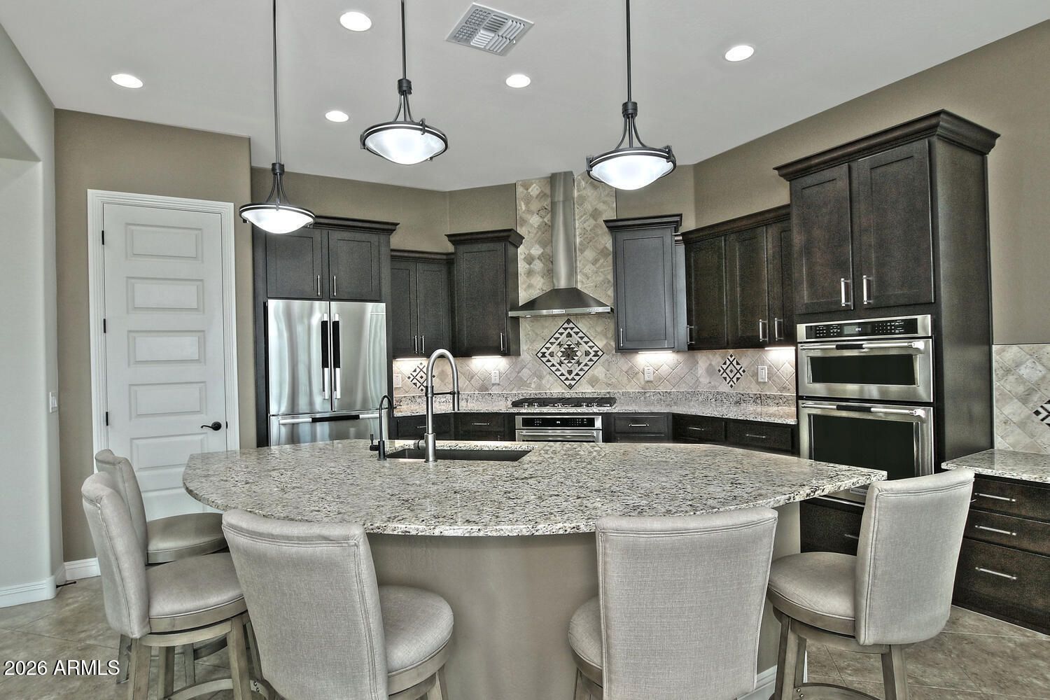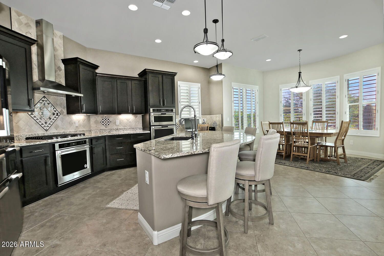 LIVING THE ARIZONA DREAM! Enjoy RESORT STYLE LIVING with this remarkable and FURNISHED ''Pursuit '' model at an incredible price. Located on a PREMIUM WASH LOT with an abundance of outdoor entertaining space that offers an extended travertine patio, gorgeous landscape, water feature, raised garden beds, and STUNNING DESERT VIEWS. Every detail has been added for your consideration starting w/the chefs kitchen cabinet layout w/Espresso cabinets, custom tile back splash, granite counter tops, multiple ovens, roll-out trays, stainless appliances, RO system and desk niche. Enjoy the entertainment/media center, surround sound, custom paint, shutters and a 2ft garage extension w/tandem golf cart space. The primary suite offers a beautiful tile walk-in shower and double vanity. A MUST SEE HOME! Take advantage of our Anthem Grille, The Poston Butte Golf Club, a learning center and all the festivities, activities and amenities a Sun City community has to offer. Remember you are buying a lifestyle that goes beyond the homes property lines.