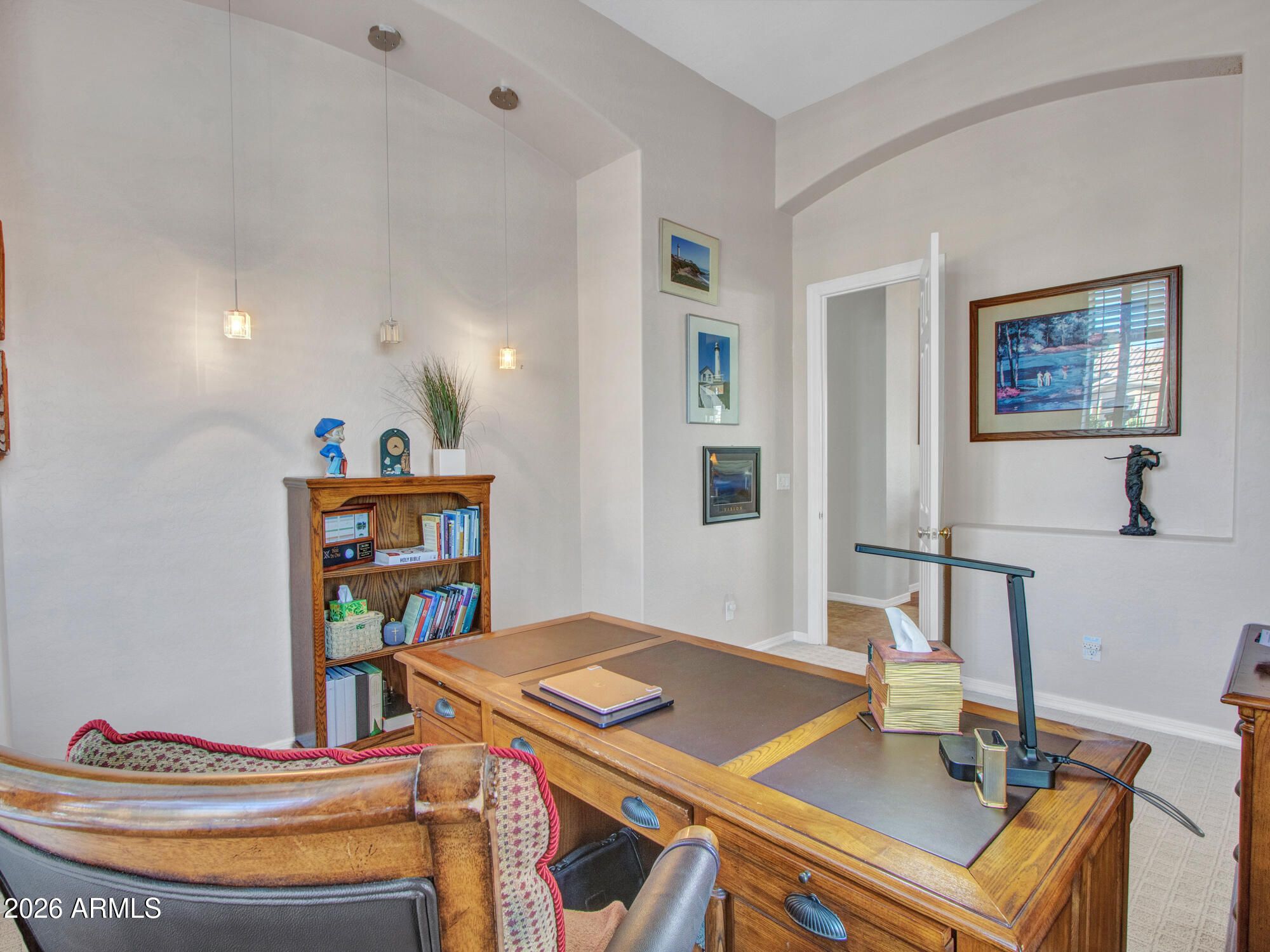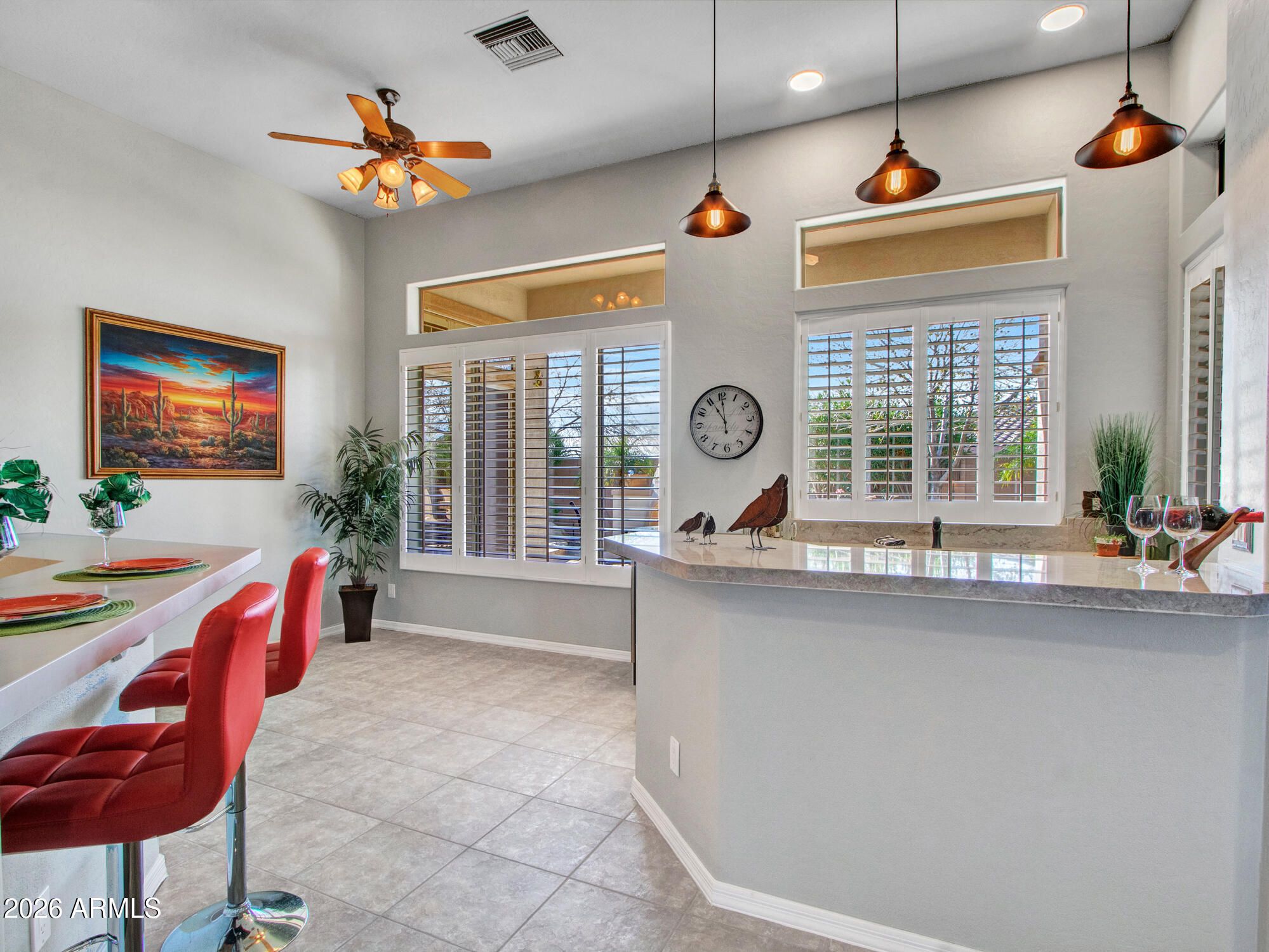 Tucked inside the guard-gated Anthem Country Club, this beautifully maintained Bennington model offers the perfect blend of comfort, style, and effortless Arizona living. With 2 bedrooms, 2.5 baths, plus an enclosed third bedroom or office, this home lives larger than expected and is ideal for both full-time and seasonal living. Inside, the spacious great room is highlighted by 12-foot ceilings, creating an open, airy feel that's perfect for entertaining or relaxing at home. The updated kitchen features painted cabinetry, quartz countertops, a built-in GE Monogram refrigerator, and a custom bar area—thoughtfully designed for both everyday living and hosting friends. Step outside to a true backyard retreat. MORE The private PebbleTec pool with waterfall, built-in gas BBQ island with refrigerator, Kiva fireplace, and elevated paver seating area make this space ideal for entertaining or unwinding under the desert sky. A gated entry courtyard with a tranquil water feature sets a welcoming tone from the moment you arrive. Recent updates provide peace of mind, including new HVAC in 2023, a 2021 water heater, half the roof replaced in 2023 (remaining section approximately 10 years old), and SunRun leased solar installed in 2023. The 3-car garage is equipped with epoxy flooring, built-in cabinets, and a mini-split system, making it functional year-round. Additional features include plantation shutters, surround sound, and outdoor speakers, all enhancing the home's comfort and livability. This is a home that has been thoughtfully updated, lovingly cared for, and perfectly positioned to enjoy everything Anthem Country Club has to offergolf, amenities, and an unmatched sense of community.