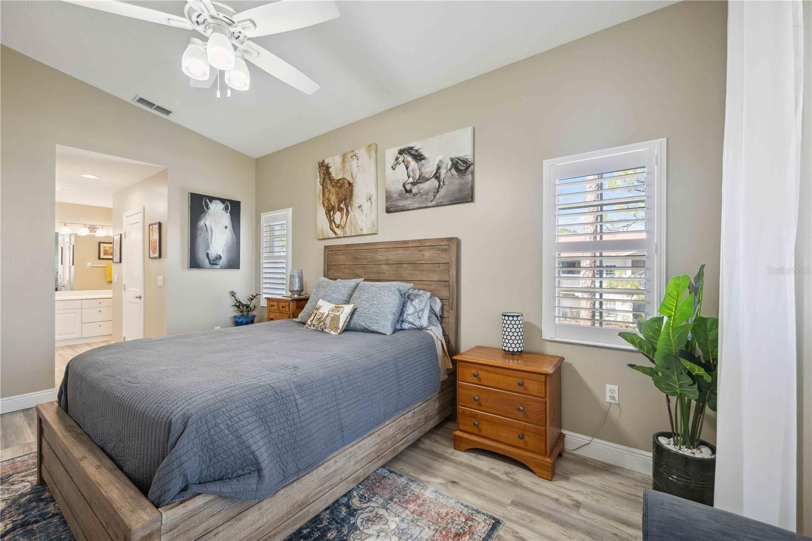 - Ceiling Fan(s), High Ceilings, Open Floorplan, Main Level Primary, Solid-Wood Cabinets, Split Bedrooms, Stone Counters, Thermostat, Vaulted Ceiling(s), Walk-In Closet(s), Window Treatments