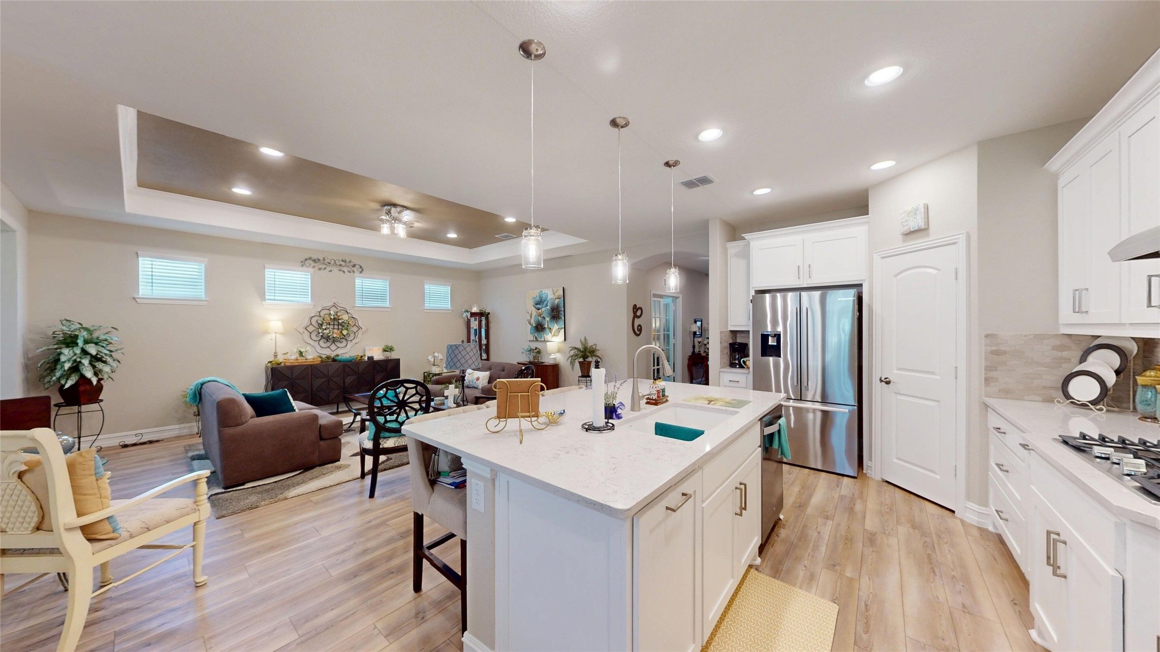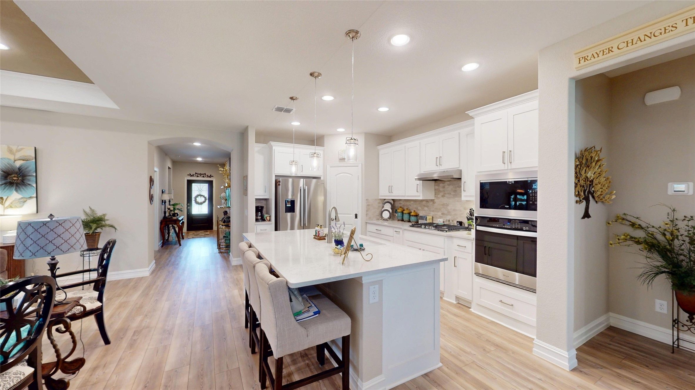 Trinity Falls 55+ by Del Webb .This is a Summerwood floor plan with the enclosed sunroom which makes the home approximately 2,270 sq ft. It features 3 bedrooms, Office, and 2 full baths. Owners put over $22k in upgrades including appliances, lighting, cabinets and countertops. The flooring has been upgraded throughout with 7in Luxury Vinyl Plank Pine. You drive up to an inviting brick & stone combination and front door with rain glass. Kitchen features stainless steel appliances, gas cooktop, quartz countertops. The floor plan is open with family room connected to sunroom that leads to the large 26ft long covered patio.The primary ensuite has dual sinks and large walk-in shower with handrails. Del Webb at Trinity Falls includes full time lifestyle director on-site, 10,000 sq ft clubhouse, events, pickleball and Bocce ball, swimming pool and spa, walking trails and fitness center all included. This is a great opportunity!