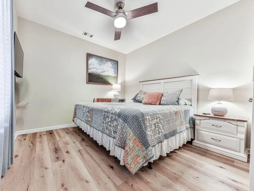 Updated showstopper home in ever popular Soleil Laurel Canyon! Home has been lovingly cultivated with a refined and well developed palate. Notice the extended pavers for extra driveway space as you spy the welcoming front porch of home situated on hard to find oversize lot. Serenity and comfort await you in this two bed, two bath home with office that includes wooden floating shelves. No carpet, but golden, knotty pine LVP throughout, beckon you to explore past the ample secondary bed and bath. Open, fire side living room has a stylish and functional butlers pantry with under mount lighting, glass doors to view whimsical treasures, wine fridge and storage! Clean, fresh kitchen with white cabinets and stainless appliances. Updated glass backsplash and granite countertops. Kitchen also includes convenient eat in area for a quick snack or for more formal dining, area off living room has plenty of space. Spacious primary suite with trey ceiling leads to bath with double vanity with seating area, separate tub and shower with bench and convenient cut out for toiletries! And the best for last...Heated and cooled sunroom with wall of windows overlooking the lush fenced backyard! Paver patio is perfect for entertaining and BBQ's. Tiered backyard affords privacy we are all looking for! Soleil Laurel Canyon is the premier 55+ community with so much to offer from cooking clubs, crafts- including 2 kilns, billiards, indoor and outdoor swimming pools plus indoor sauna, full workout facility, gardening club with greenhouse and your very own plot to garden, tennis, pickleball, 2 full time activity directors and so much more!