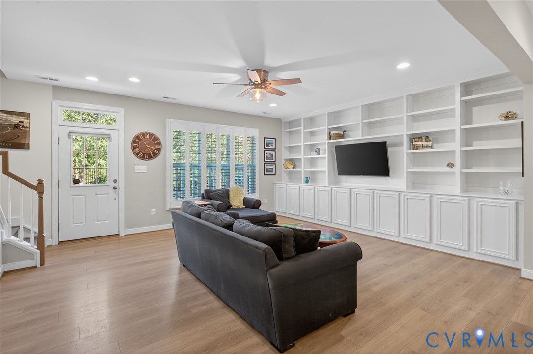 Welcome to New Town in the heart of Williamsburg, Virginia. Just what you have been looking for, a 3-bedroom 3-bath townhouse with a 2-car garage. Beautiful open floor plan with kitchen open to the family room and dining area. Kitchen island for all your entertaining. Custom built plantation shutters and beautiful custom built-in bookcases and cabinetry in the family area. Bedroom and Full bath on the first floor. There are 2 bedrooms on the second floor each with a full bath on suite. Large laundry room. New carpet in upstairs hallway, bedrooms, and closets. Large closets and plenty of storage. Programmable thermostat. Front entrance and family room overlook greenspace. Shopping, recreation, and entertainment are convenient by sidewalks throughout New Town. This well-maintained home could be your next move.