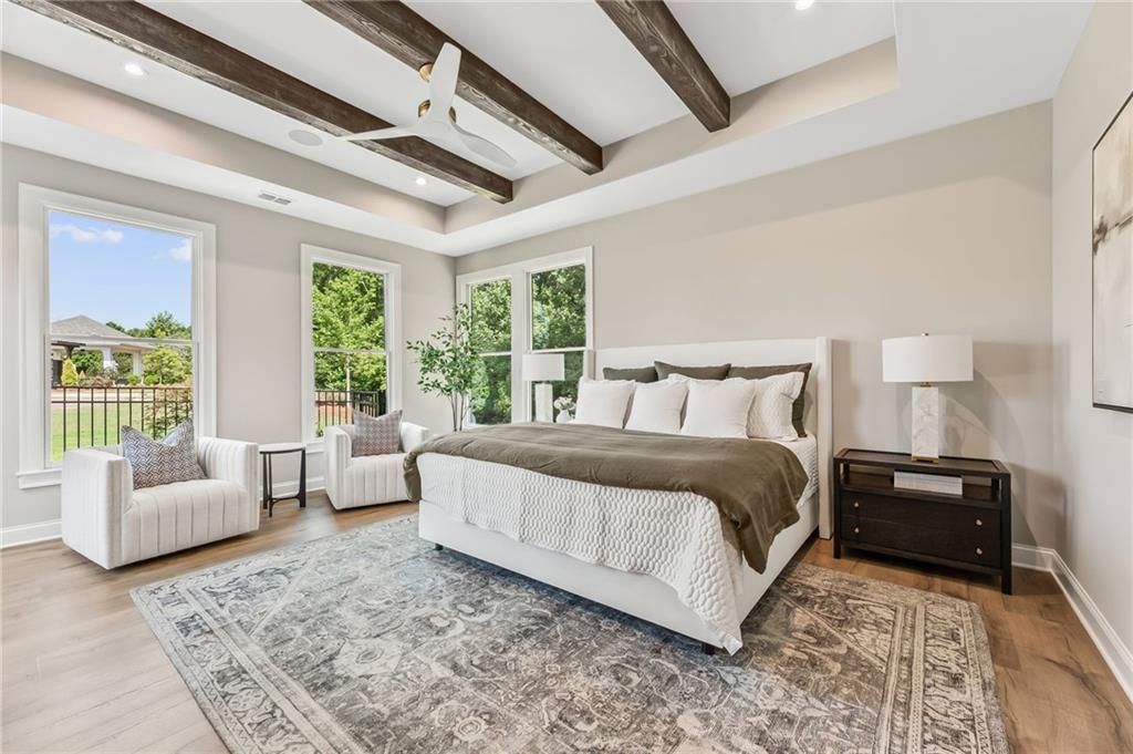 - Beamed Ceilings, Crown Molding, Double Vanity, Entrance Foyer, High Ceilings, His and Hers Closets, Recessed Lighting, Tray Ceiling(s), Vaulted Ceiling(s), Walk-In Closet(s), Dual Pane Window(s), Bathroom, Bedroom, Den, Kitchen, Laundry Facility, Living Room, Primary Bathroom, Primary Bedroom