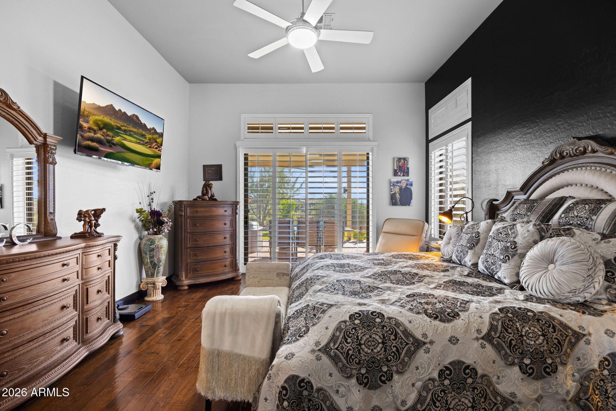 UPDATED 4 Bedroom, 3 Bath Home w/ Beautiful Views on 8th Fairway of Persimmon Golf Course in Anthem Country Club! NO homes across street & open space on 1 side affords great privacy. Upgraded kitchen w/ leathered & polished granite expanded island & bar. New appliances including electric cooktop & Thor ice maker. Primary bedroom suite features walkout to extended covered patio & eastern views of Daisy Mountain and golf course. All new primary bath features floor-to-ceiling tile, glass wall walk-in shower, double sinks, striking black & white soaking tub & walk-in closet the size of a bedroom w/ shelving! Back yard has extensive sitting area, pergola, synthetic turf & ready for an outdoor kitchen. 3-Car Garage features mini split in two car & separate single car garage. Hardwood floors.