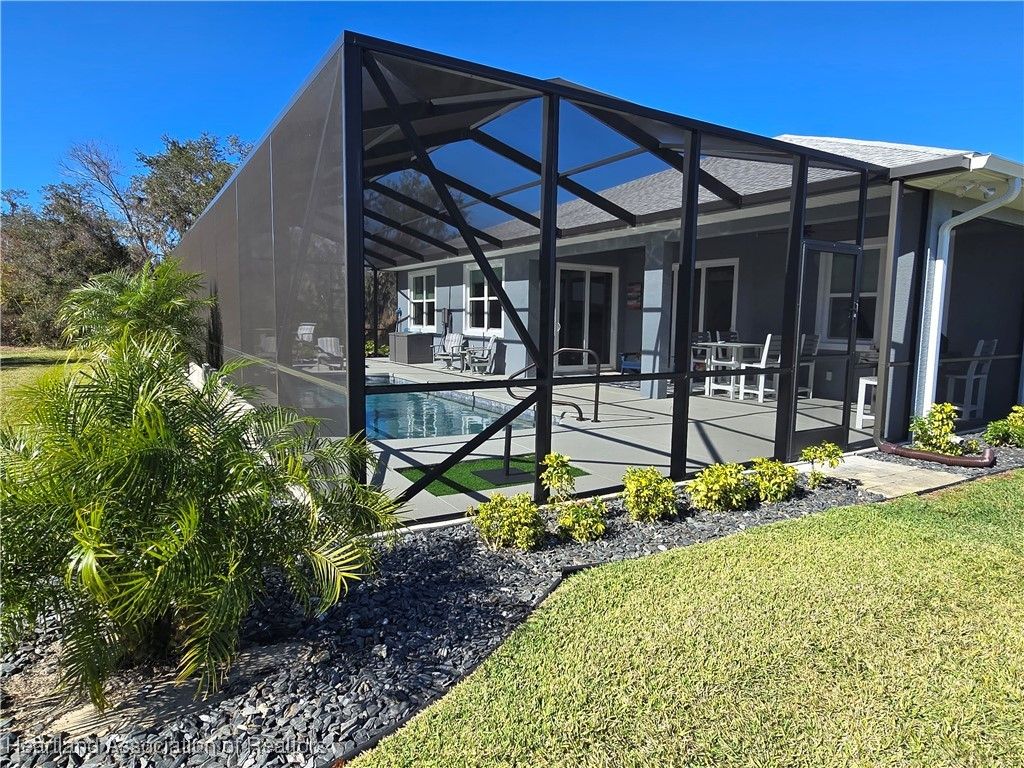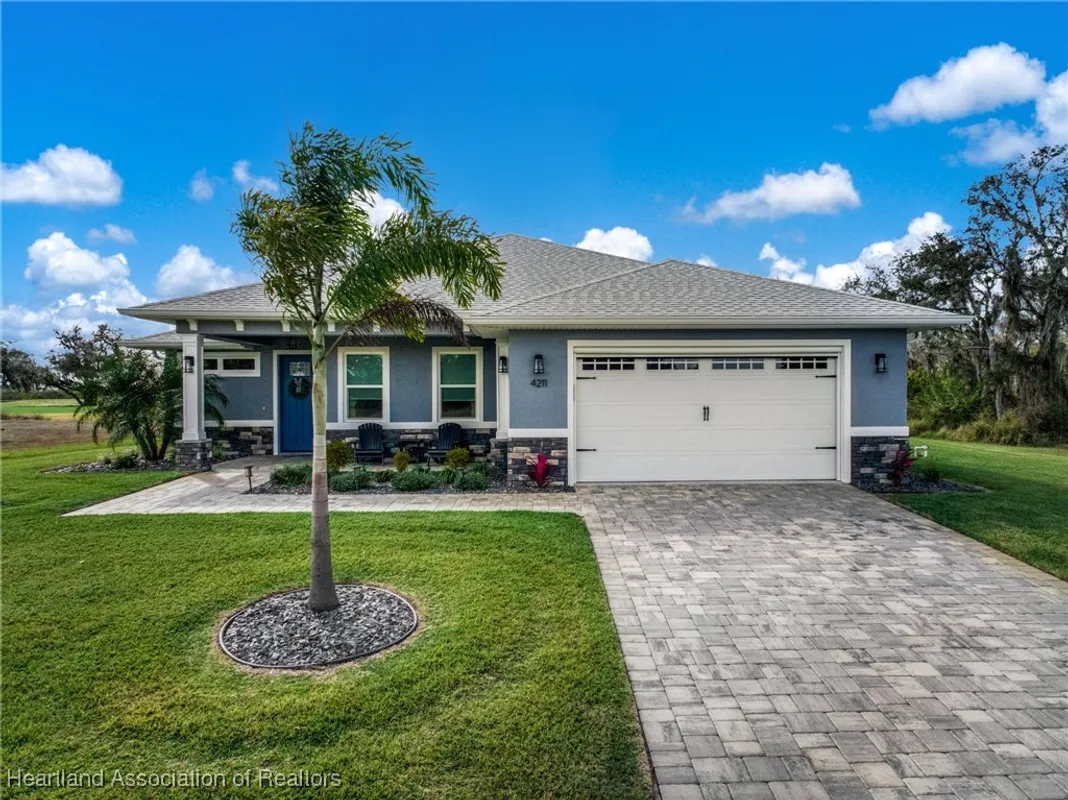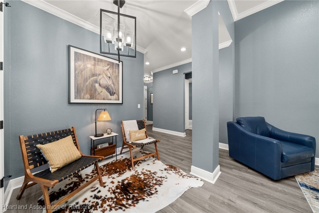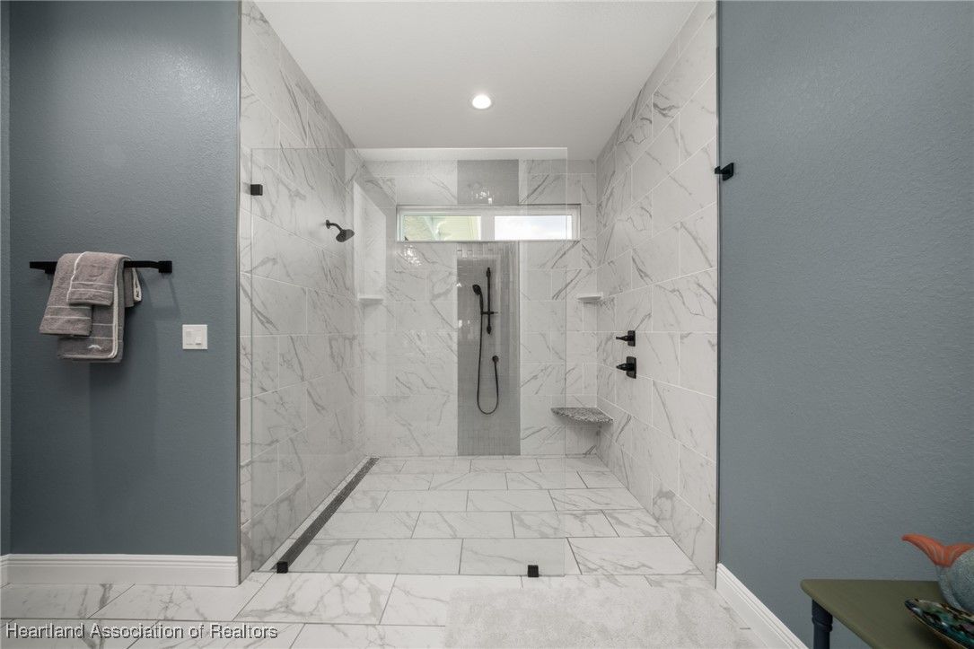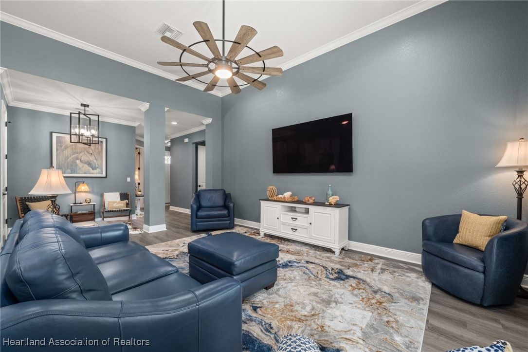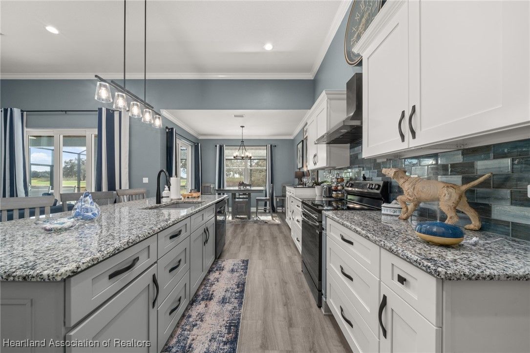 Stunning, absolutely gorgeous, POOL home on the 11th hole in Highlands Ridge! The "wow" factor is throughout. Have peace of mind with the WHOLE HOUSE GENERATOR and HURRICANE IMPACT WINDOWS. An inviting front porch welcomes you into this beautiful 3 bed, 2 bath home featuring just over 2,000 sq ft of living area, 2 master suites, lovely neutral colors, gorgeous wood-like vinyl plank flooring, stately 8' doors, wide baseboards and crown molding throughout that add a sense of luxury and comfort. Bright & open Great Room highlighted by 11' high ceiling, recessed lighting and reading nook. At the heart of the home is the gourmet kitchen showcasing an amazing center island/breakfast bar perfect for casual meals or entertaining, high-end appliances, wi-fi enabled stove with air fryer, granite countertops, coffee bar area, tile backsplash and roomy pantry. Enjoy the pool and golf course views from the cozy breakfast nook. Unwind in either of the 2 master suites each with sophisticated trey ceiling with ambiance lighting on dimmers. Barn doors lead to the luxurious ensuites adorned with marble-like tile, a wide granite vanity with under-cabinet lighting, frameless anti-Fog LED lighted vanity mirror, linen closet and shower with glass doors. Through double doors, you'll find the 3rd bedroom currently being used as an office/den with a large walk-in closet. There's no shortage of storage space, you'll love all the big, deep closets. The favorite hang out spot will surely be the backyard oasis complete with a beautiful saltwater, heated pool and lots of space to entertain & grill poolside while overlooking the golf course. Wide, deep 2 car garage with split unit AC, epoxy floor and skeeter beater. Elegant paver driveway, pristine landscaping, stone accents and loads of modern details throughout. This friendly, 55+ community is great place where you can go for a round of golf, grab a bite to eat at the Irish Pub, work out in the gym, participate in various clubs, and play on the tennis courts, shuffleboard courts or pickleball courts. The common facility fee covers lawn maintenance, use of amenities and subdivision maintenance. In addition to common facility fee, there's a $25/year HOA fee that covers resident voting as a member of association. Rentals allowed, with association approval, and two pets allowed.