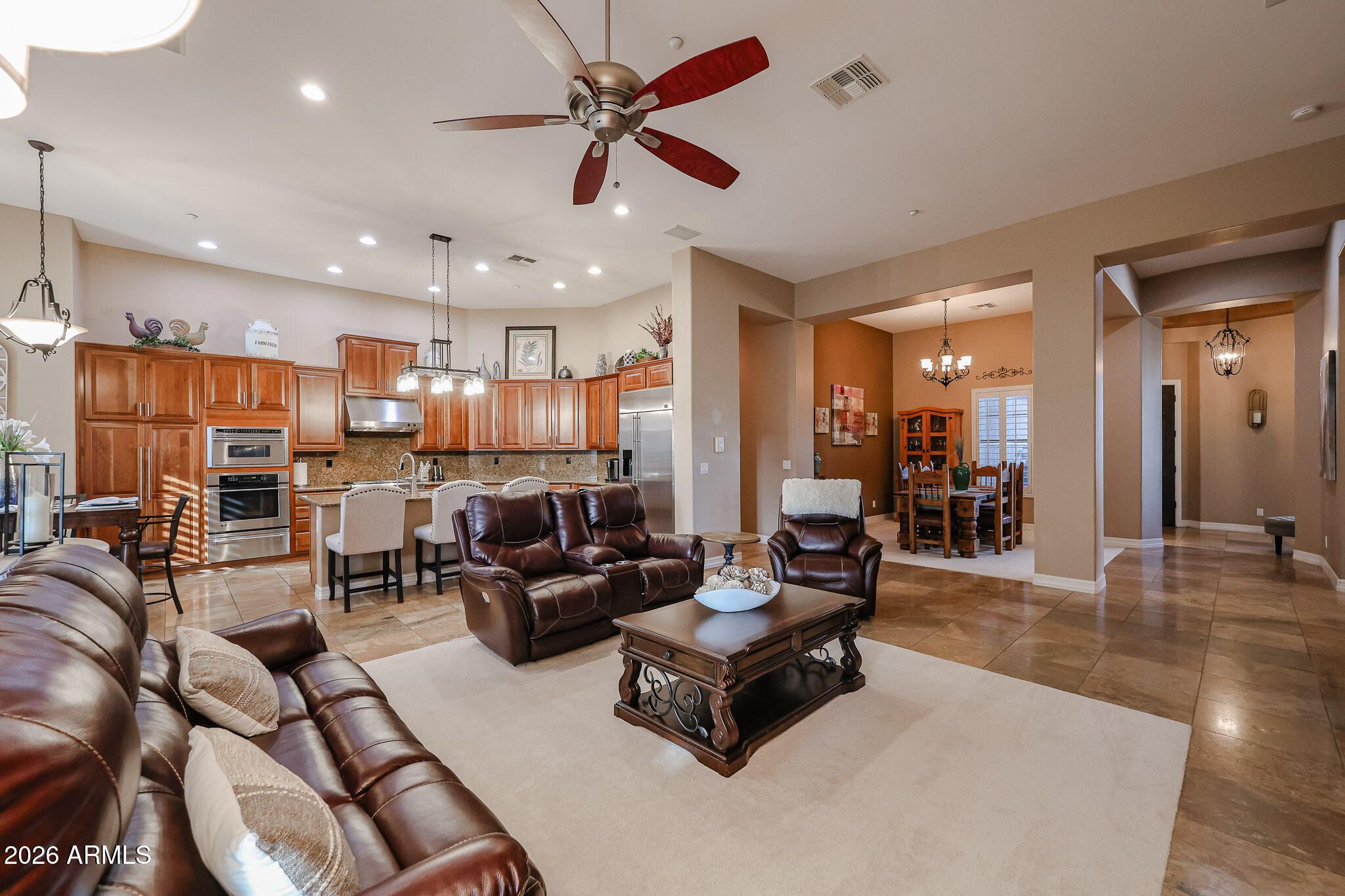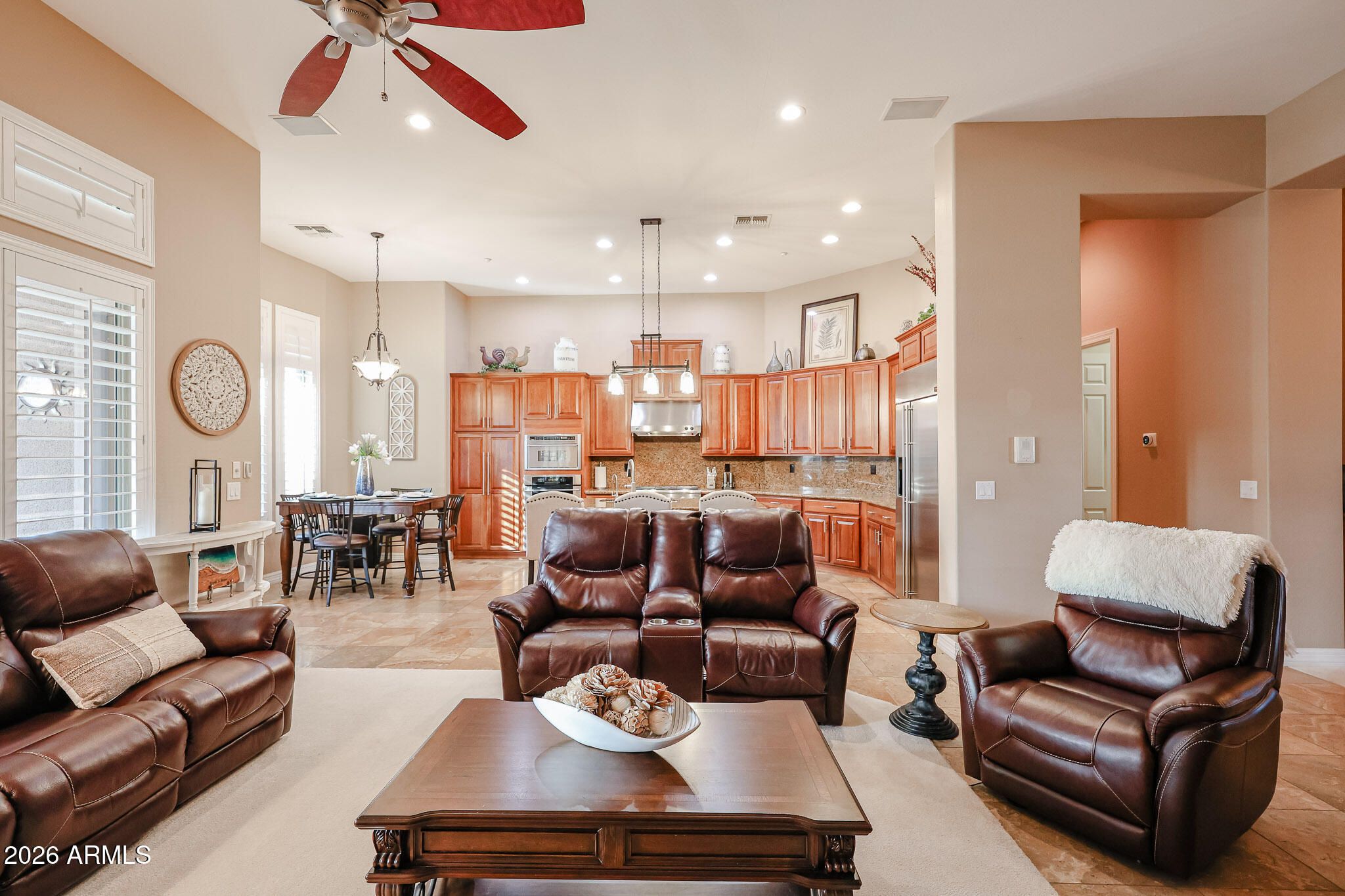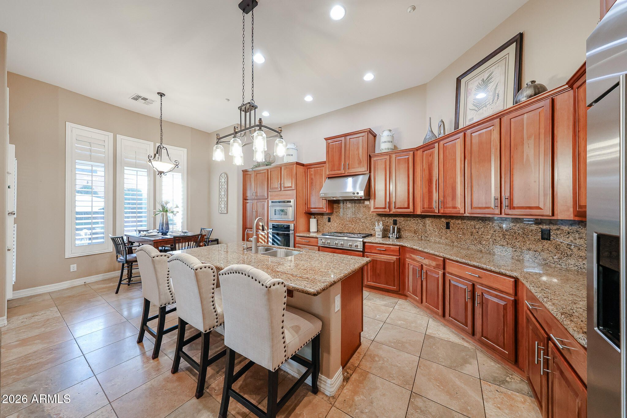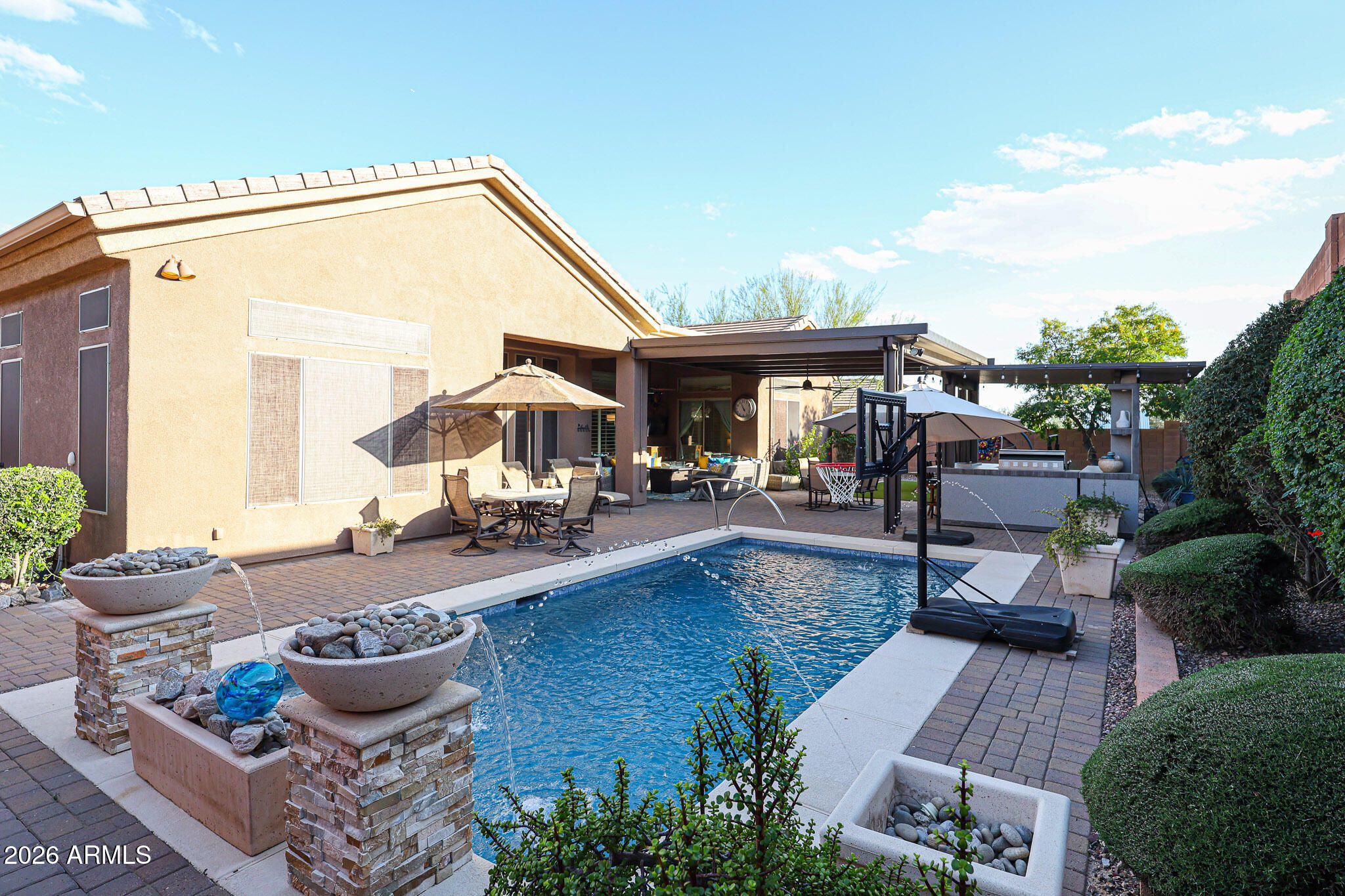 Welcome to 42114 N Alistair Way in Anthem Country Club! A popular Monterey model with resort-style outdoor living. The backyard features a sparkling pool, pavers, artificial turf and an extended pergola off the back patio with a built-in BBQ, bar, fire pit and TV-perfect for entertaining. Inside are 18'' tile floors, cherry cabinets, slab granite counters and backsplash, and GE Monogram appliances including a built-in fridge, 6-burner Chef Series gas cooktop, and warming drawer. Additional upgrades include plantation shutters, R/O, water softener, and hot water re-circulation. Flexible layout with 3 bedrooms, 2 ensuite guest rooms, a formal living/theater room with an office/optional 4th bedroom, and an extended primary suite. Extended epoxy garage with custom cabinets and overhead storage