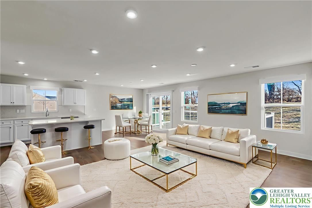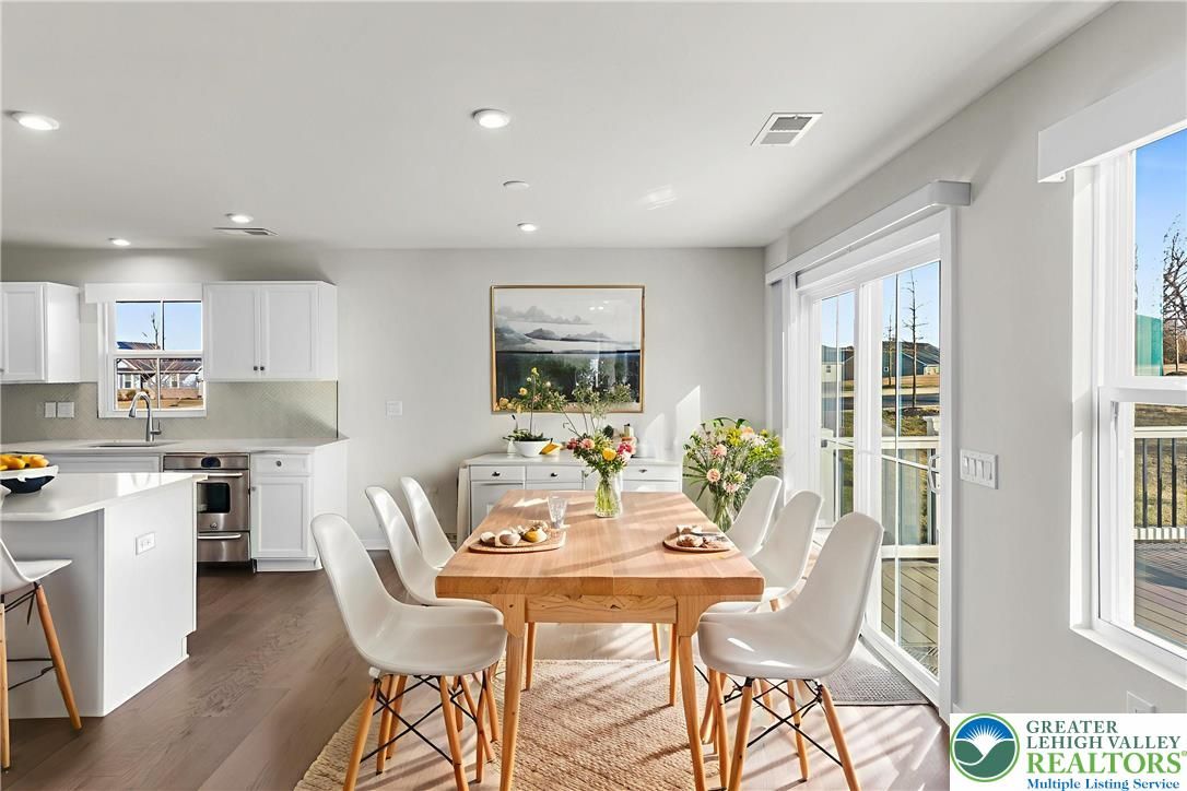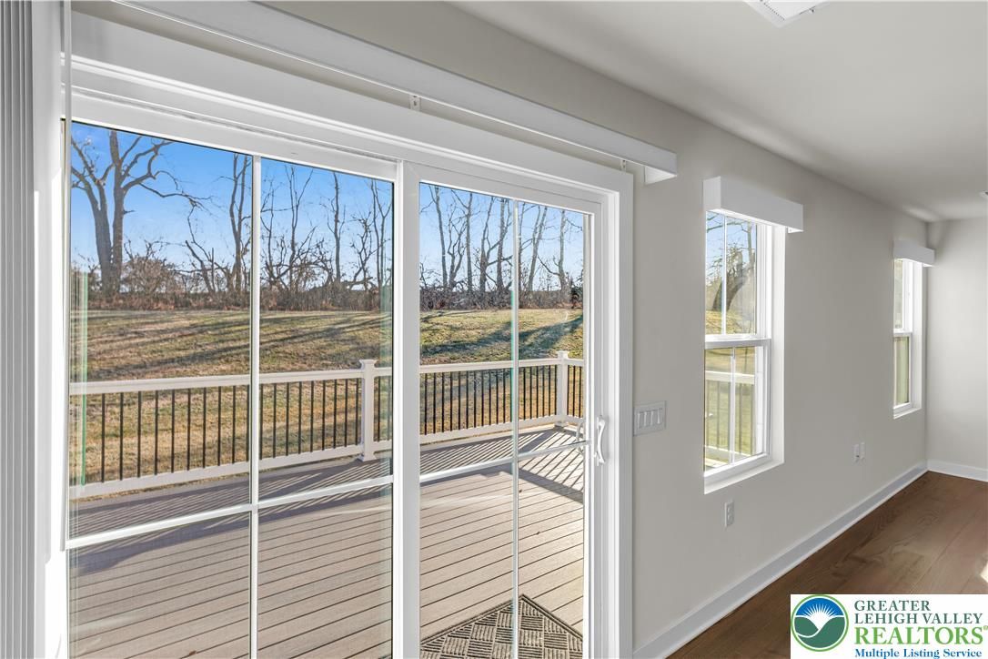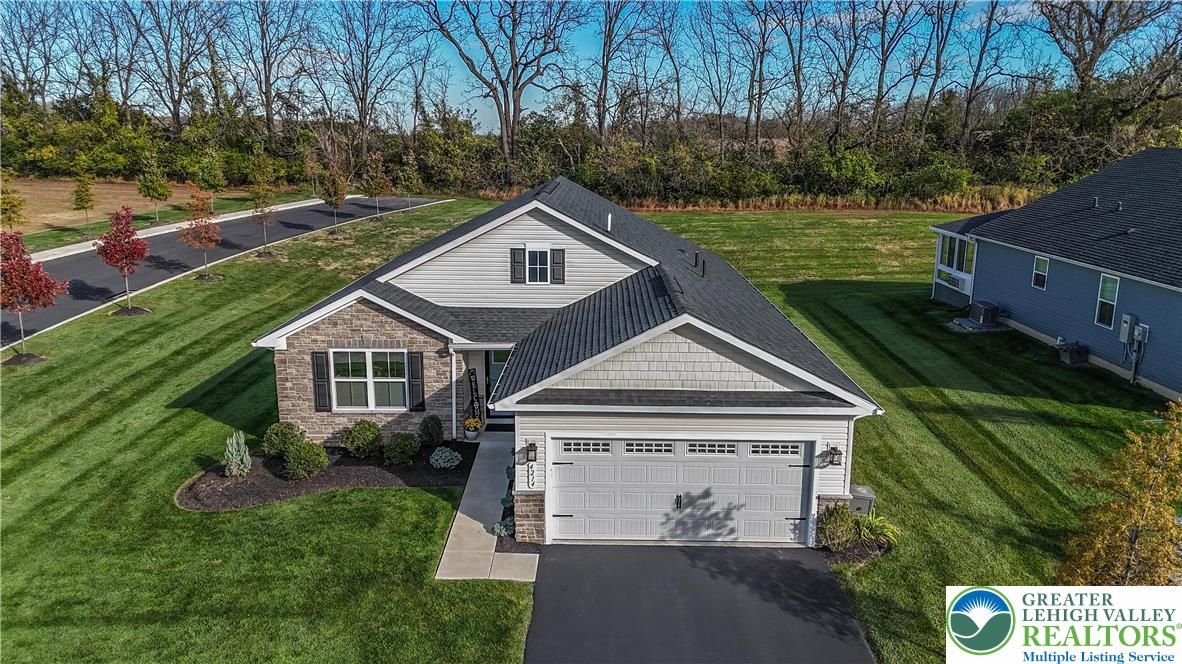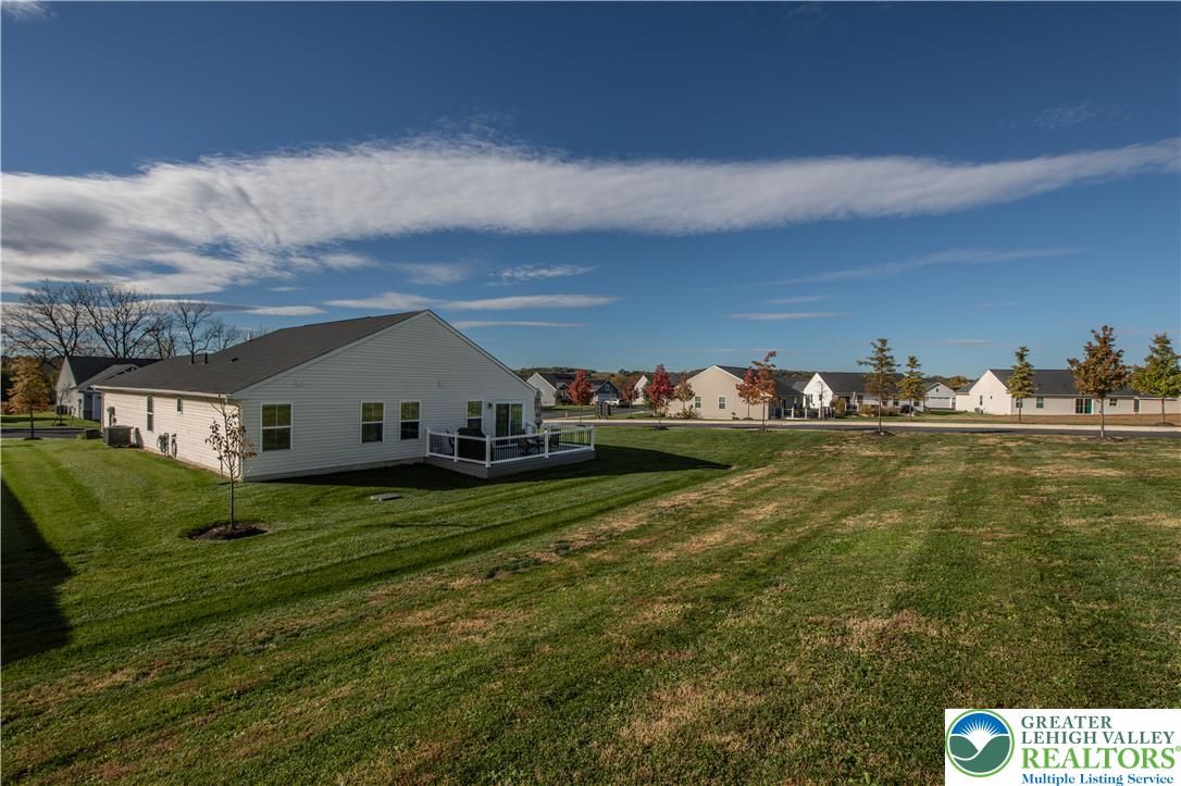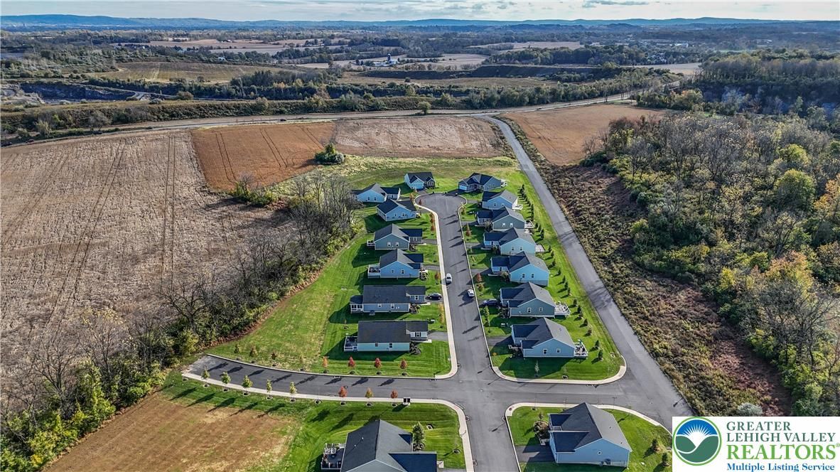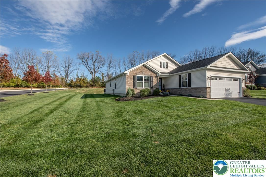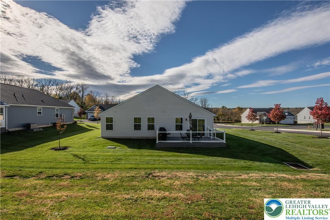 Welcome to the Dominica Model, the largest floor plan in the Taylor Villas 55+ community, perfectly positioned on a premium lot backing to the Ironton Rail Trail. Offering approximately 1,720 square feet of elegant single-floor living, this beautifully upgraded home delivers the ideal balance of space, style, and low-maintenance comfort. The bright, open layout is filled with natural light & thoughtfully designed for everyday living and entertaining. The gourmet kitchen is a standout, featuring quartz countertops, a glass tile backsplash, Bosch stainless steel appliances (all included), a spacious center island, pantry, & abundant cabinetry with pull-out drawers, providing exceptional storage. The kitchen flows seamlessly into the sun-filled Great Room. Engineered hardwood flooring runs throughout, complemented by automatic window shades on every window. The flexible layout includes three bedrooms, a dedicated home office with double glass doors, a full bath, & a convenient laundry room with tile flooring in the laundry area and all full baths. The oversized primary suite offers a spacious walk-in closet & a beautifully appointed en-suite bath. Step outside to the low-maintenance Trex deck & enjoy a serene backyard backing to open space, perfect for peaceful mornings or evening strolls. HOA includes lawn care, snow removal, road maintenance, & trash/recycling—making everyday living effortless. A rare opportunity offering elegant living, ample storage, and a beautiful setting.