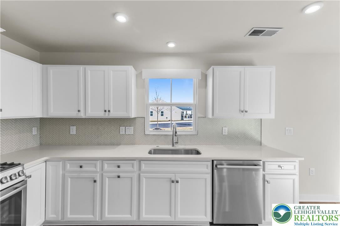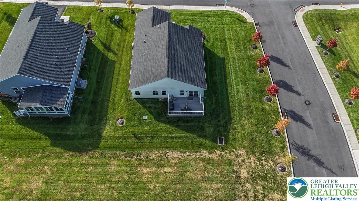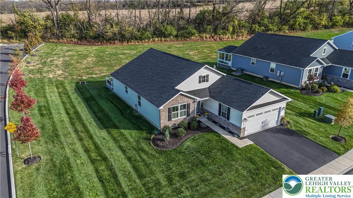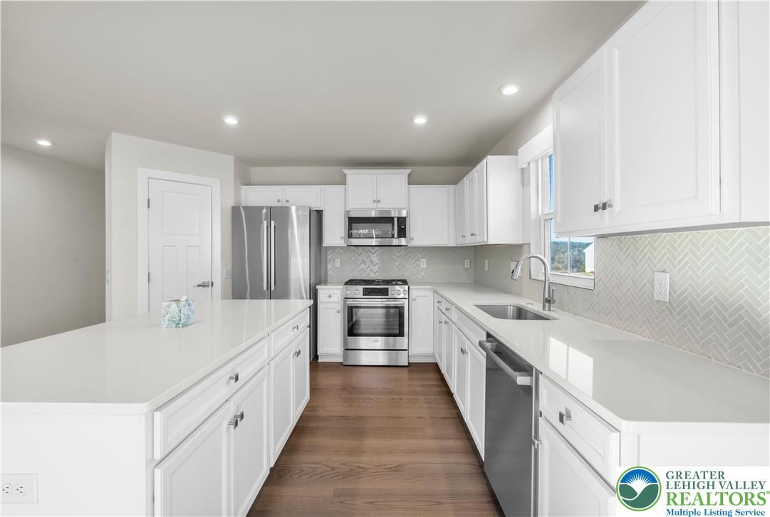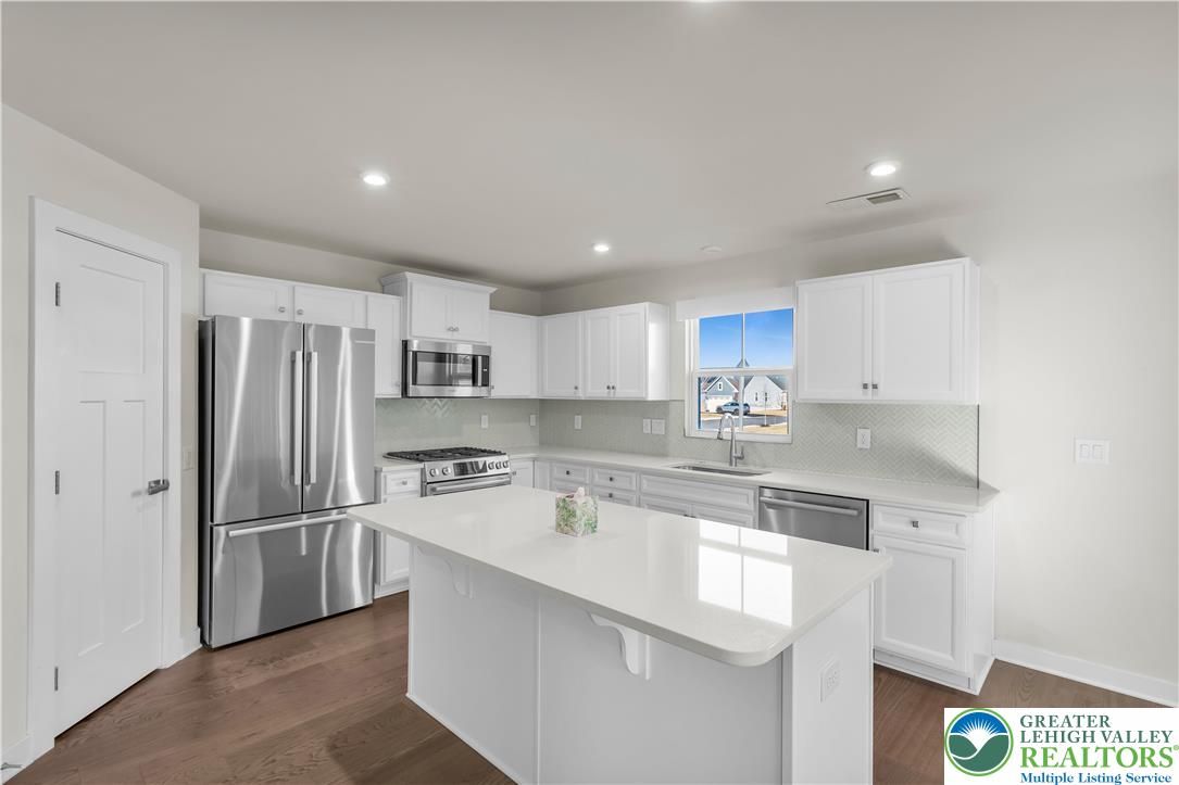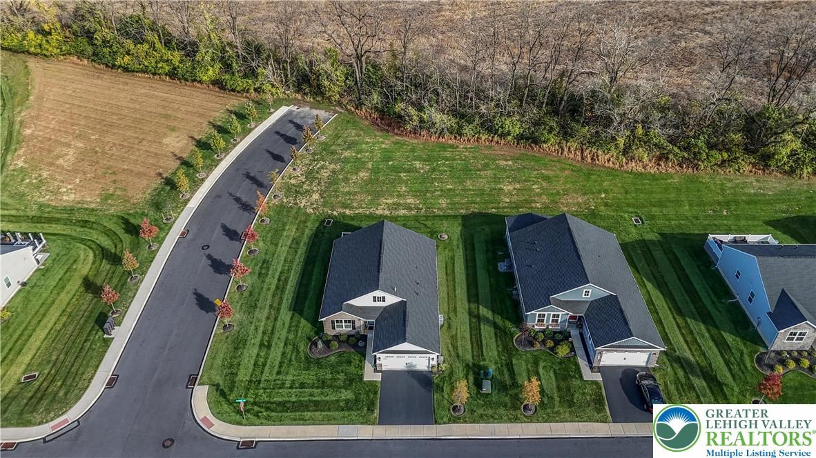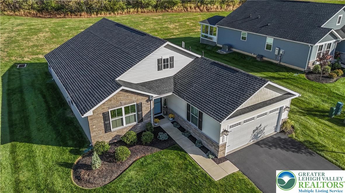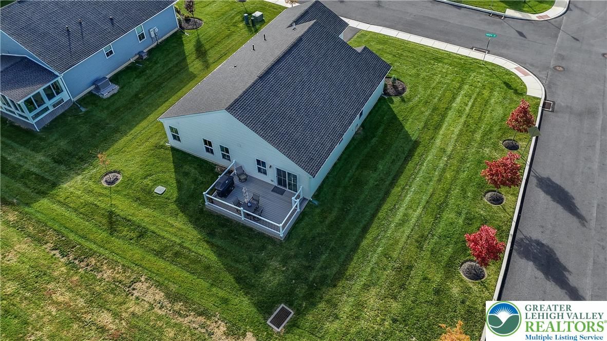 Welcome to the Dominica Model, the largest floor plan in the Taylor Villas 55+ community, perfectly positioned on a premium lot backing to the Ironton Rail Trail. Offering approximately 1,720 square feet of elegant single-floor living, this beautifully upgraded home delivers the ideal balance of space, style, and low-maintenance comfort. The bright, open layout is filled with natural light & thoughtfully designed for everyday living and entertaining. The gourmet kitchen is a standout, featuring quartz countertops, a glass tile backsplash, Bosch stainless steel appliances (all included), a spacious center island, pantry, & abundant cabinetry with pull-out drawers, providing exceptional storage. The kitchen flows seamlessly into the sun-filled Great Room. Engineered hardwood flooring runs throughout, complemented by automatic window shades on every window. The flexible layout includes three bedrooms, a dedicated home office with double glass doors, a full bath, & a convenient laundry room with tile flooring in the laundry area and all full baths. The oversized primary suite offers a spacious walk-in closet & a beautifully appointed en-suite bath. Step outside to the low-maintenance Trex deck & enjoy a serene backyard backing to open space, perfect for peaceful mornings or evening strolls. HOA includes lawn care, snow removal, road maintenance, & trash/recycling—making everyday living effortless. A rare opportunity offering elegant living, ample storage, and a beautiful setting.