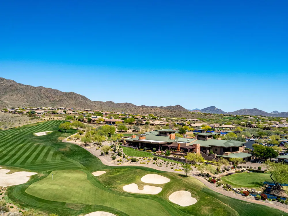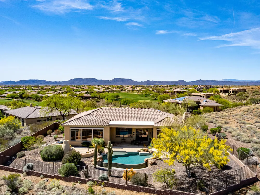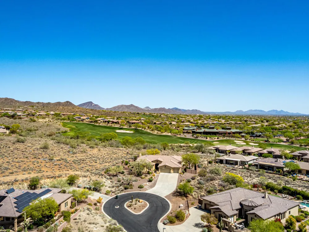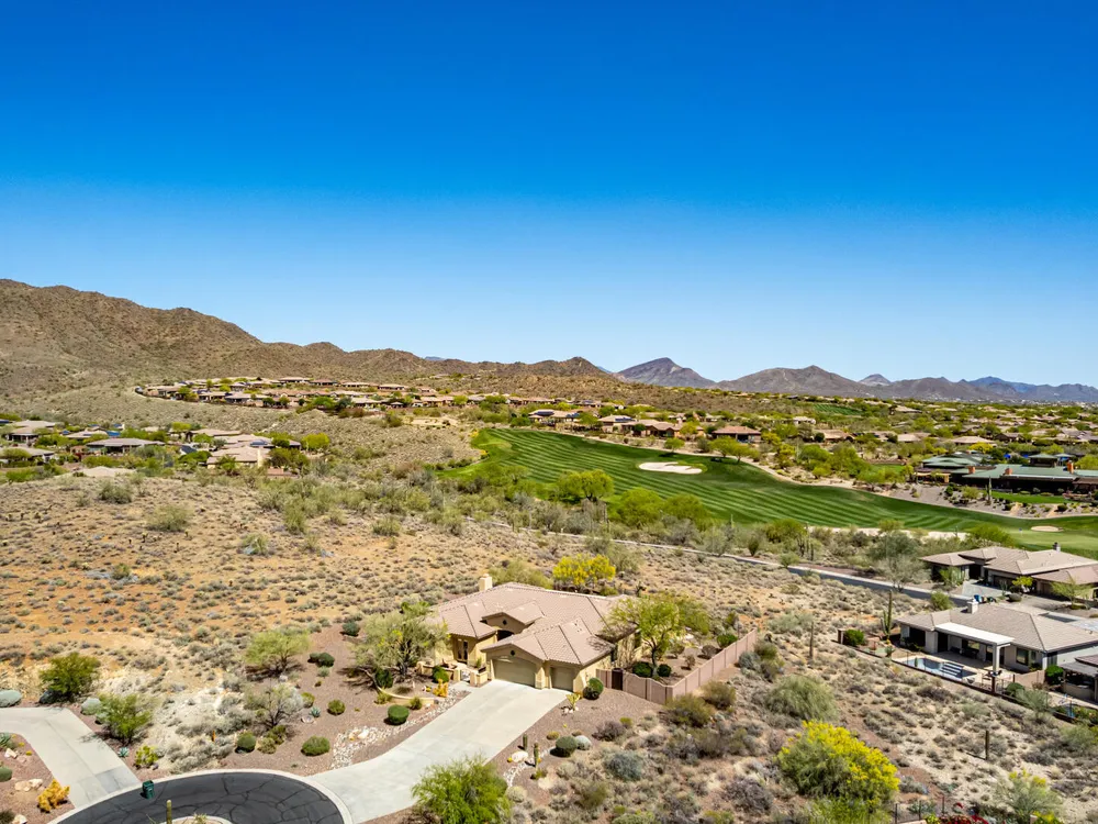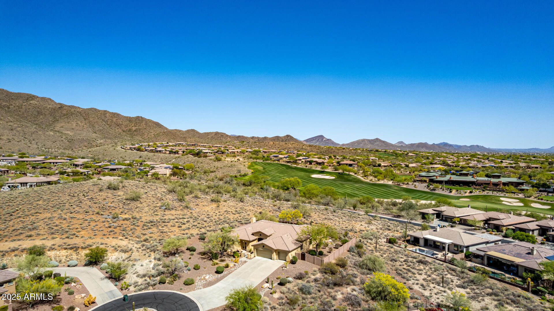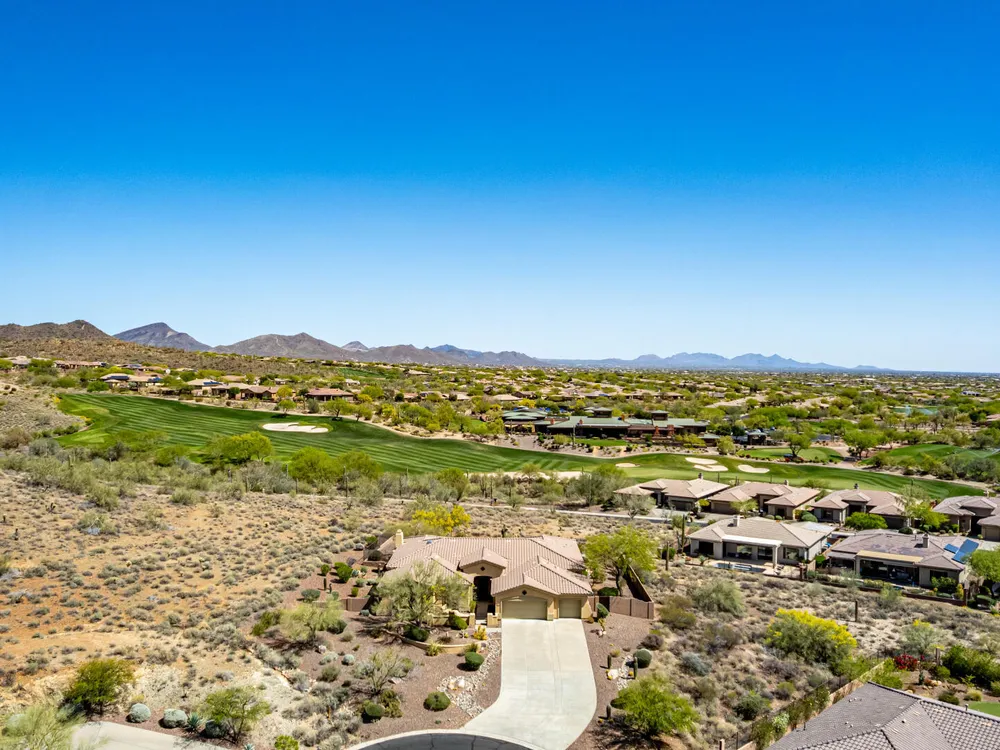 Rare Opportunity: Premier Homesite in Anthem Country Club with Unrivaled Views! Discover the ultimate in Anthem Country Club living at 42145 N Fairway Court. This exceptional property, owned by the original discerning buyer who had their pick of all custom homesites, occupies the coveted top-of-the-hill position at the end of a peaceful cul-de-sac within the secure guard-gated community of Anthem Country Club. Prepare to be captivated by the sweeping views encompassing the 8th and 18th golf holes and the elegant clubhouse in the distance. Enjoy unobstructed vistas in every direction, as this unique lot offers the ultimate in privacy with no neighboring homes on either side. Situated on a generous lot just under an acre, the custom-designed home features a stunning infinity-edge pool and meticulously crafted interiors. Highlights include rich mesquite wood flooring, custom cabinetry, convenient automatic window coverings and shades, and the luxury of en suite bathrooms for each bedroom. This is more than a home; it's a lifestyle.