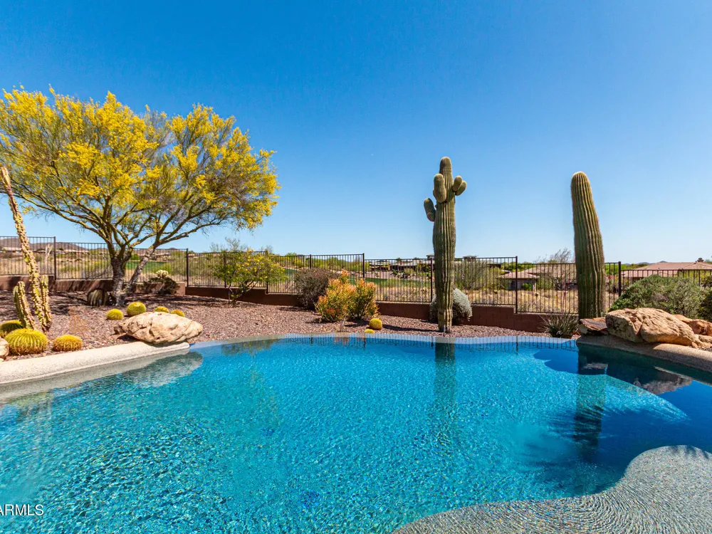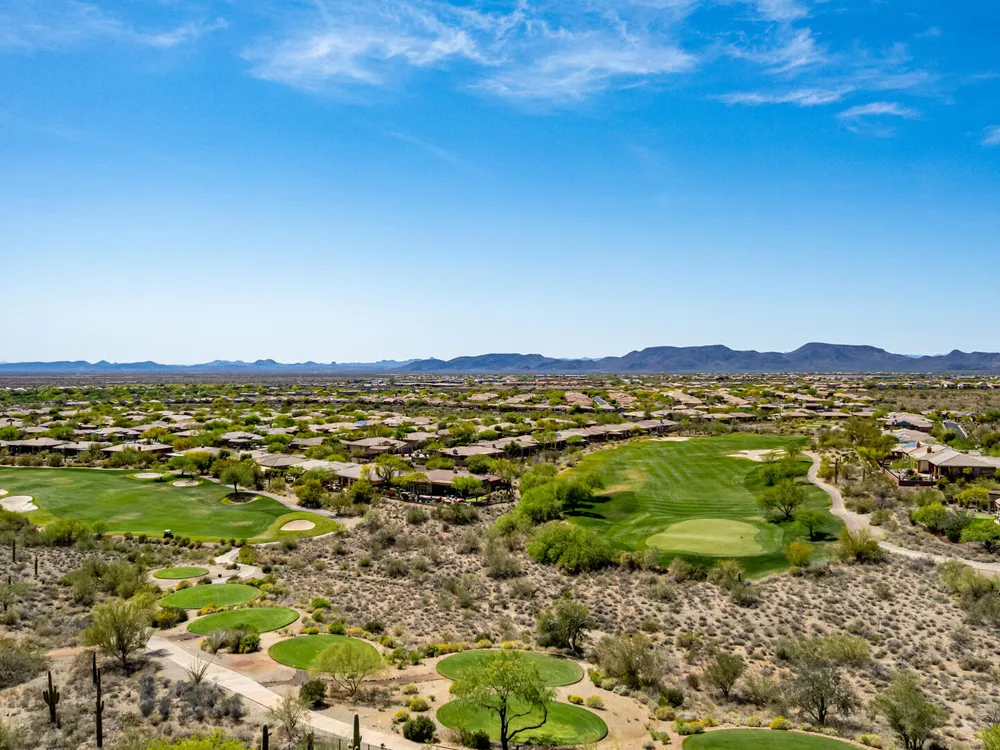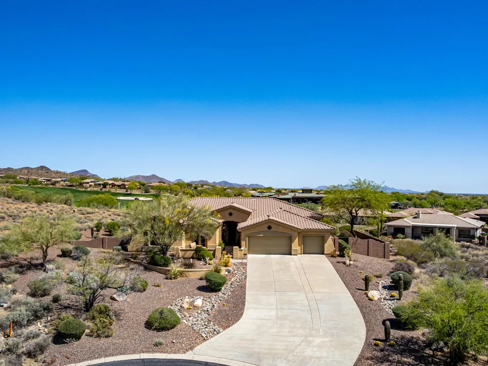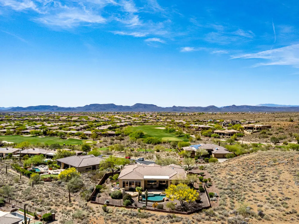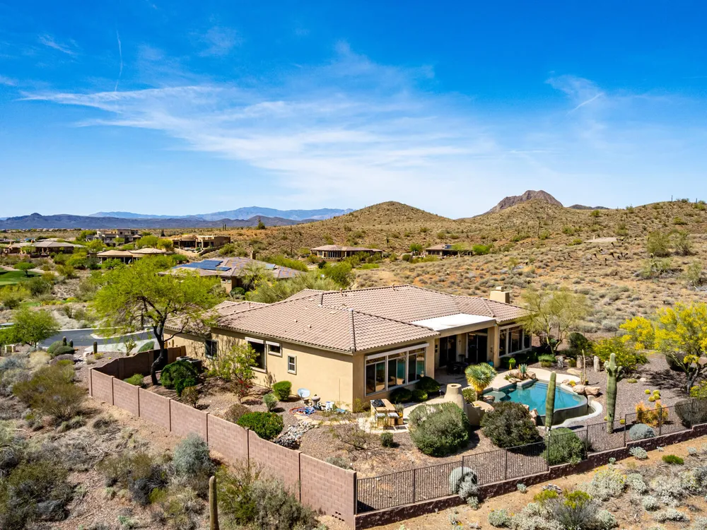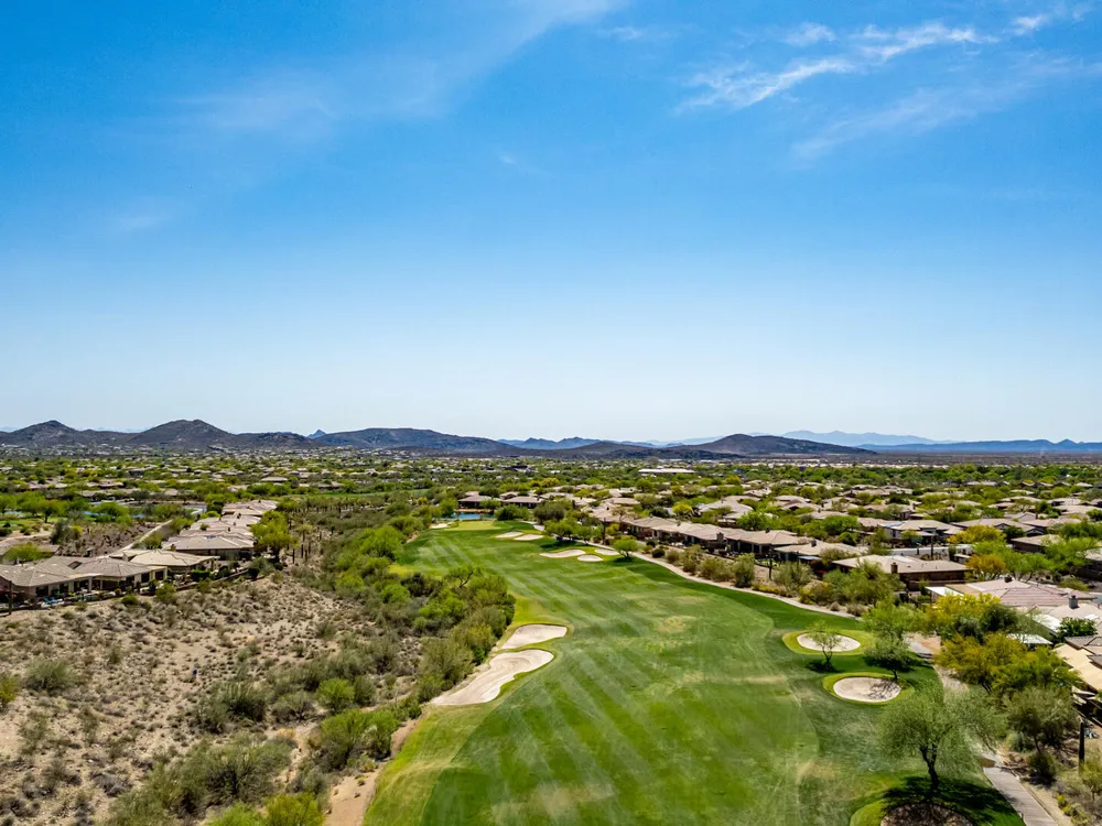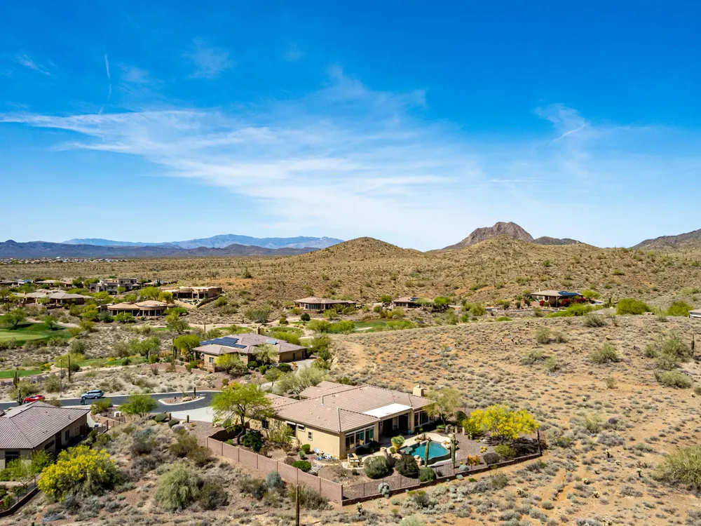 Rare Opportunity: Premier Homesite in Anthem Country Club with Unrivaled Views! Discover the ultimate in Anthem Country Club living at 42145 N Fairway Court. This exceptional property, owned by the original discerning buyer who had their pick of all custom homesites, occupies the coveted top-of-the-hill position at the end of a peaceful cul-de-sac within the secure guard-gated community of Anthem Country Club. Prepare to be captivated by the sweeping views encompassing the 8th and 18th golf holes and the elegant clubhouse in the distance. Enjoy unobstructed vistas in every direction, as this unique lot offers the ultimate in privacy with no neighboring homes on either side. Situated on a generous lot just under an acre, the custom-designed home features a stunning infinity-edge pool and meticulously crafted interiors. Highlights include rich mesquite wood flooring, custom cabinetry, convenient automatic window coverings and shades, and the luxury of en suite bathrooms for each bedroom. This is more than a home; it's a lifestyle.