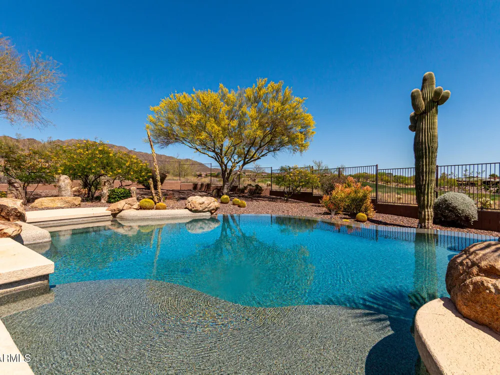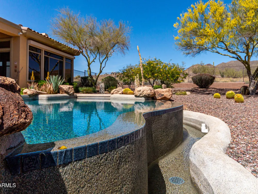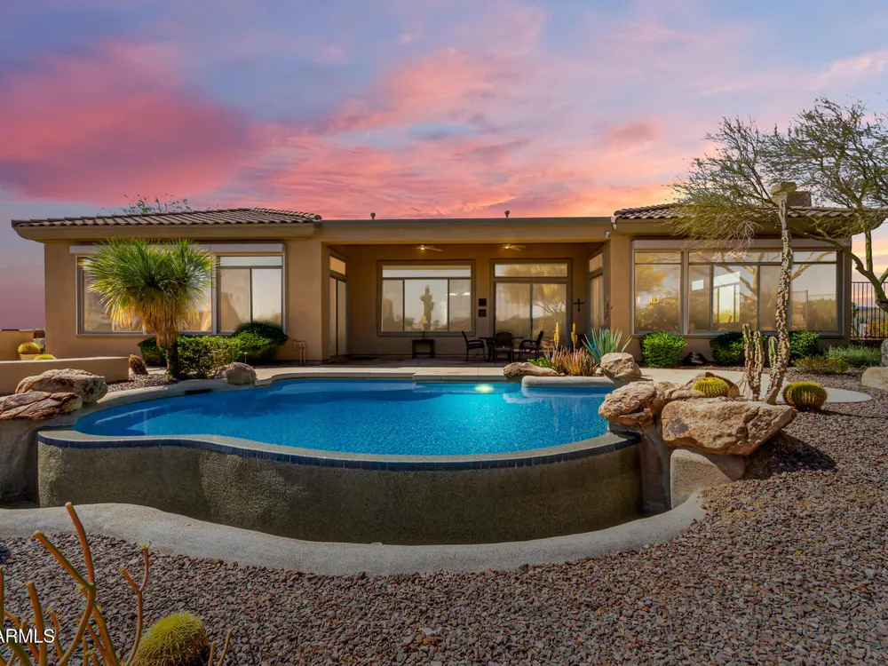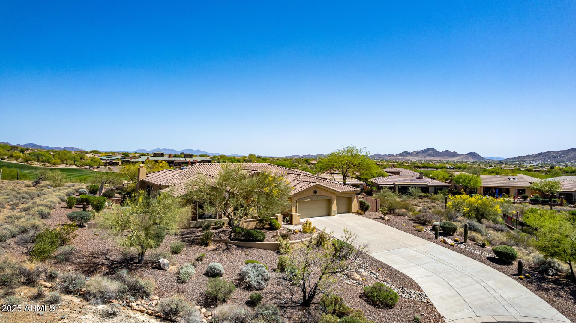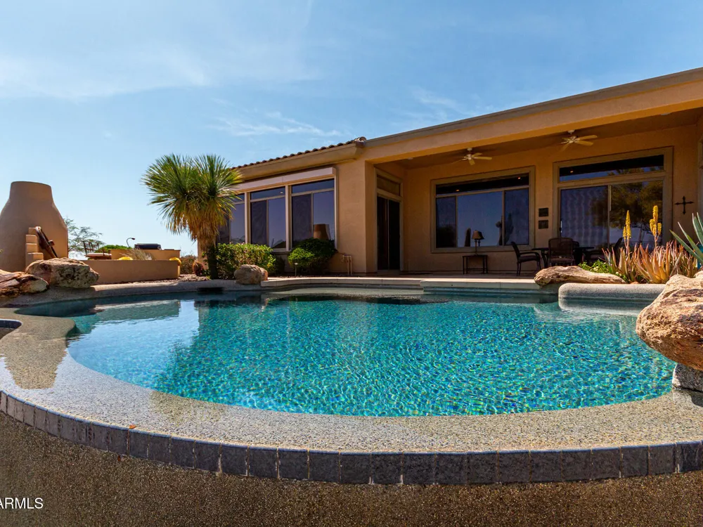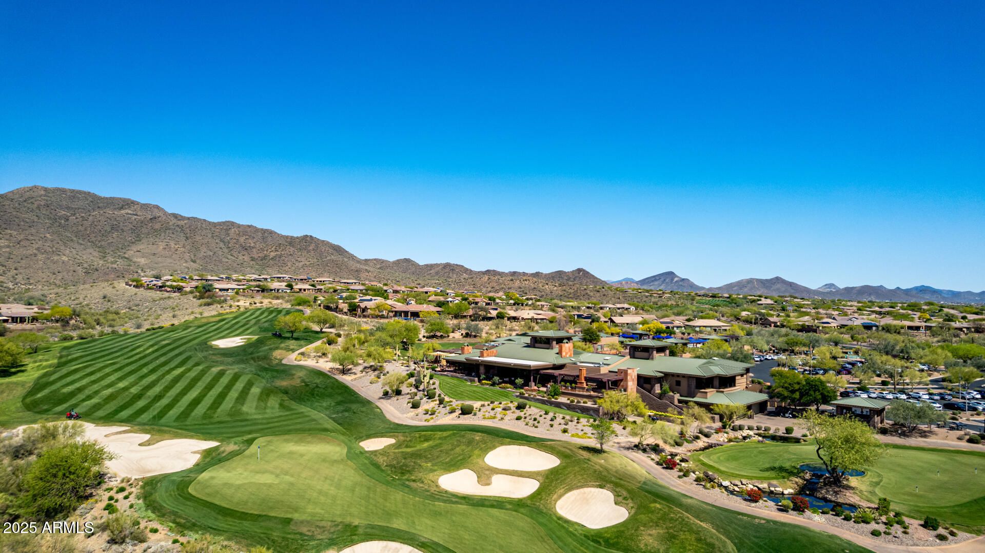 Rare Opportunity: Premier Homesite in Anthem Country Club with Unrivaled Views! Discover the ultimate in Anthem Country Club living at 42145 N Fairway Court. This exceptional property, owned by the original discerning buyer who had their pick of all custom homesites, occupies the coveted top-of-the-hill position at the end of a peaceful cul-de-sac within the secure guard-gated community of Anthem Country Club. Prepare to be captivated by the sweeping views encompassing the 8th and 18th golf holes and the elegant clubhouse in the distance. Enjoy unobstructed vistas in every direction, as this unique lot offers the ultimate in privacy with no neighboring homes on either side. Situated on a generous lot just under an acre, the custom-designed home features a stunning infinity-edge pool and meticulously crafted interiors. Highlights include rich mesquite wood flooring, custom cabinetry, convenient automatic window coverings and shades, and the luxury of en suite bathrooms for each bedroom. This is more than a home; it's a lifestyle.