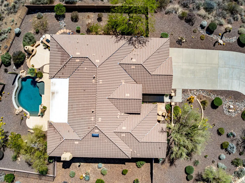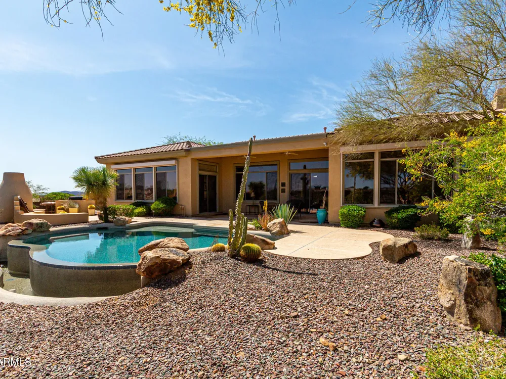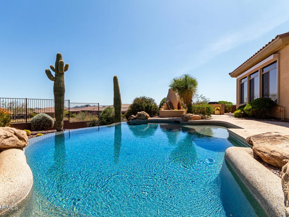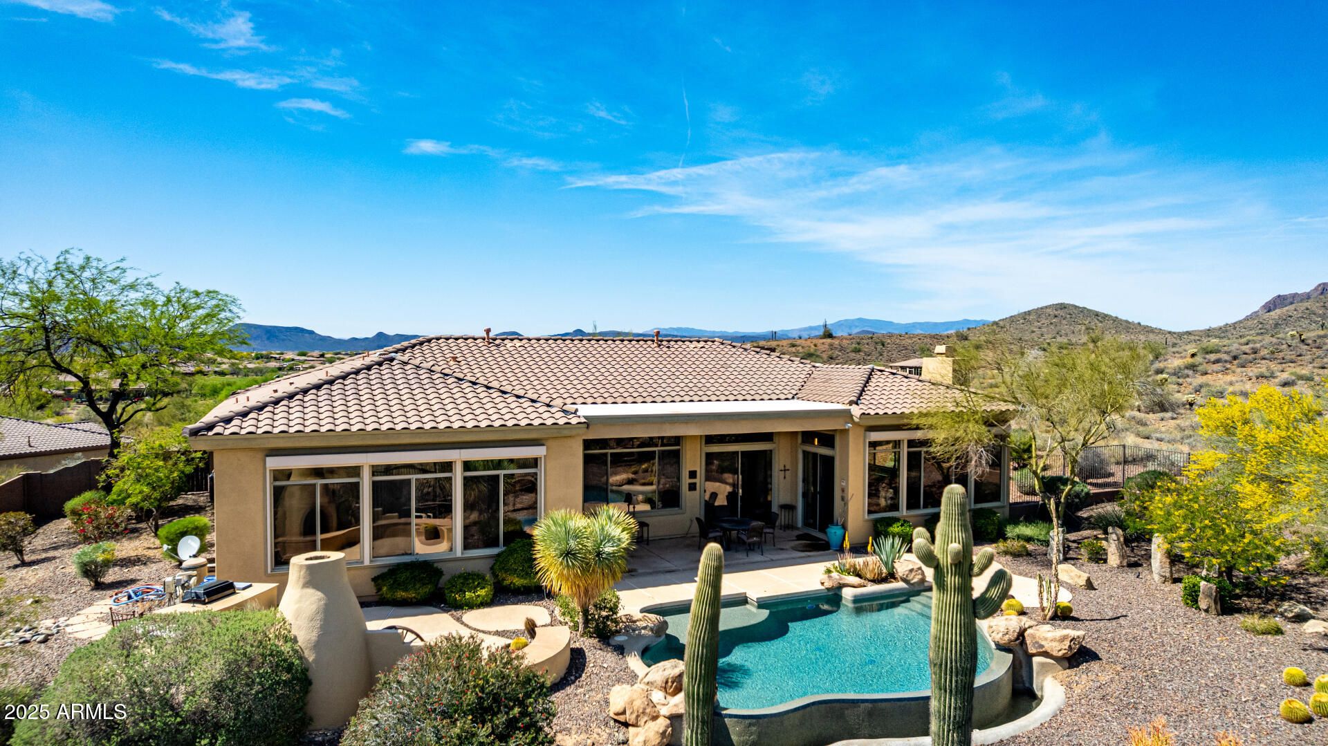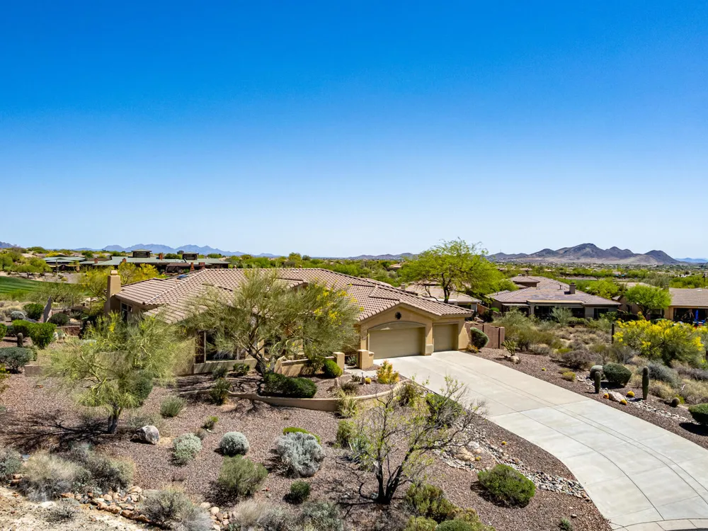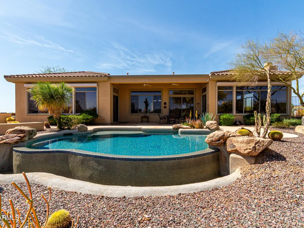 Rare Opportunity: Premier Homesite in Anthem Country Club with Unrivaled Views! Discover the ultimate in Anthem Country Club living at 42145 N Fairway Court. This exceptional property, owned by the original discerning buyer who had their pick of all custom homesites, occupies the coveted top-of-the-hill position at the end of a peaceful cul-de-sac within the secure guard-gated community of Anthem Country Club. Prepare to be captivated by the sweeping views encompassing the 8th and 18th golf holes and the elegant clubhouse in the distance. Enjoy unobstructed vistas in every direction, as this unique lot offers the ultimate in privacy with no neighboring homes on either side. Situated on a generous lot just under an acre, the custom-designed home features a stunning infinity-edge pool and meticulously crafted interiors. Highlights include rich mesquite wood flooring, custom cabinetry, convenient automatic window coverings and shades, and the luxury of en suite bathrooms for each bedroom. This is more than a home; it's a lifestyle.
