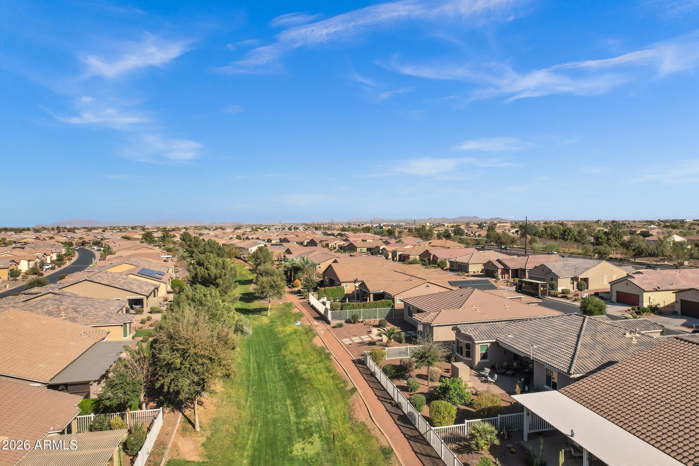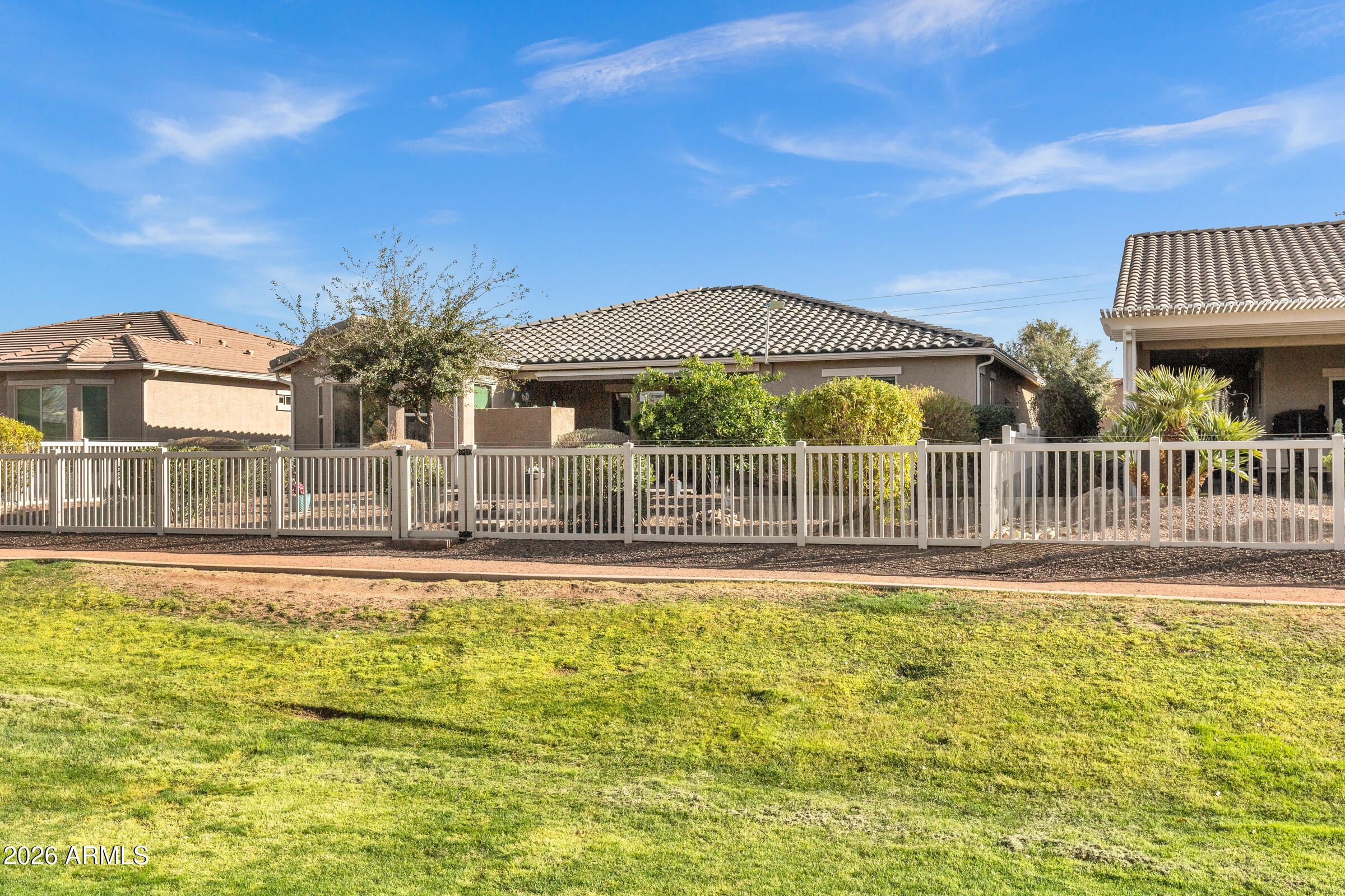 Outdoor living at its finest! Situated on a spectacular greenbelt homesite, this home features an extended paver patio designed for year-round enjoyment, complete with a remote-controlled sunshade for warm Arizona days and a cozy gas fireplace for cool winter evenings. A charming front courtyard provides the perfect setting to relax and socialize with neighbors. Inside, the gourmet kitchen showcases staggered cherry cabinetry, stunning granite countertops, stainless steel appliances, gas cooking, and double ovens. The great room boasts soaring 12' ceilings and elegant 12''x24'' tile throughout, with carpet only in the bedrooms and den. Top-of-the-line HVAC system installed in 2022 includes a 10-year warranty and maintenance agreement for added peace of mind. Upgraded lighting, plumbing fixtures, and custom designer paint create a stylish, move-in-ready interior. Additional features include: pull outs at lower kitchen cabinets, walk in pantry, 2' garage extension with overhead storage, workbench, insulated garage door, attic storage and utility sink. RO for drinking water, soft water and whole house water filtration system, double doors at the den with a transom window, bay window at the primary bedroom, built in cabinets at the laundry room, fenced backyard with a gate to the greenbelt, gas line in the backyard for a BBQ and mature landscaping. START LIVING THE GOOD LIFE! Furniture is available on a separate bill of sale.